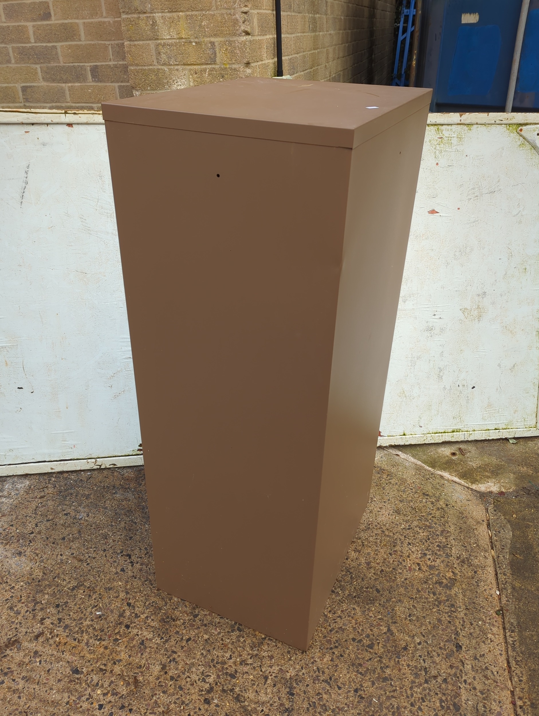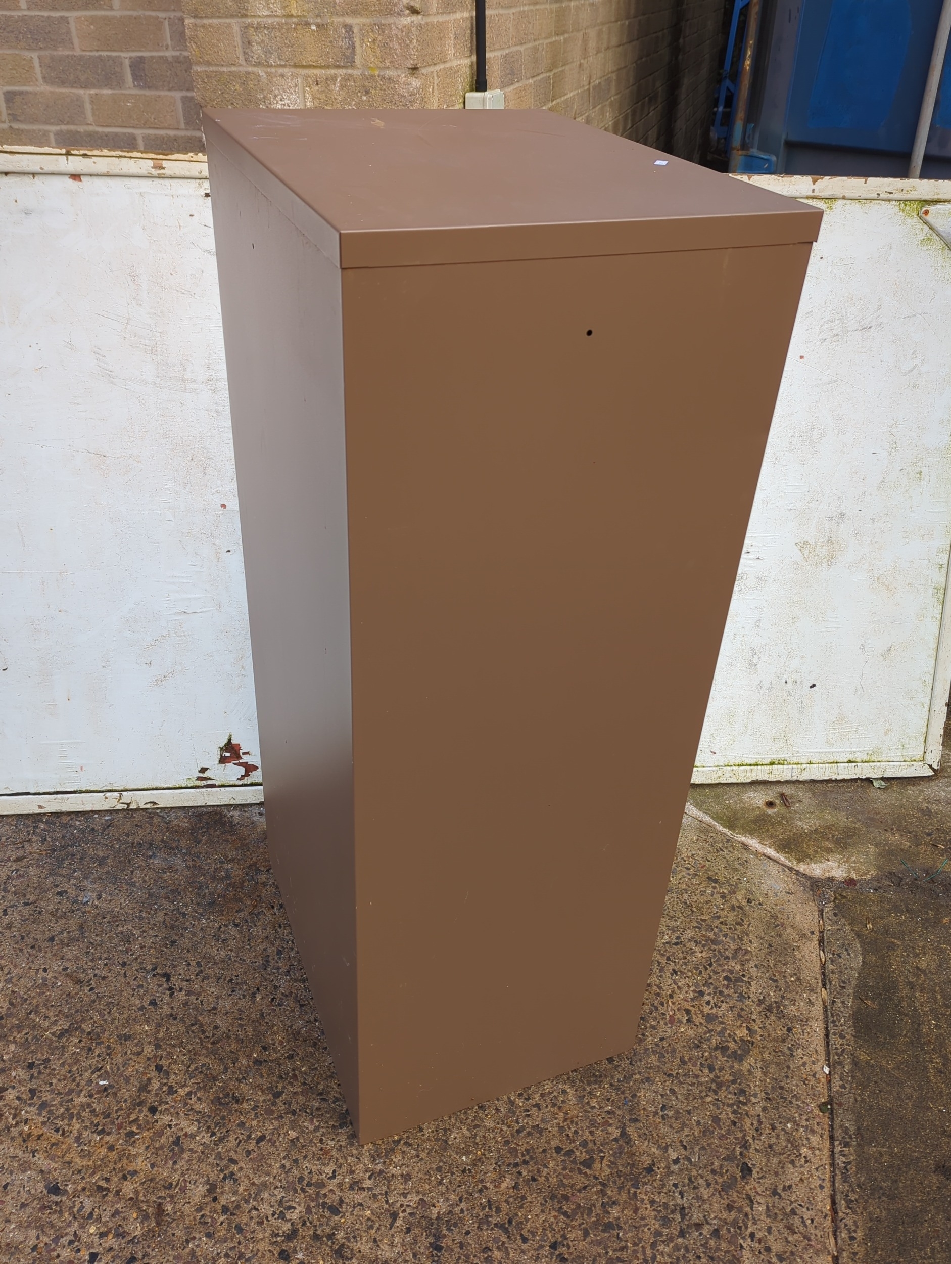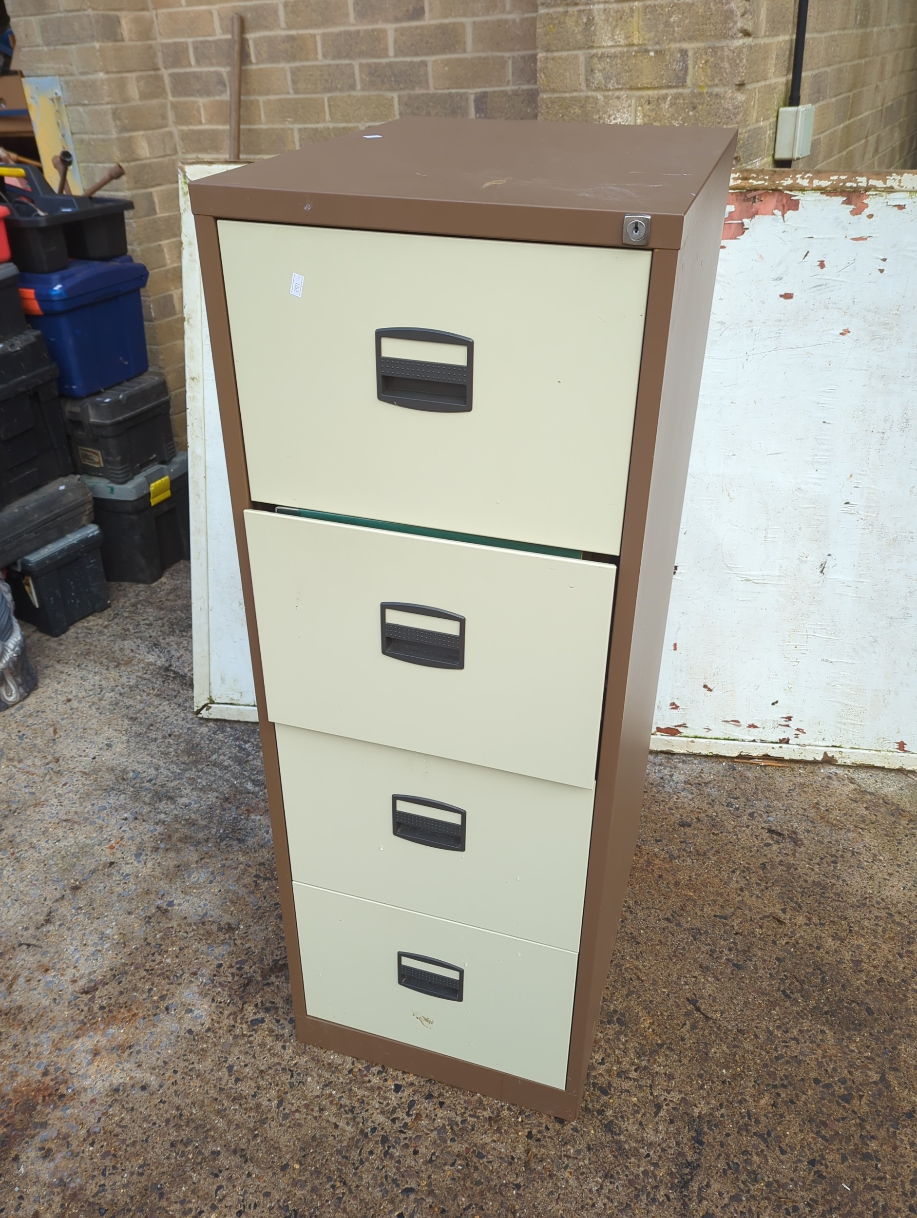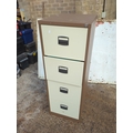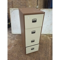 This is a sturdy metal four-drawer filing cabinet with a brown exterior and beige drawer fronts. The cabinet is equipped with large handles for easy access and is shown containing standard folders and files. This practical piece is ideal for office or home use, providing ample storage for all your documents and paperwork.