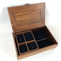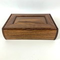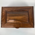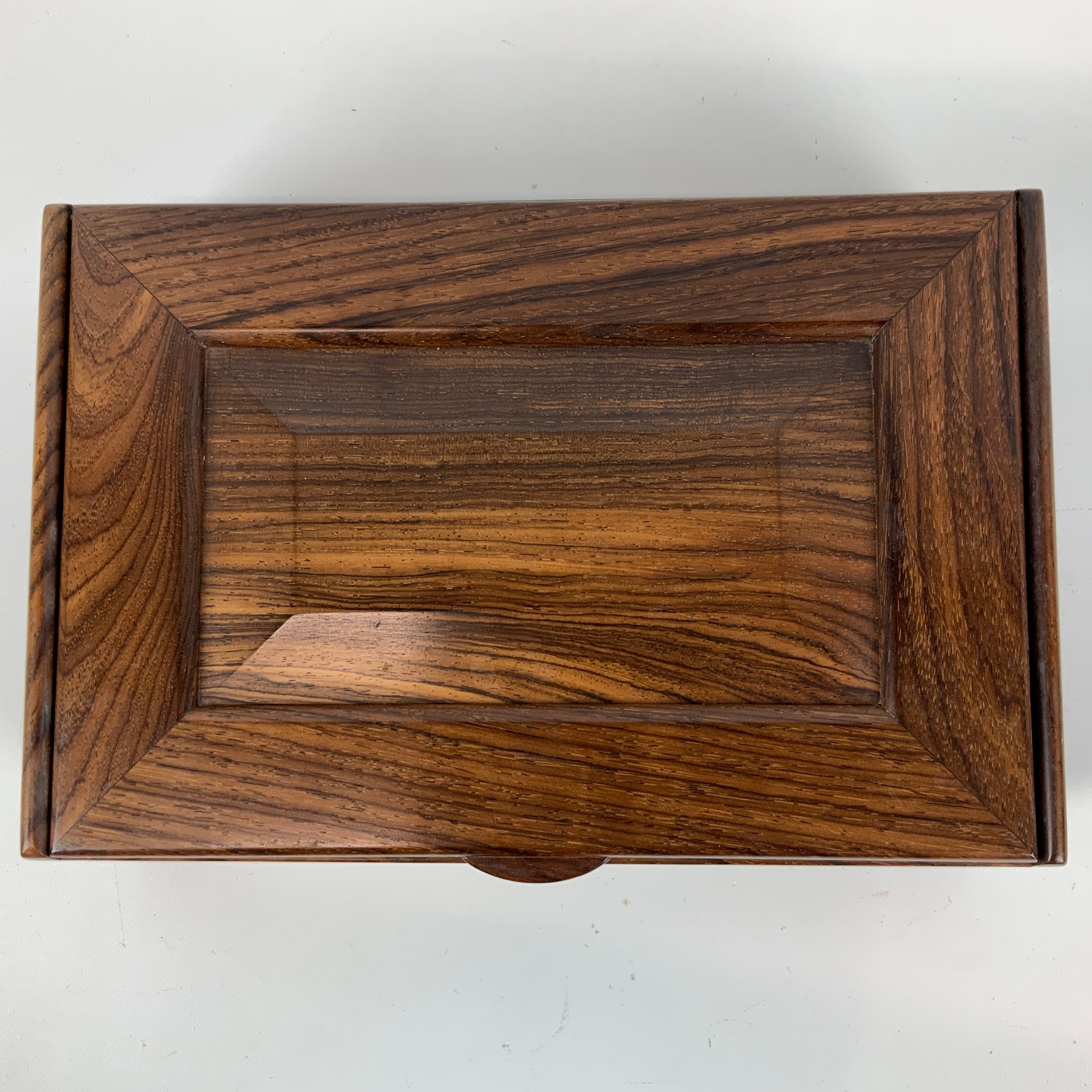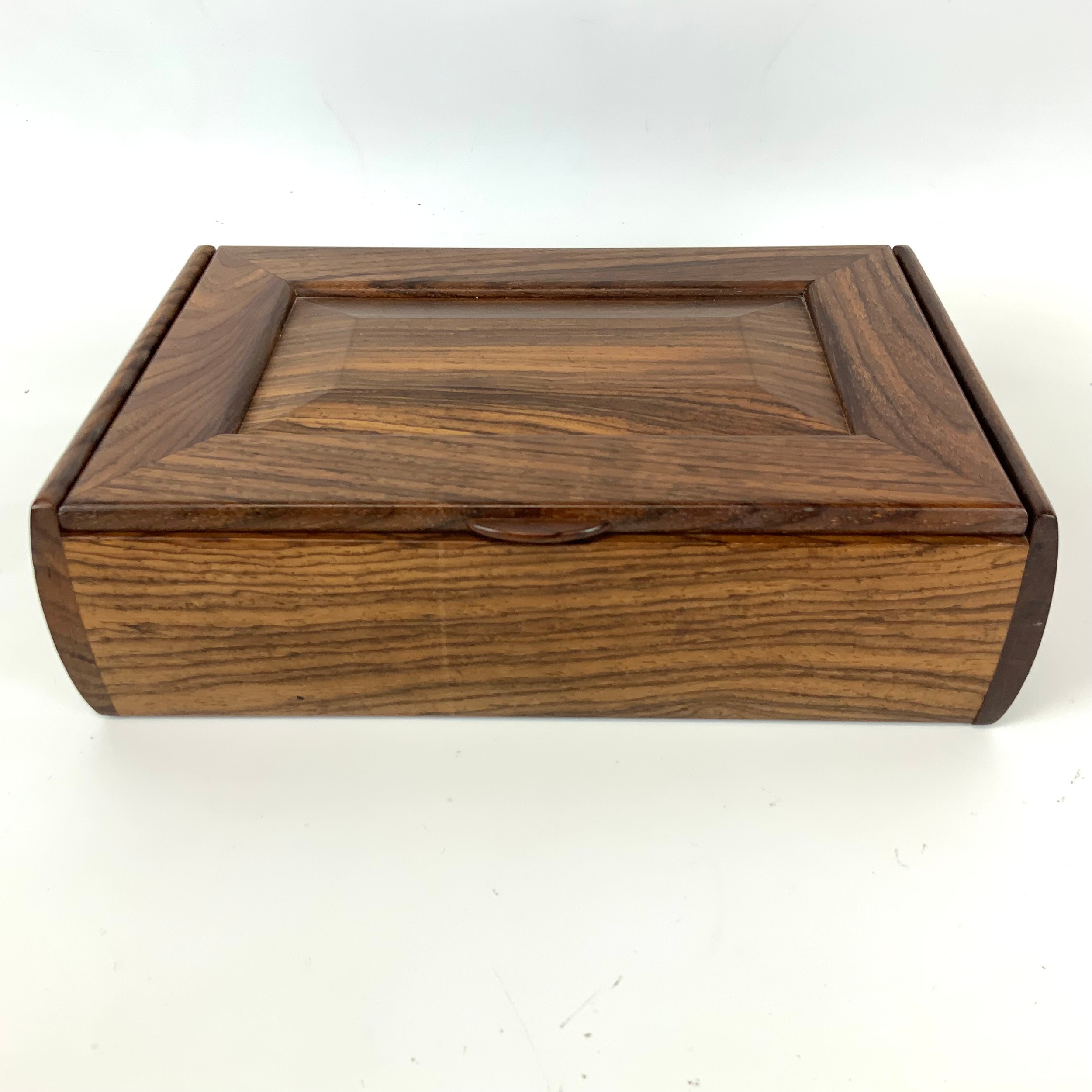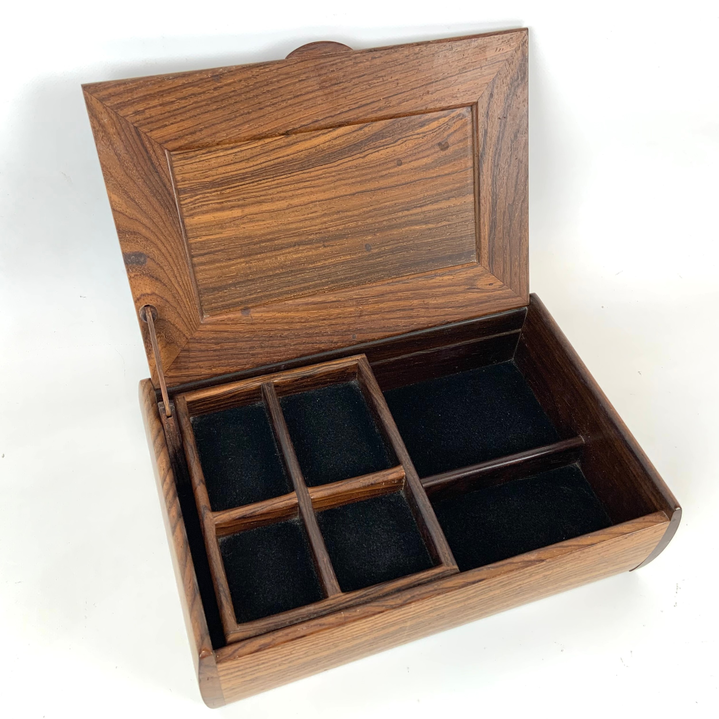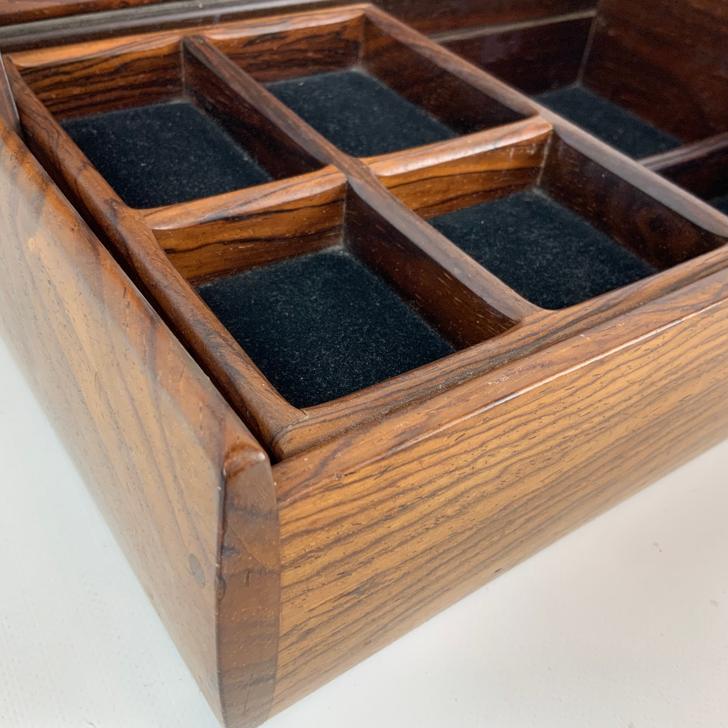A mid-century/vintage rosewood jewellery box, velvet-lined with a single movable shelf and hinged top, H7cm x W26.5cm, D7cm.