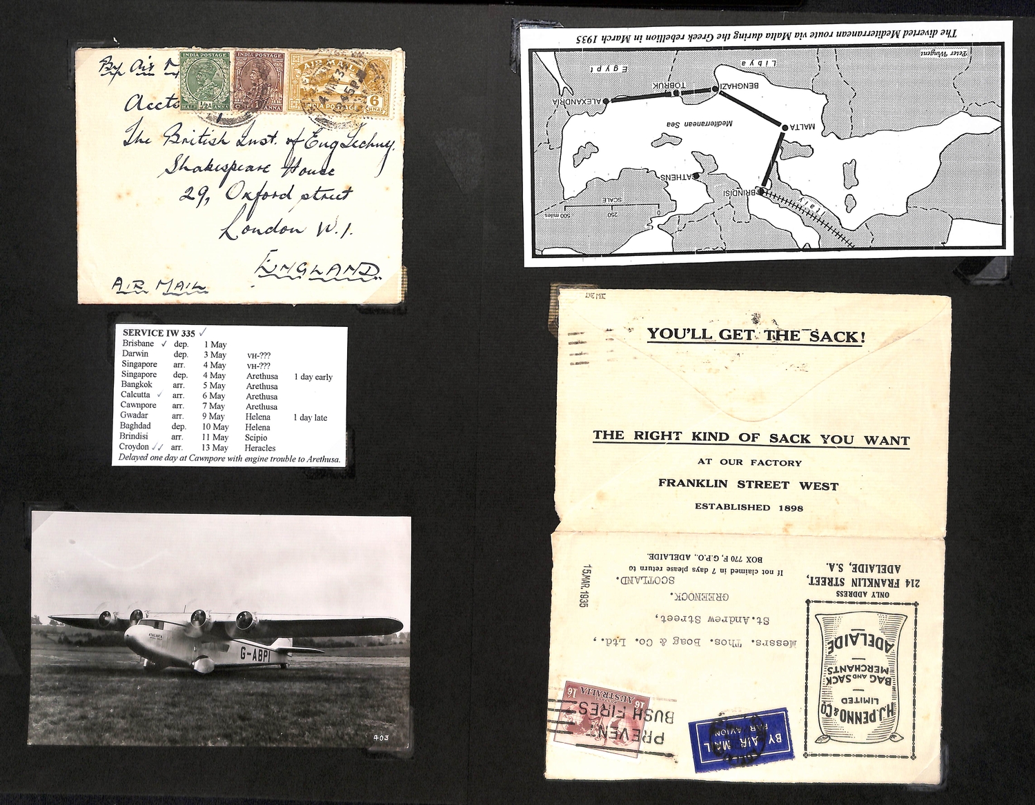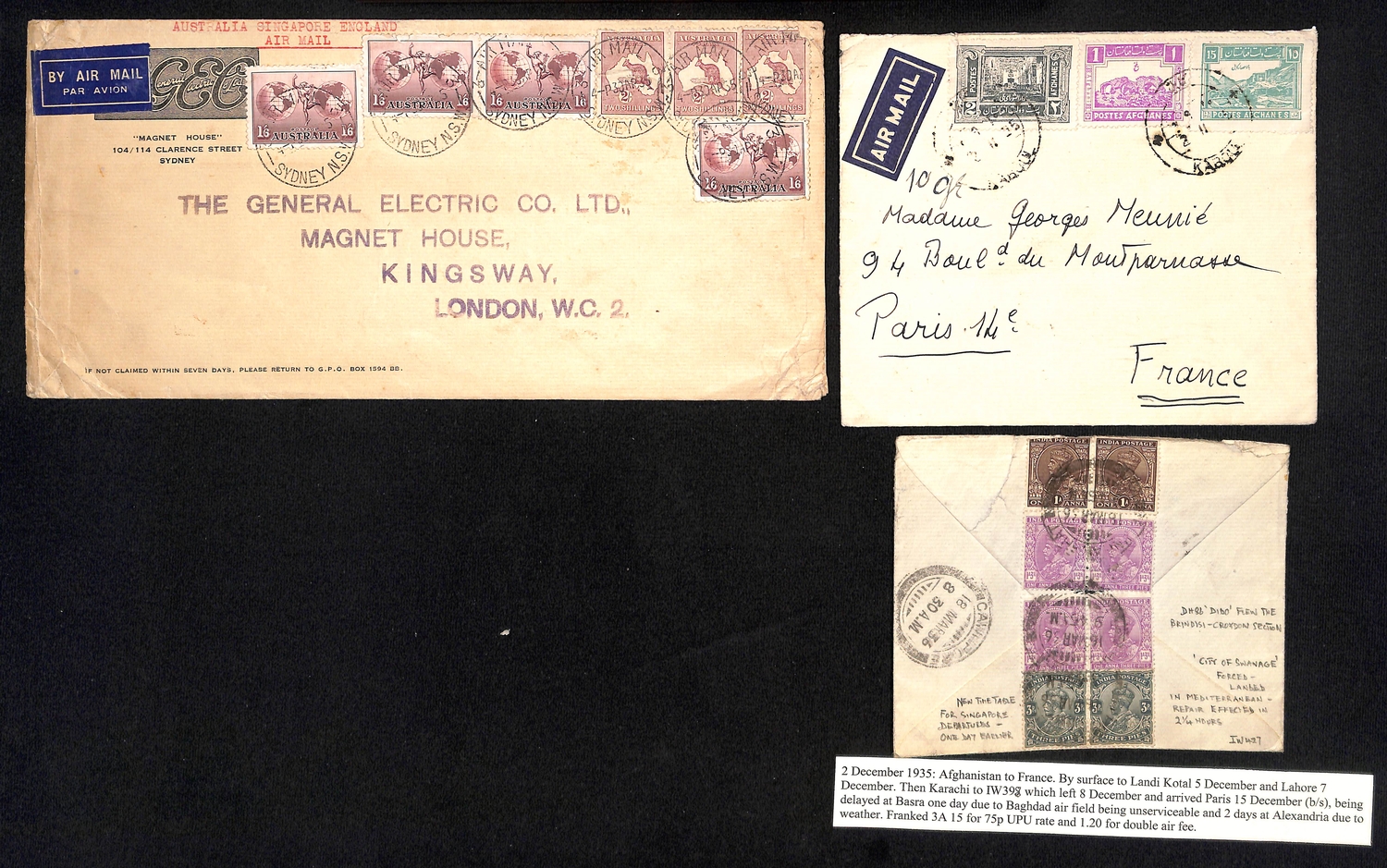 1935-36 Imperial Airways covers all delayed en route, comprising 1935 (Apr 30) cover from Sydney franked 12/- and May 4th cover from India both delayed at Cawnpore (IW335); 1935 (Dec 2) cover from Afghanistan to France delayed at Basra and Alexandria (IW398); 1936 (Mar 16) cover from India delayed by forced landing in Mediterranean (IW427); also 1935 cover from Australia flown via Malta due to the rebellion in Greece. (5).