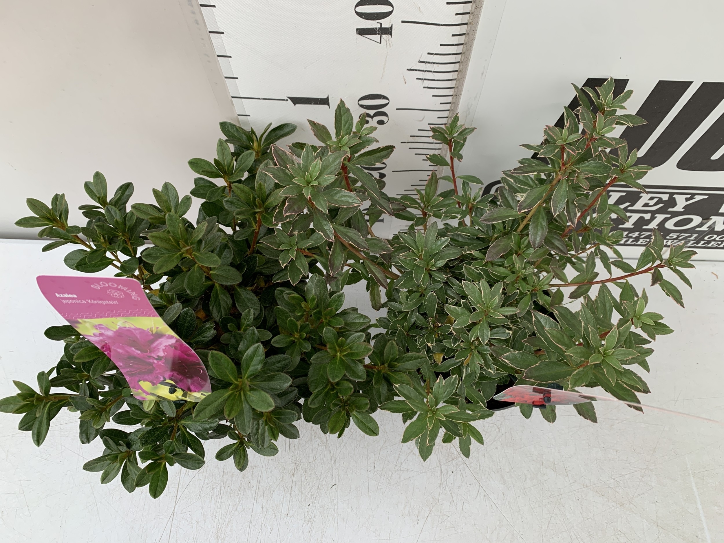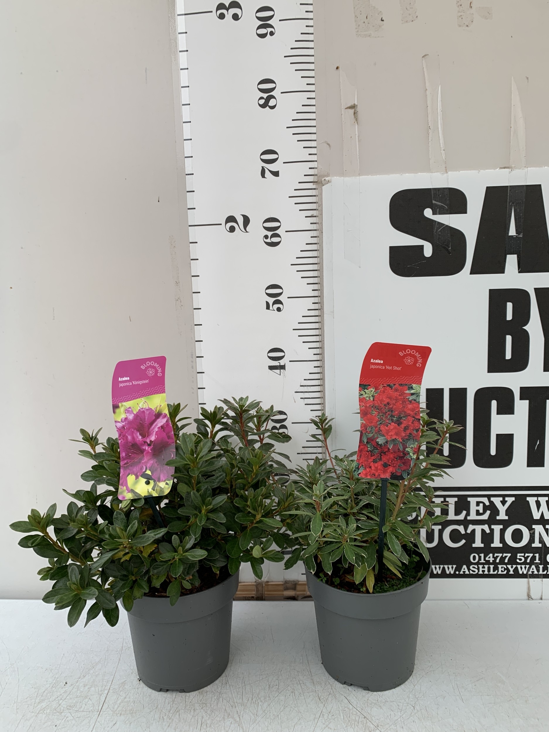 TWO VARIETIES OF AZALEA JAPONICA IN 2 LTR POTS. ONE RED 'HOT SHOT' AND PURPLE 'KONIGSTEIN' APPROX 40CM TALL, TO BE SOLD FOR THE PAIR