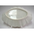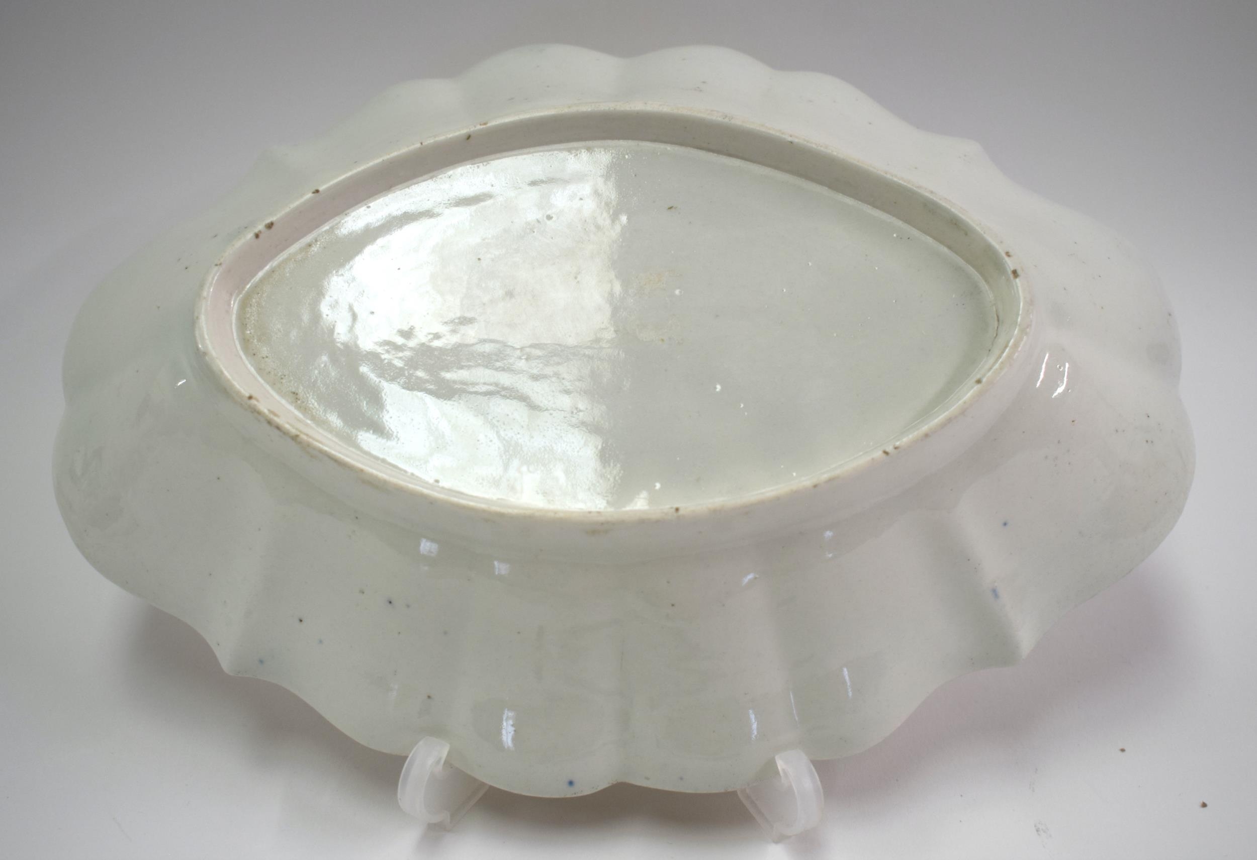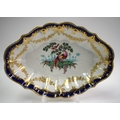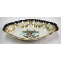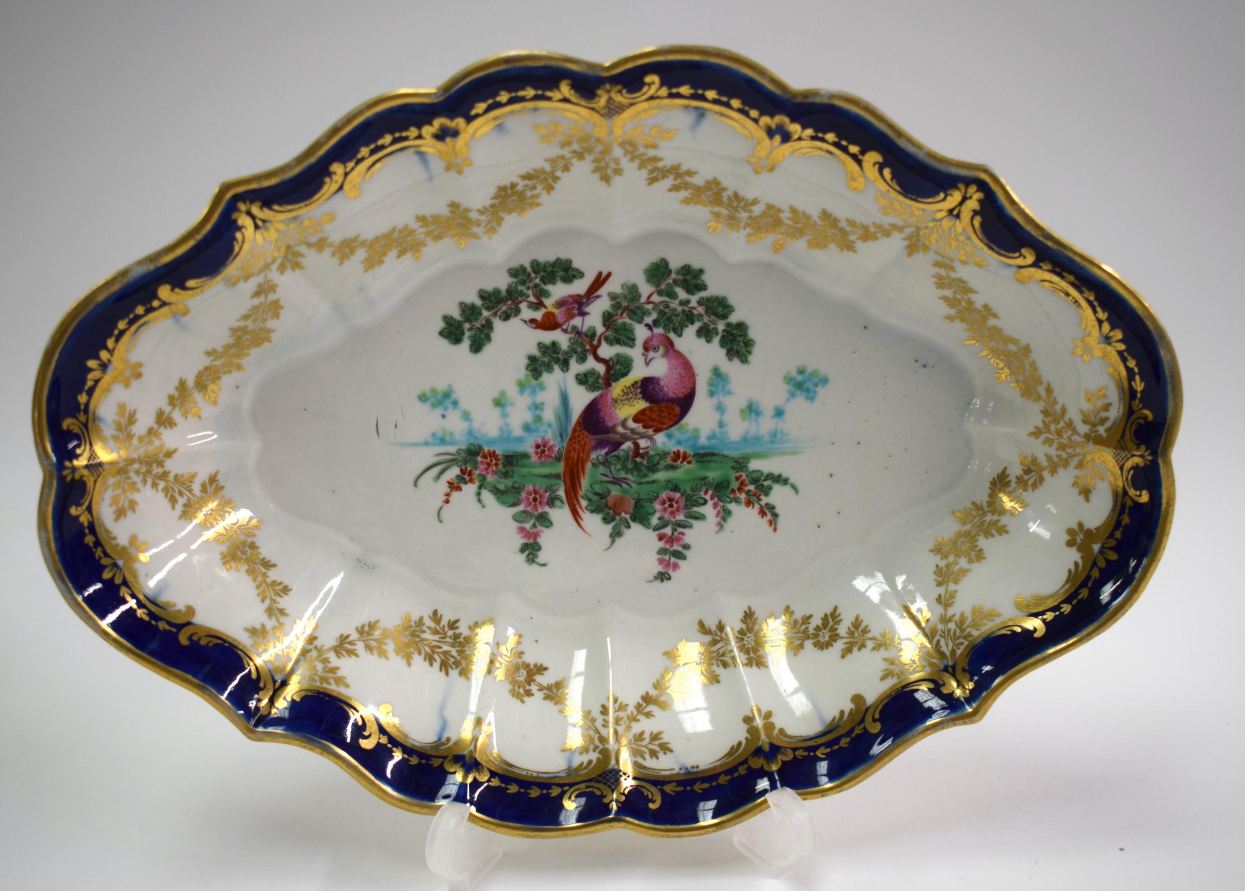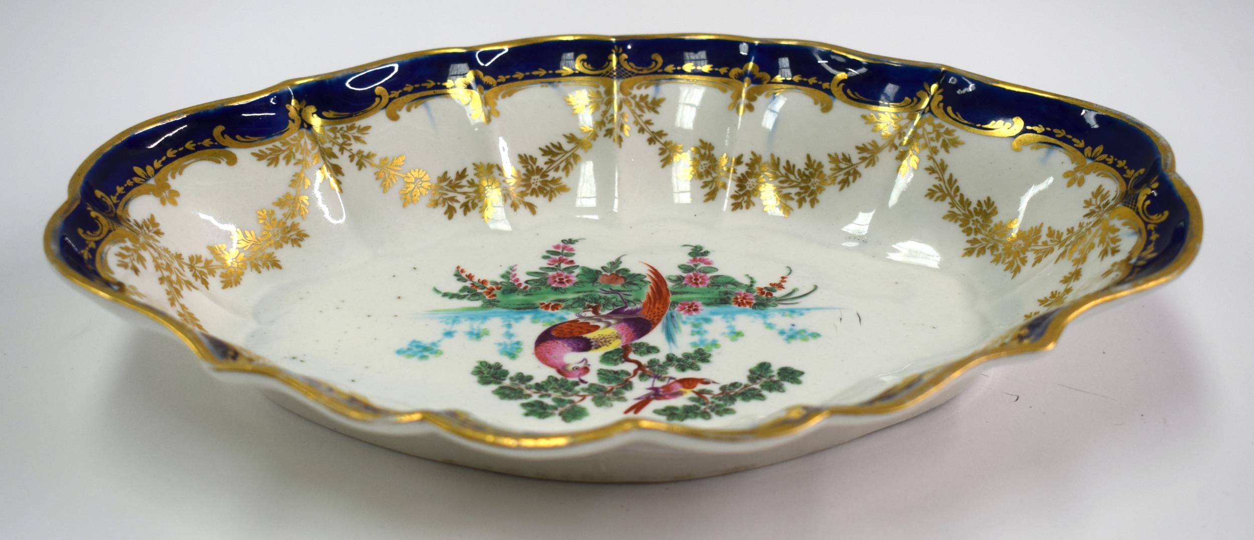 18th century scalloped oval dish painted with exotic birds in landscape surrounded by gilt pedants and a blue border. 24.5cm wide