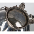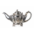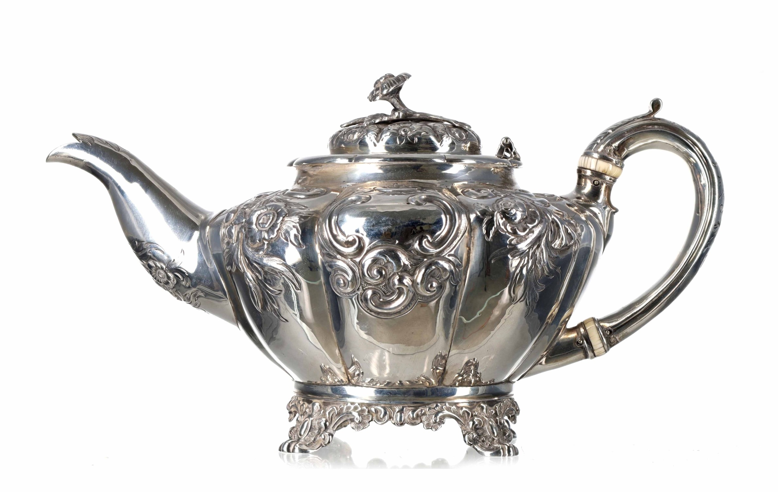 Victorian silver teapot, the hinged cover with flower stem finial, over a repousse lobed melon form body, having a leaf capped handle, raised on scroll feet, maker RD (possibly Robert Death), London 1841, 10" wide, 5" high, 15.2oz t
