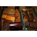 TWO TRAYS OF TREEN TO INCLUDE LIDDED STORAGE BOXES AND MUSICAL JEWELLERY BOX