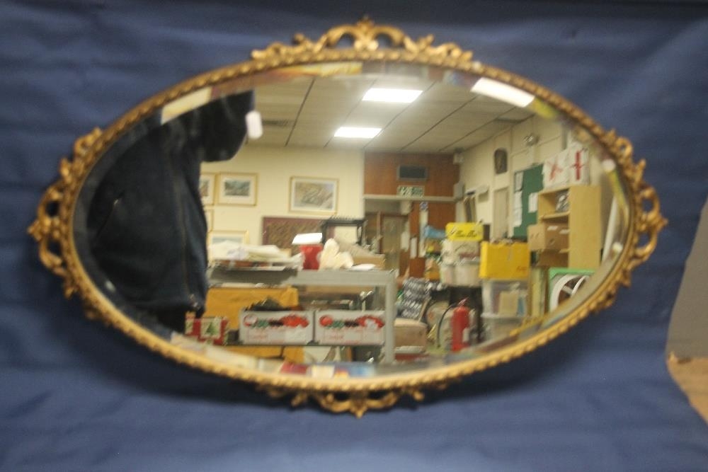 AN OVAL GILT ORNATE MIRROR 75 CM X 48 CM