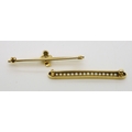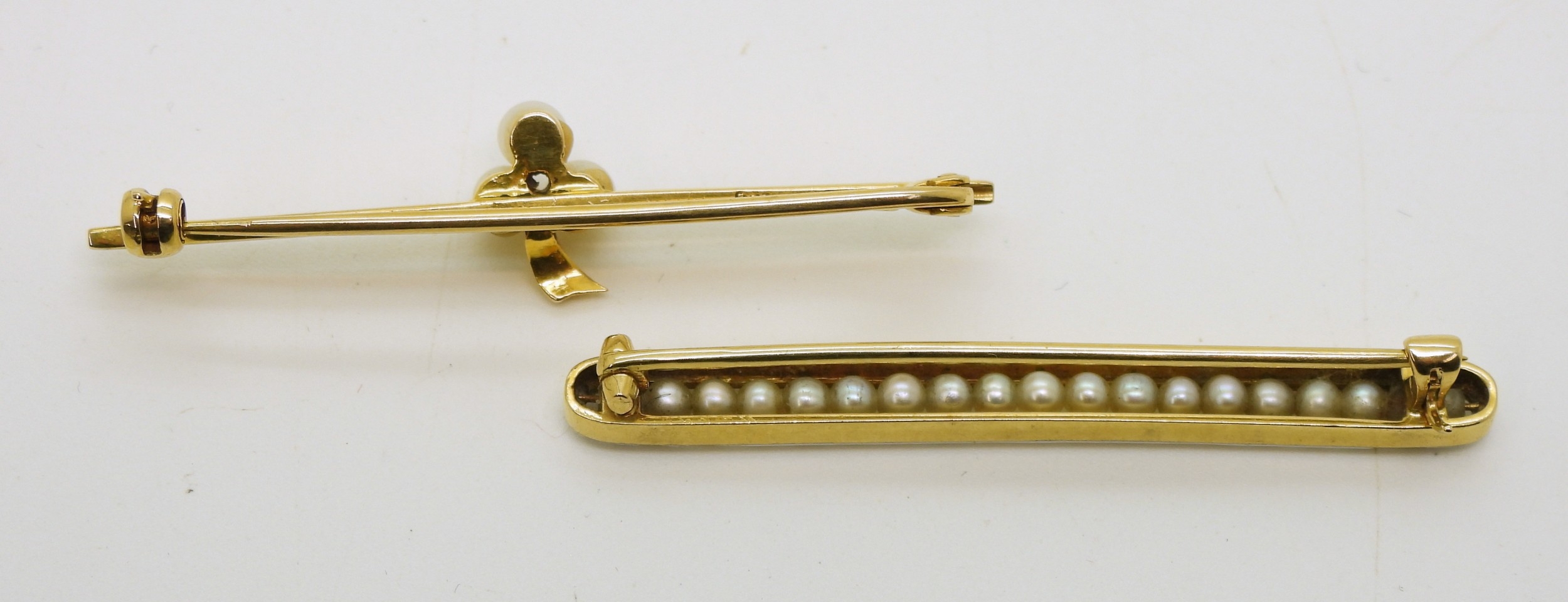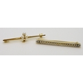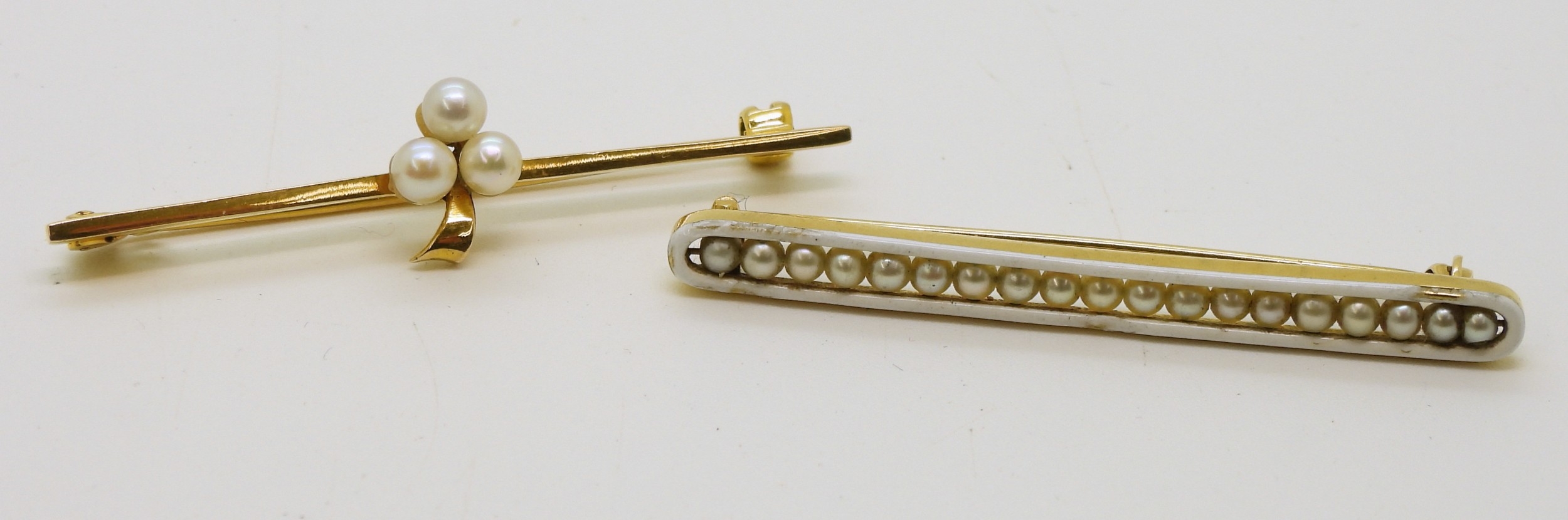 A bright yellow metal bar brooch with white enamel and set with pearls, length 5cm, weight 4gms, together with a 9ct gold brooch set with three pearls, length 4.8cm weight 2.5gms