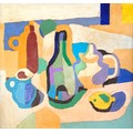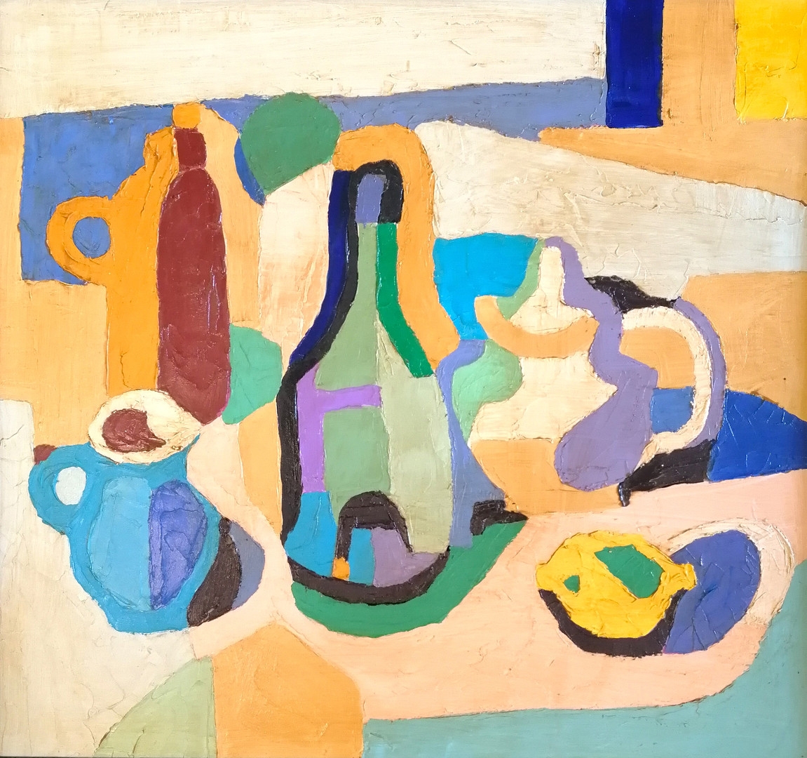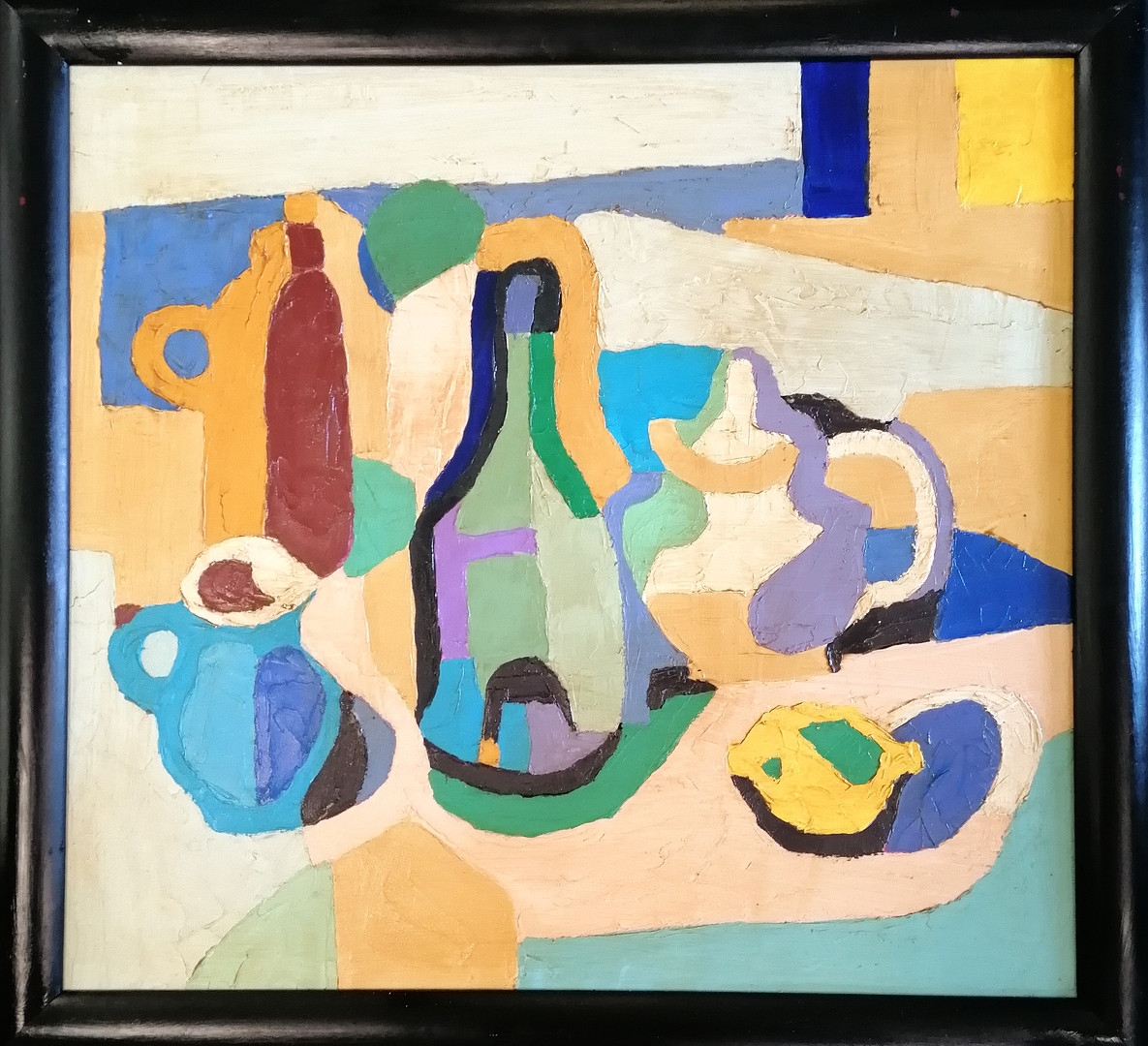 Terence Robert Wood contemporary oil painting on board of a table setting with a lemon frame 78cm x 72cm.