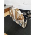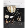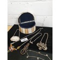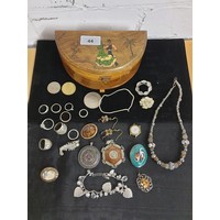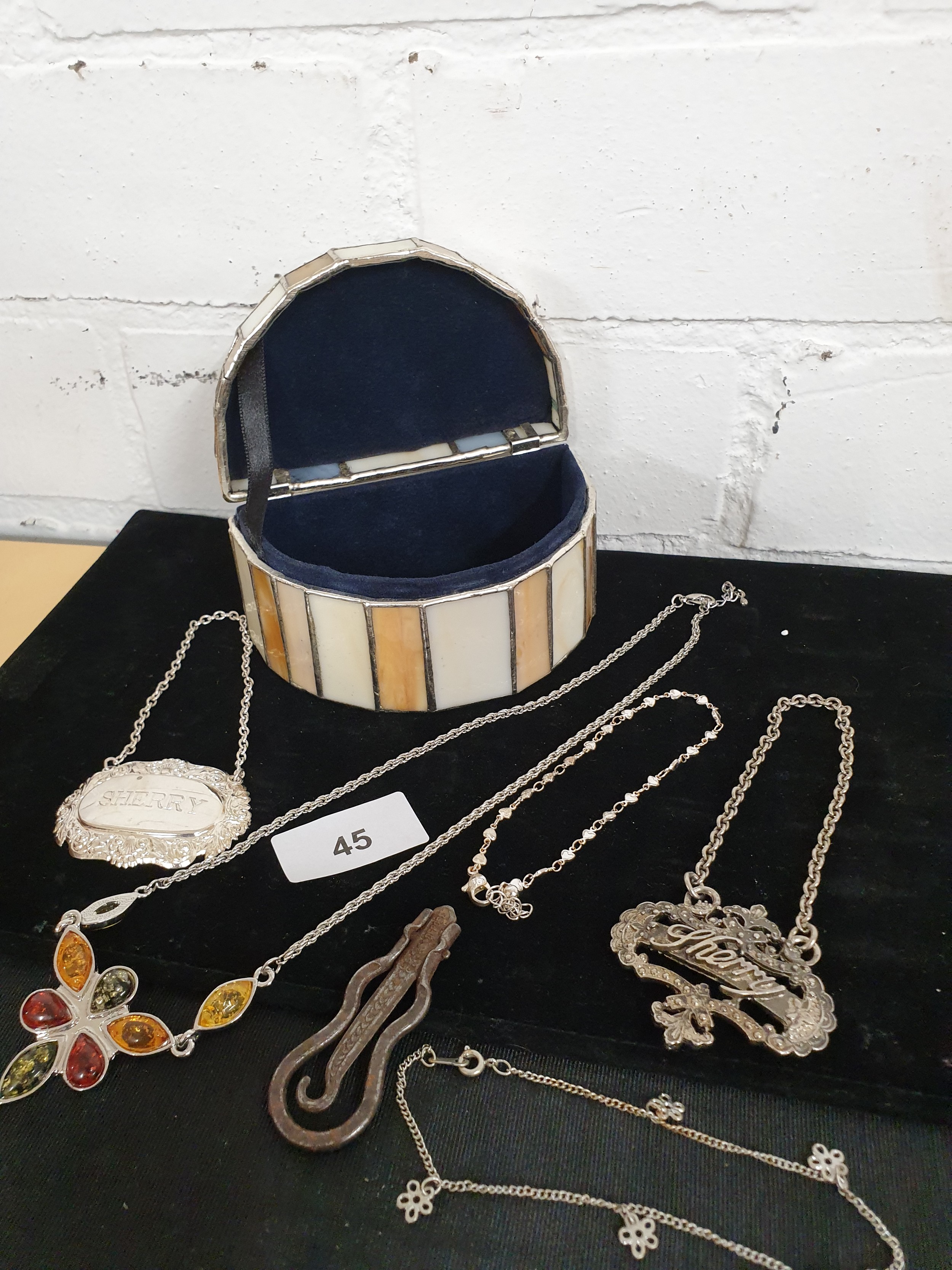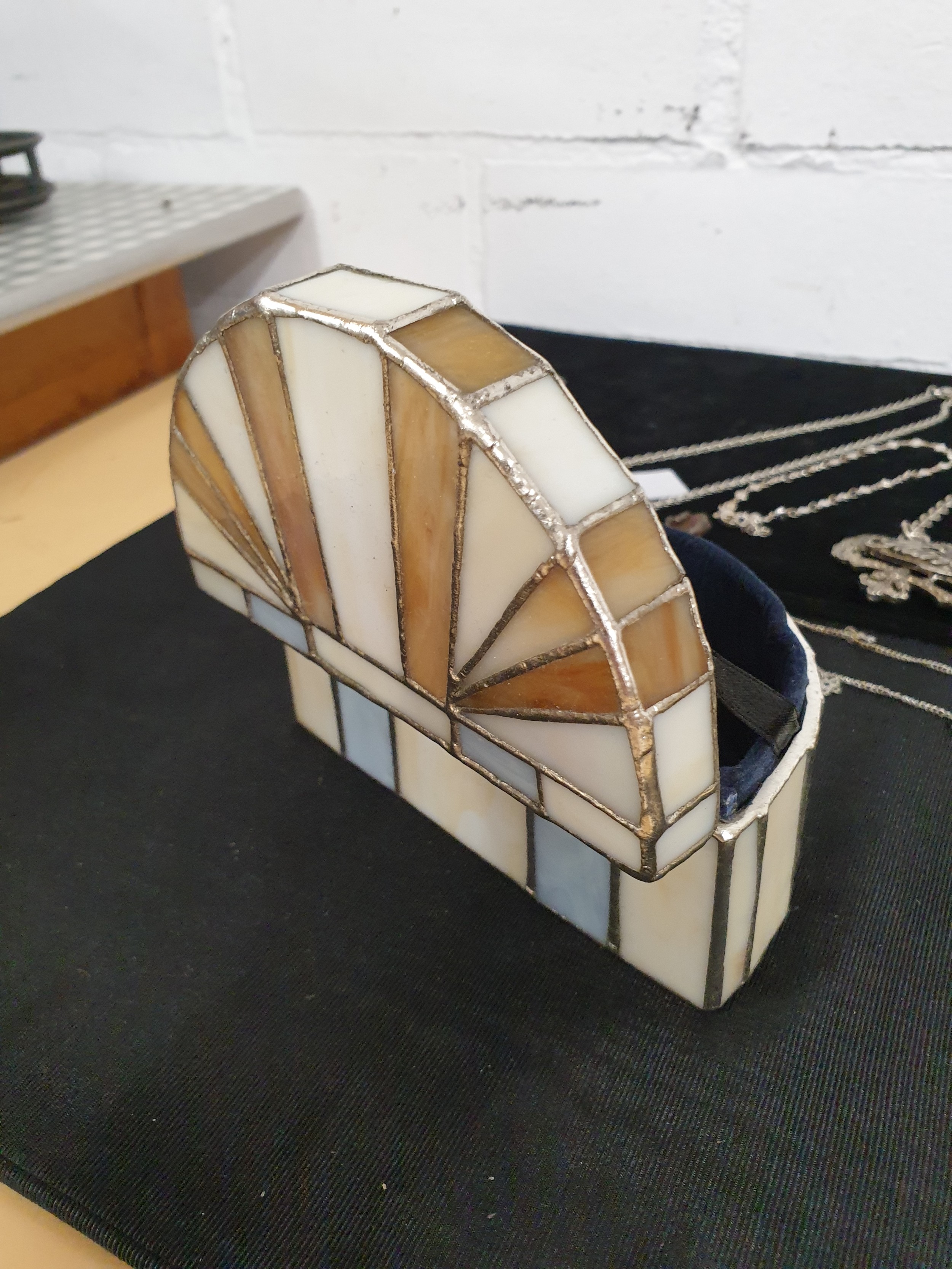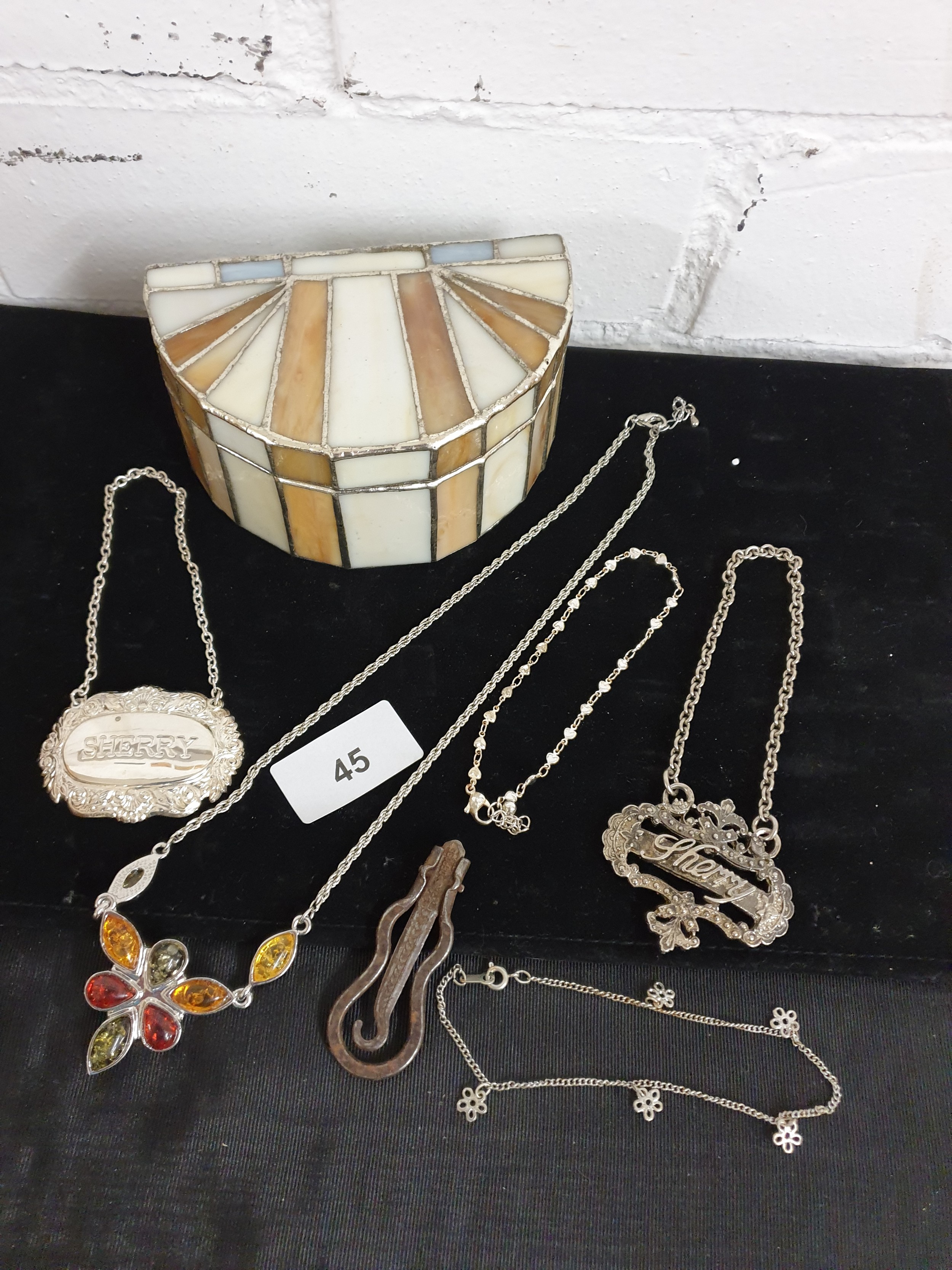 Unusual Tiffany Glass Style Jewel Box With Costume Jewellery Decanter labels Button Hook Ect