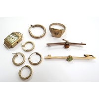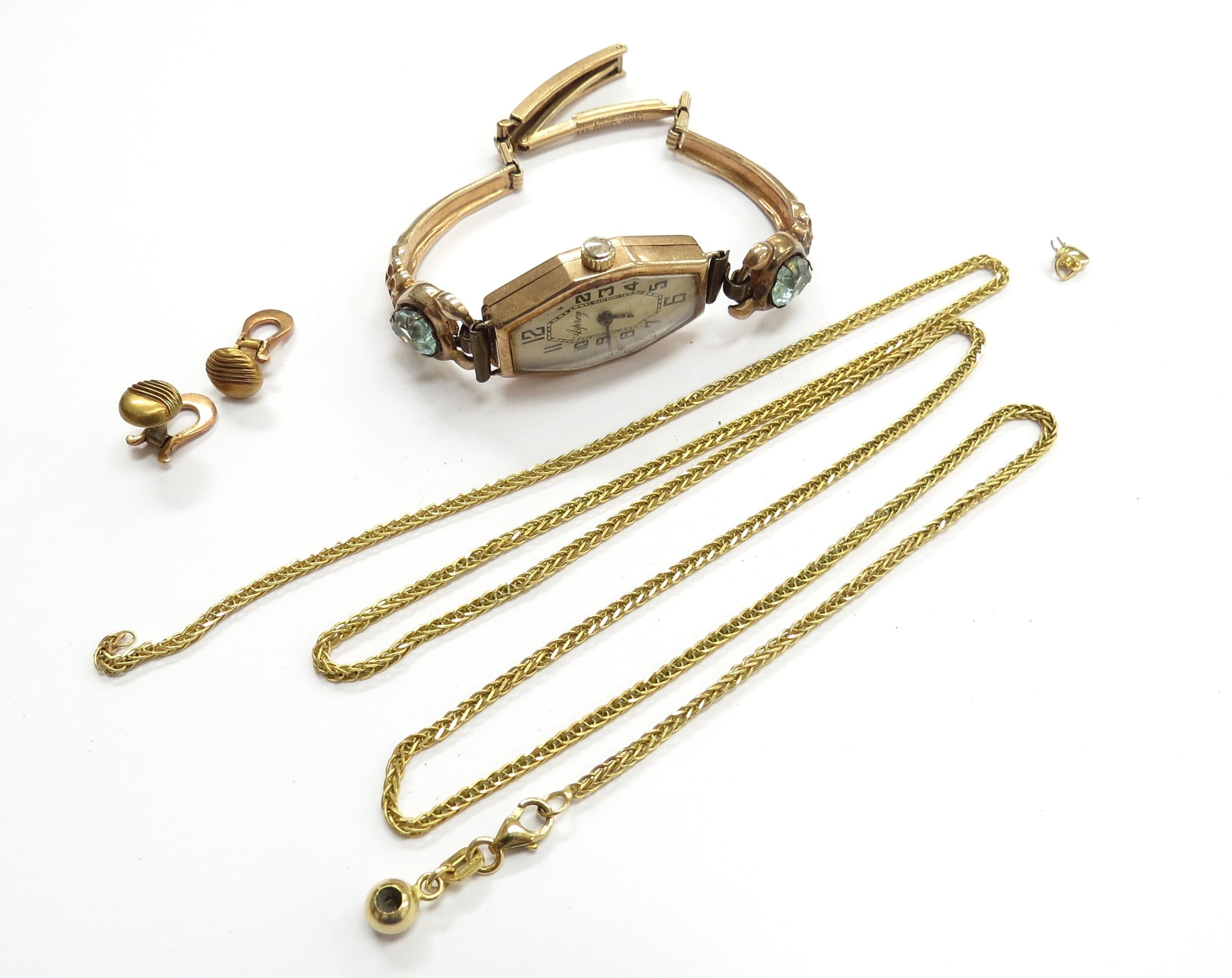 A pair of gold suds stamped 750, 2.1g an unmarked broken gold chain, 5.5g and a 9ct gold cased wristwatch, plated strap, 15.7g