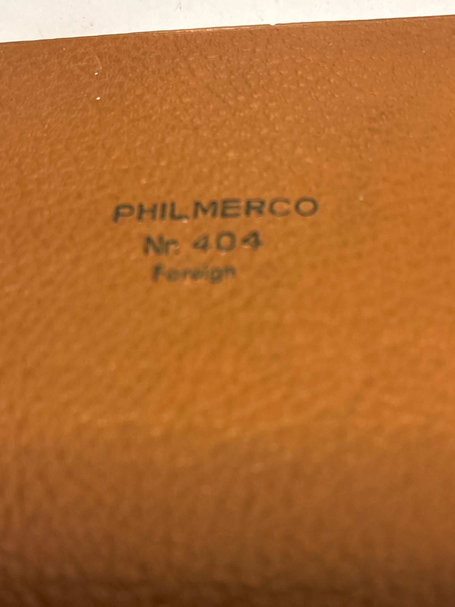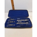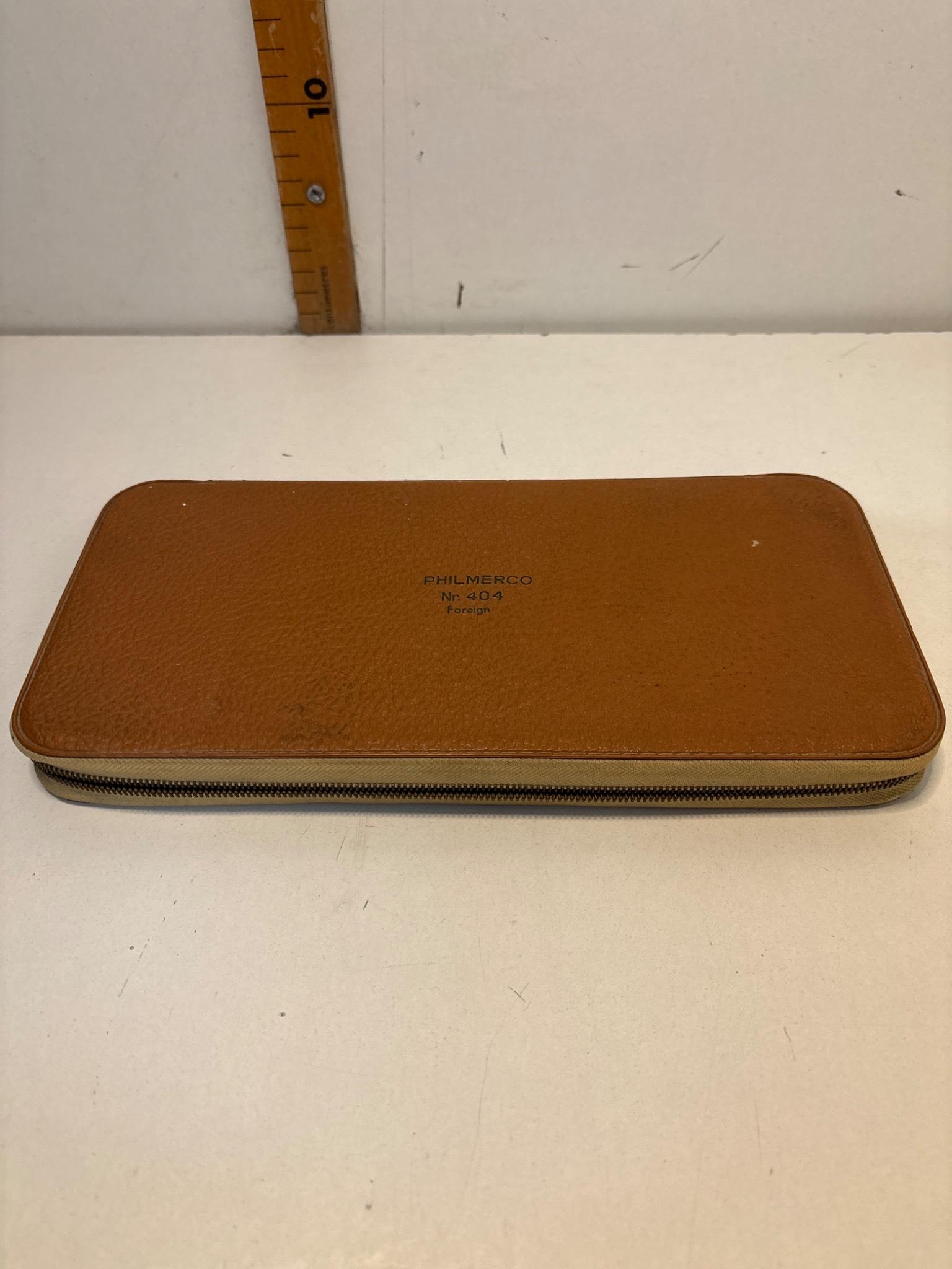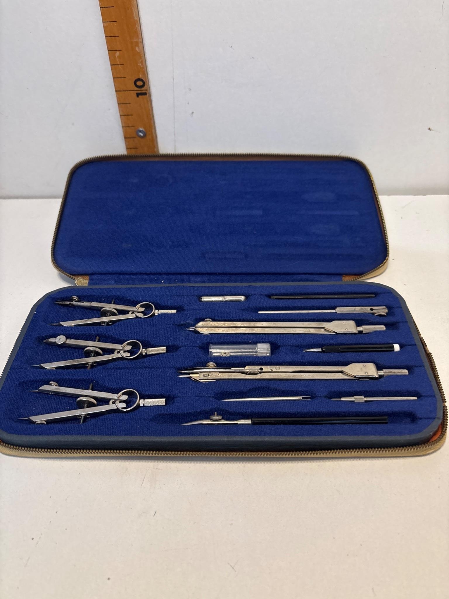 Philmerco Nr. 404 compass set in a tan zippered case, marked 'Foreign.' Includes various drafting tools on a blue interior display.