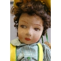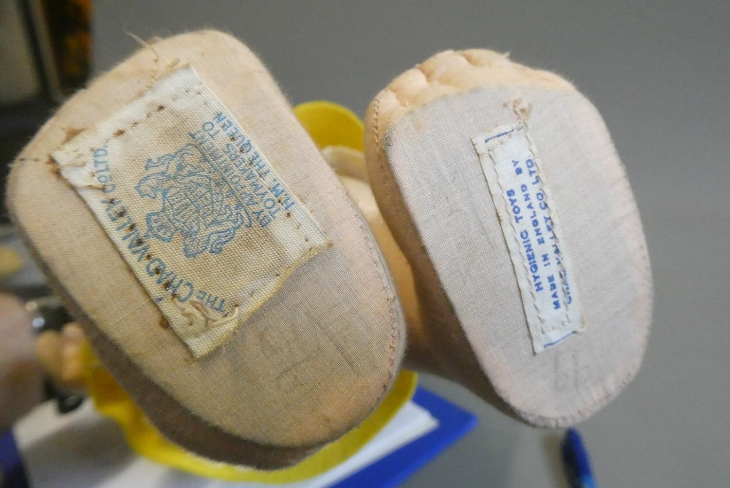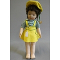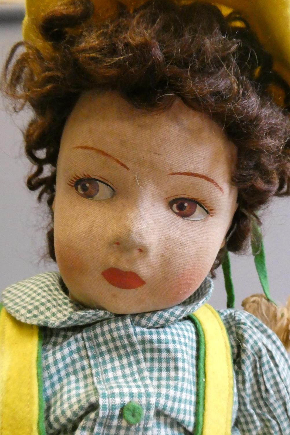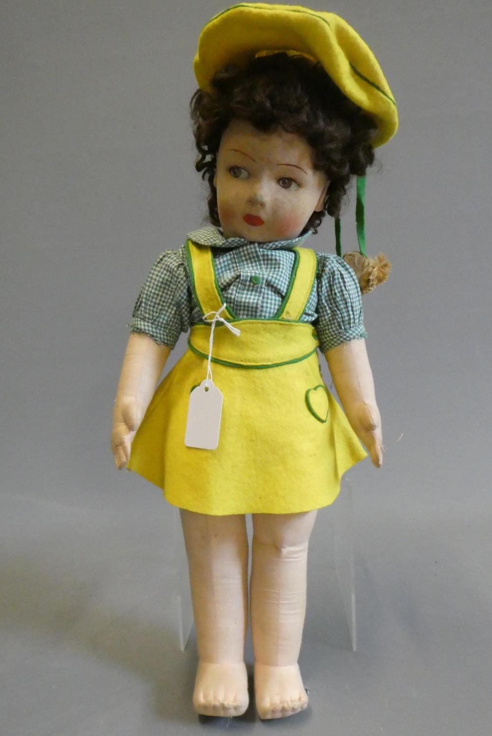 Chad Valley girl doll, of fabric construction, with sideways glancing painted eyes, shirt, felt dress, matching hat and label to foot, 18 1/2" tall