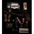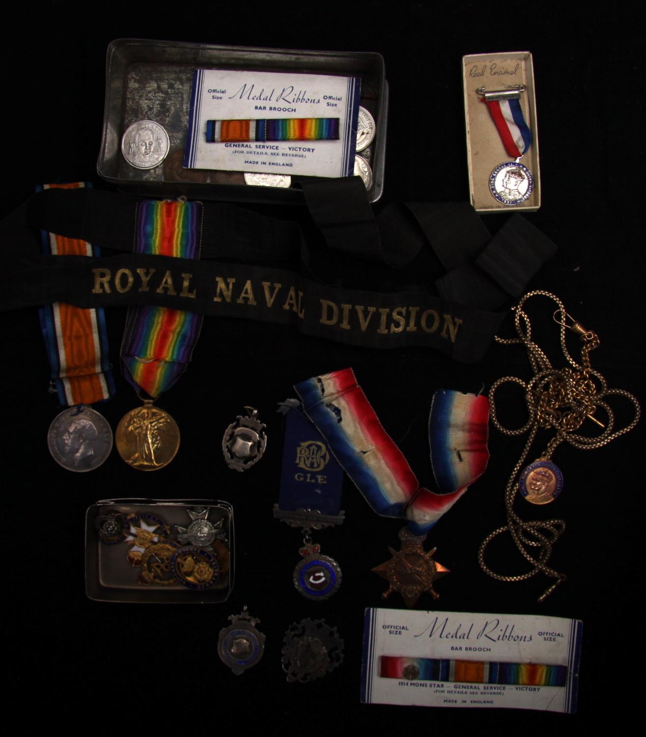 Medals, World War One, 1914/15 Star, 1911 PTE G(eorge) BAILEY NOTTS & DERBY R (1/6th battalion, Killed in Action 12.3.1916); Pair, 7200 PTE J(ames) LOMAS, NOTTS & DERBY R (also 267922 N&D); collar badge and sweetheart brooches, silver fobs (4); Royal Naval Division hat band; few postcards etc