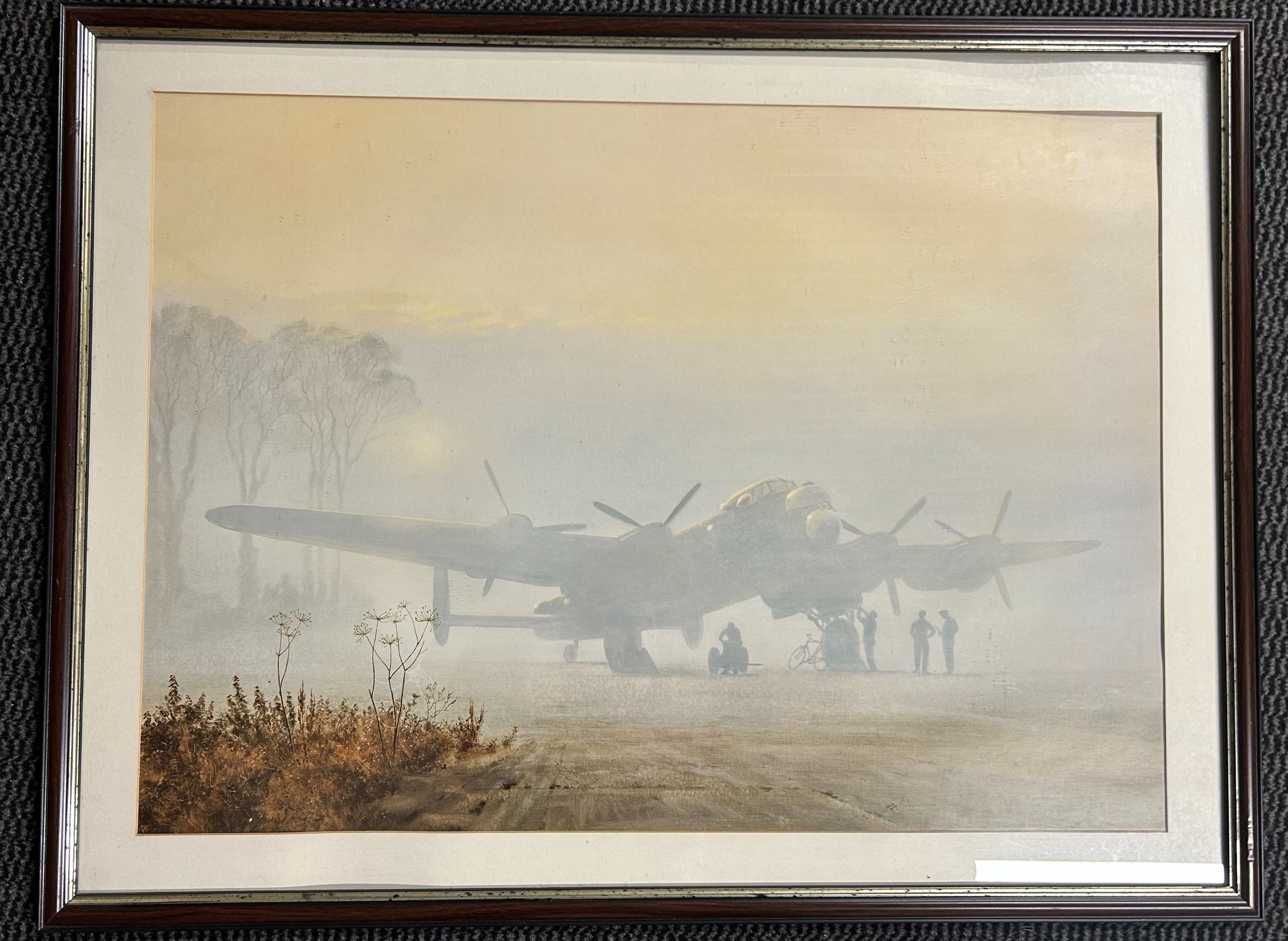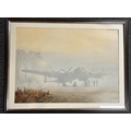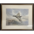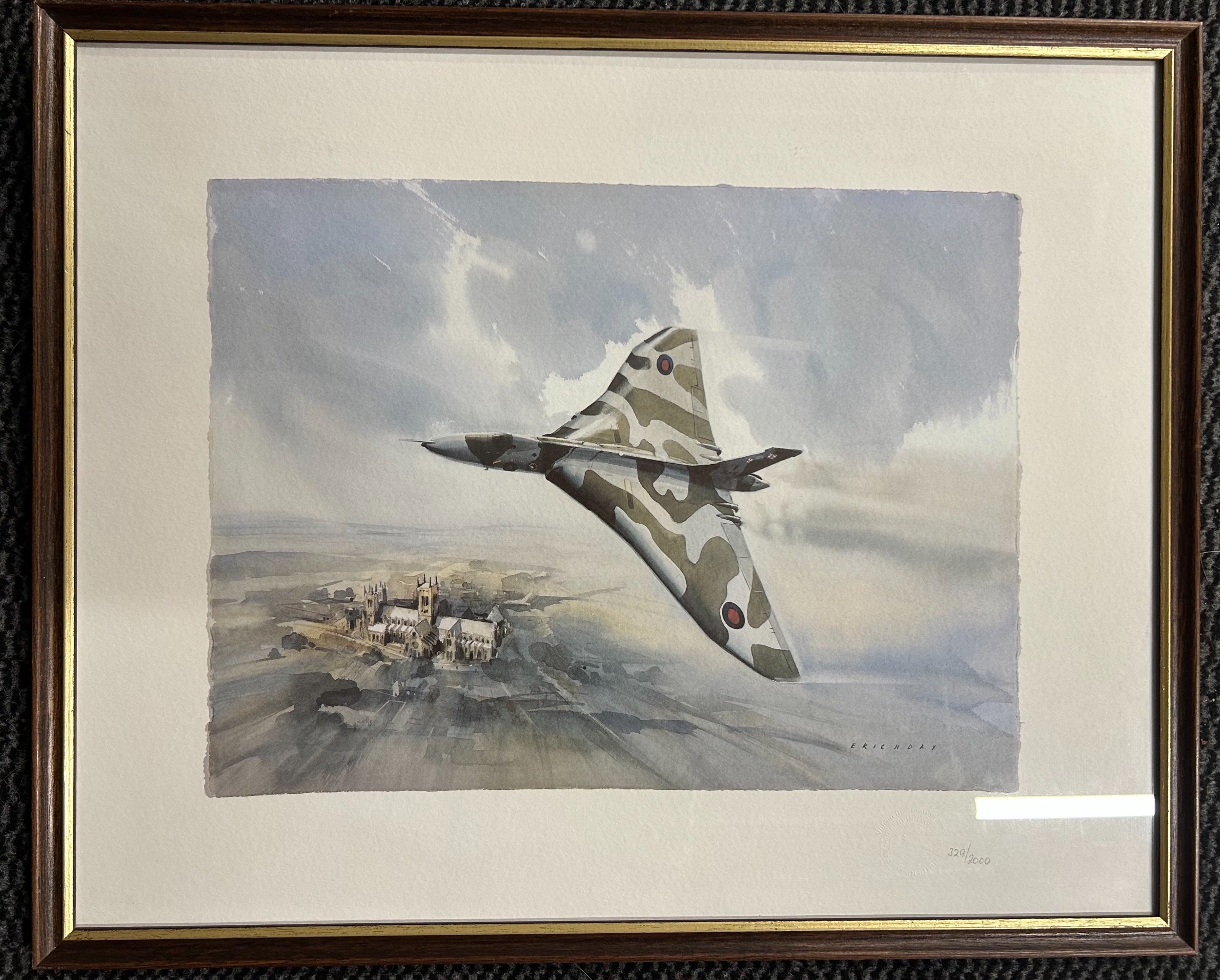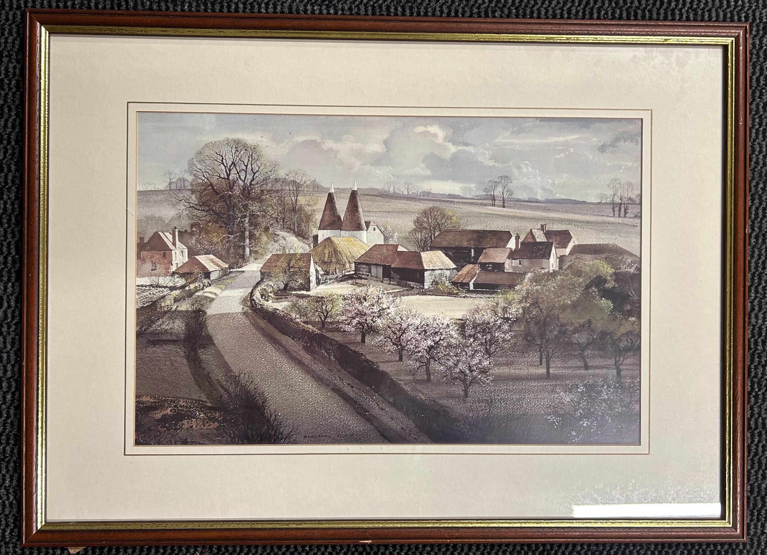 3 assorted coloured prints comprising a Vulcan bomber in flight printed Eric H Day and numbered 329/2000; another print of an oil painting showing a bomber being serviced and printed COULSON; and a print of a farm with oast houses printed Rowland Hilder. Average good condition.