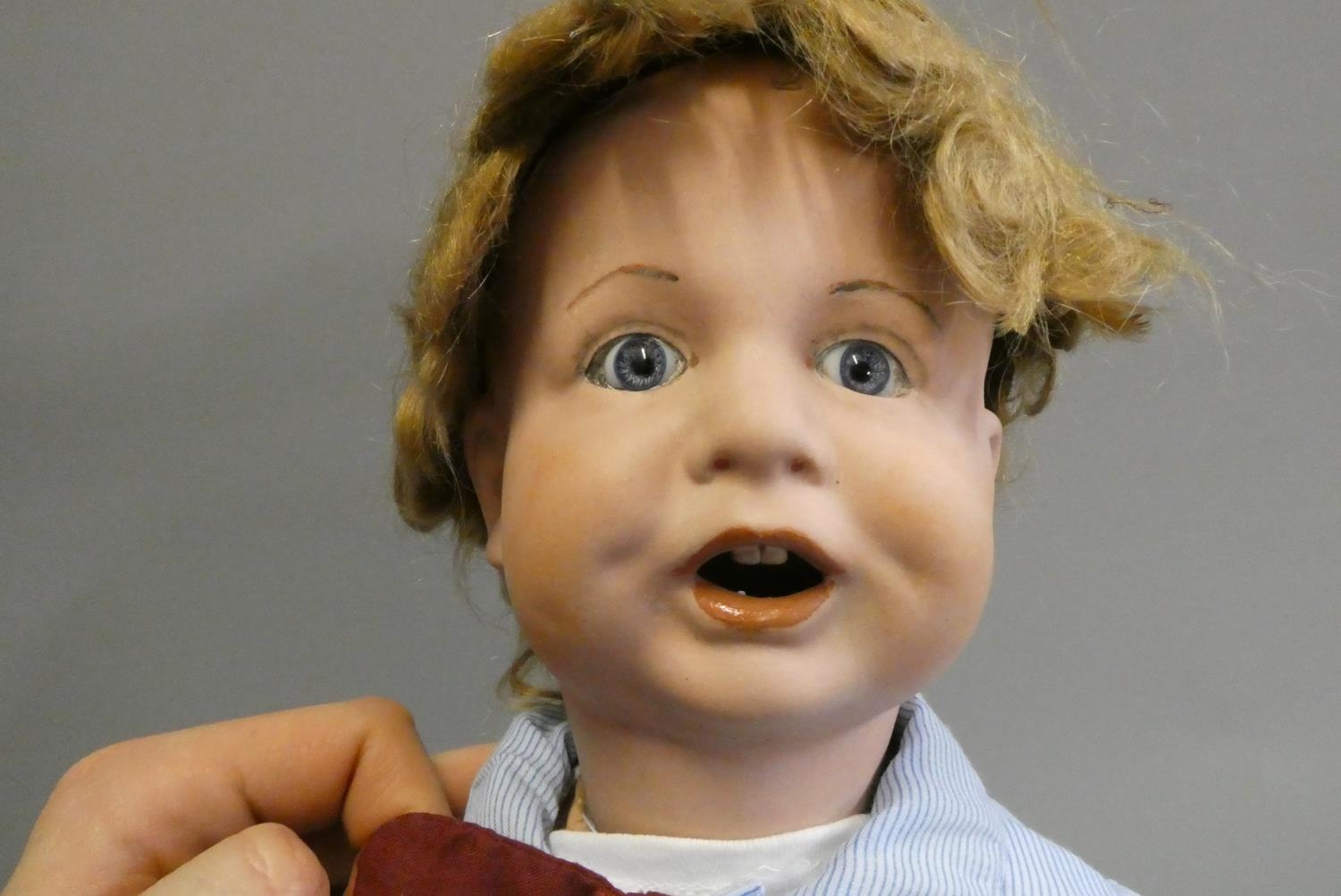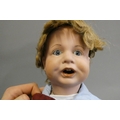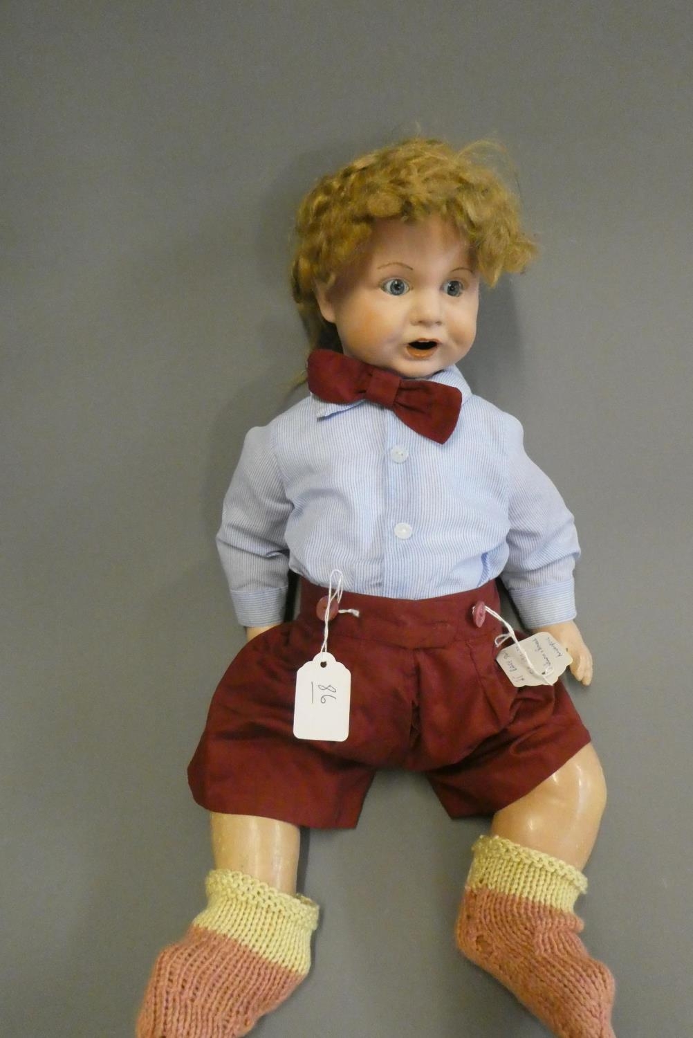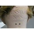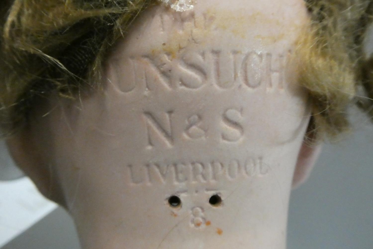 A "Nunsuch" Nunn & Smeed bisque British socket head doll, circa 1920, with blue glass fixed eyes, open mouth, teeth, composition bent limb body, numbered 8, 21" long
