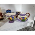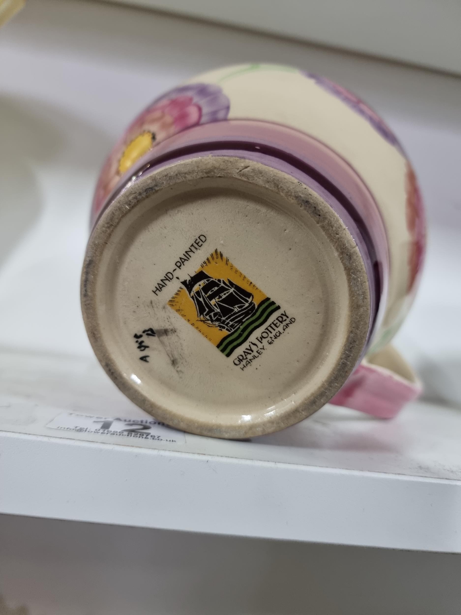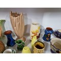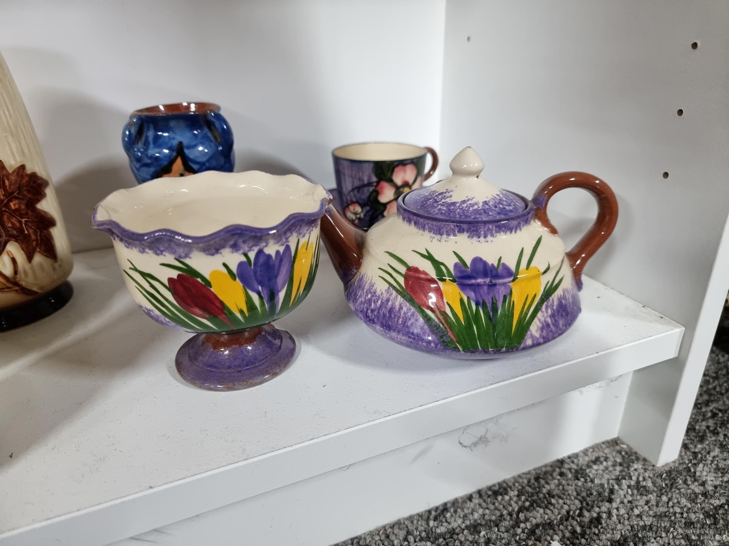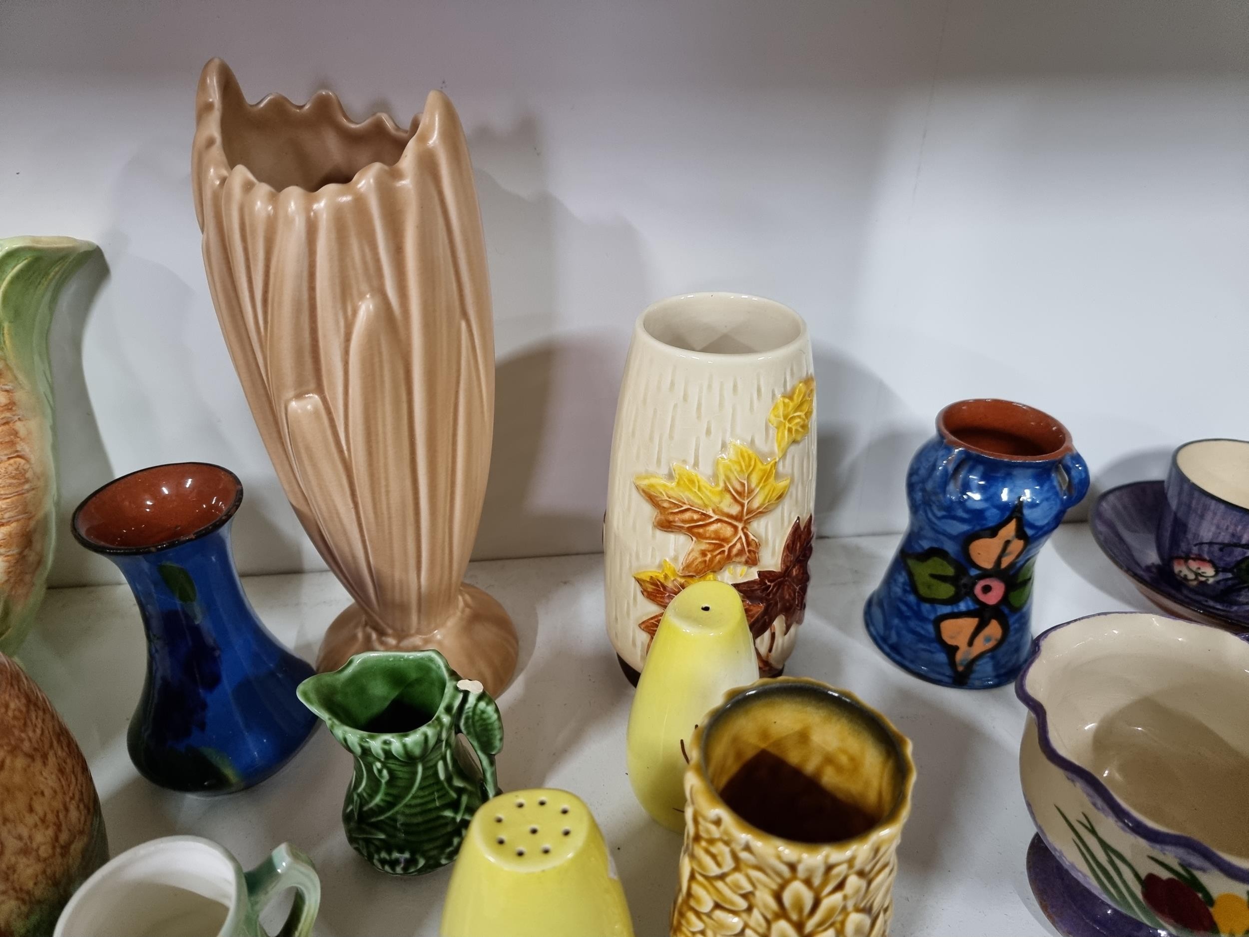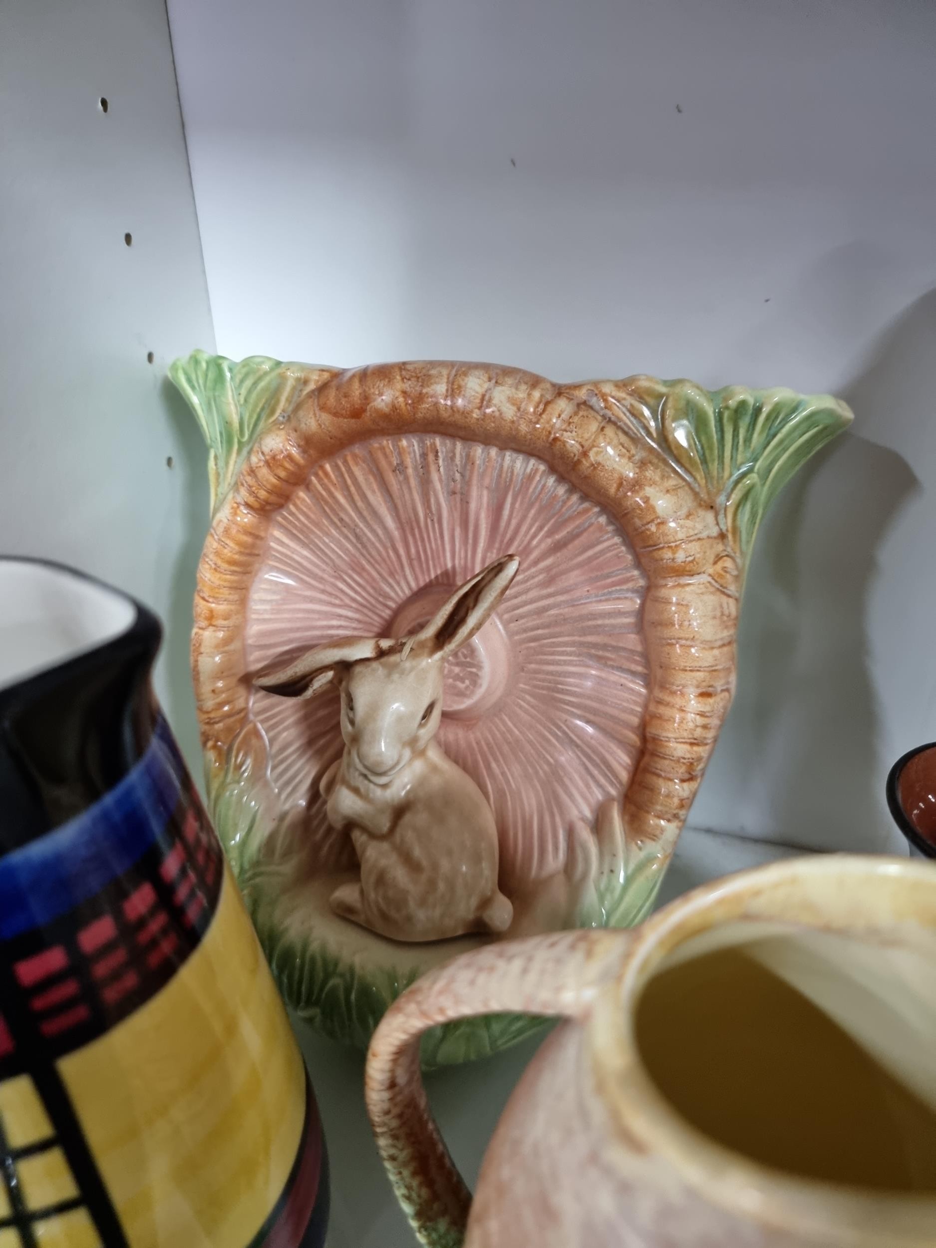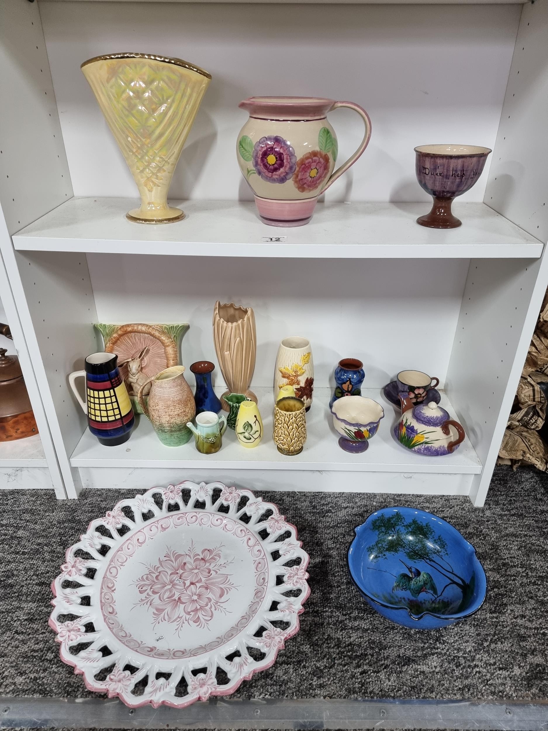 2 shelves containing a quantity of collectable ceramics including 7 Torquay ware pieces, a very good quality Grays pottery hand painted jug, a quantity of Sylvac items including a rabbit themed wall hanging wall vase, a large hand painted Portuguese platter. 1 Sylvac piece has a chip to the handle. The largest piece has a diameter of 40cm.