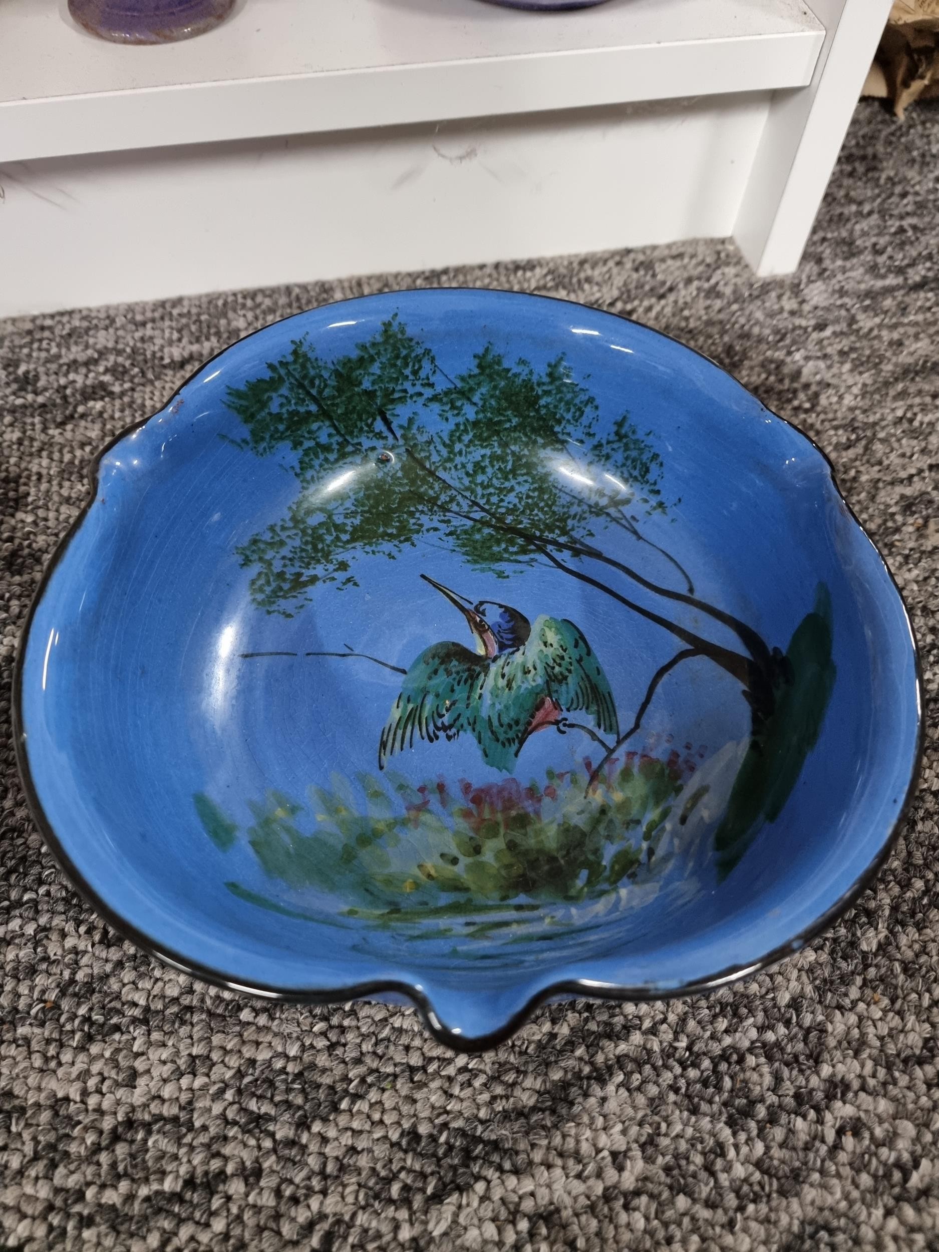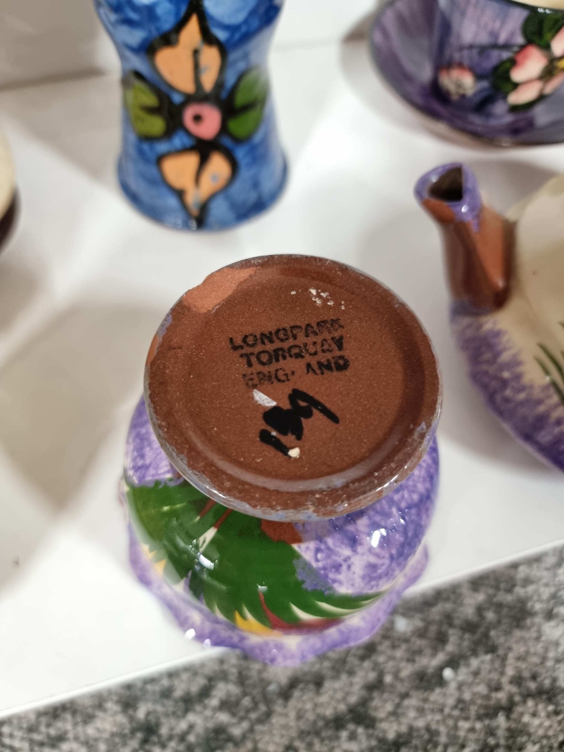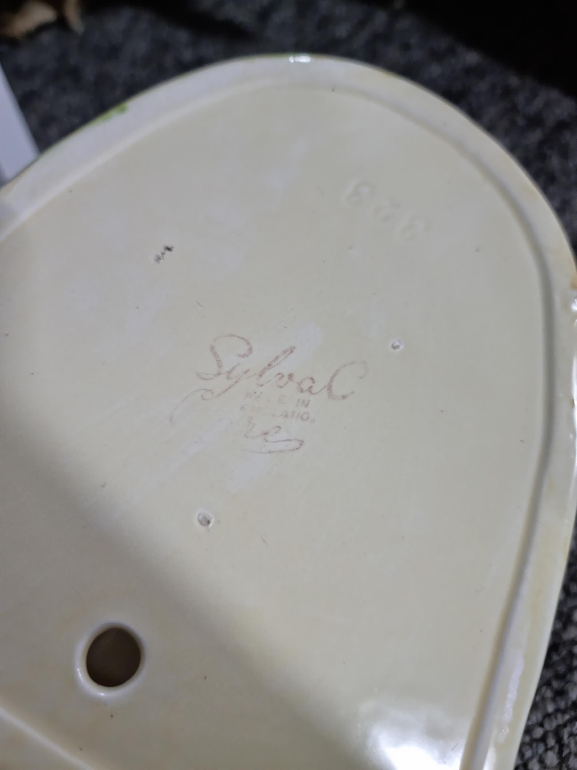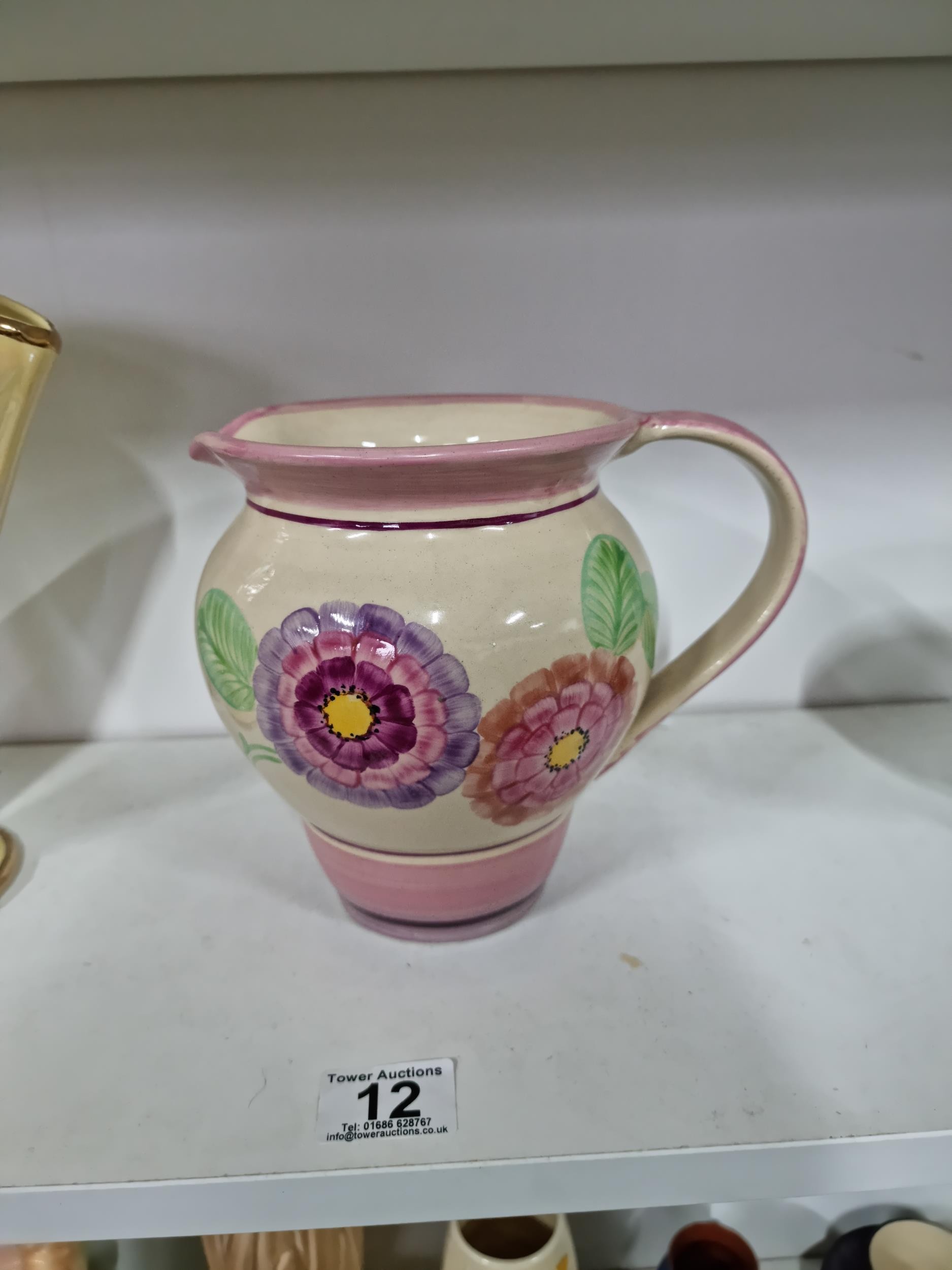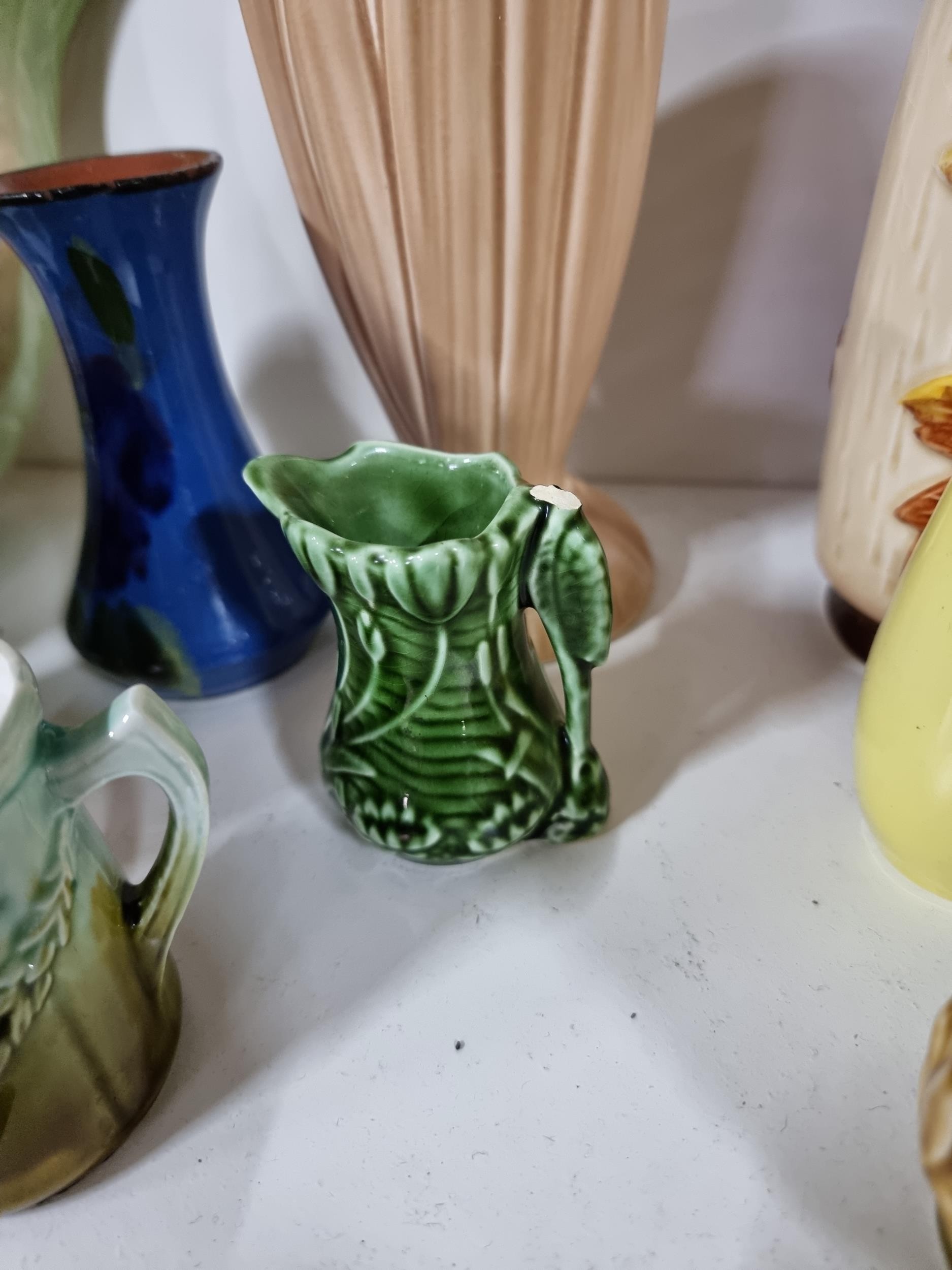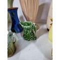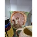 2 shelves containing a quantity of collectable ceramics including 7 Torquay ware pieces, a very good quality Grays pottery hand painted jug, a quantity of Sylvac items including a rabbit themed wall hanging wall vase, a large hand painted Portuguese platter. 1 Sylvac piece has a chip to the handle. The largest piece has a diameter of 40cm.