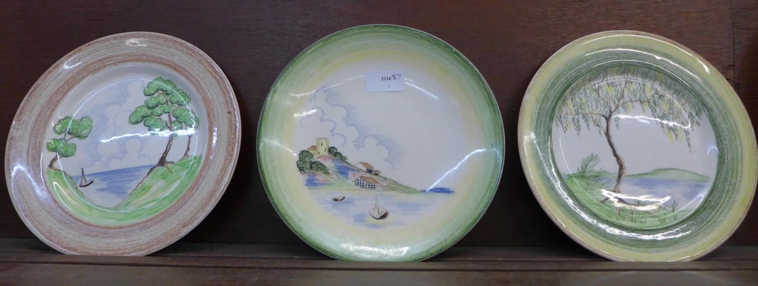 Three 1934 Clarice Cliff Bizarre Crayon Scenes, two plates and a swallow bowl