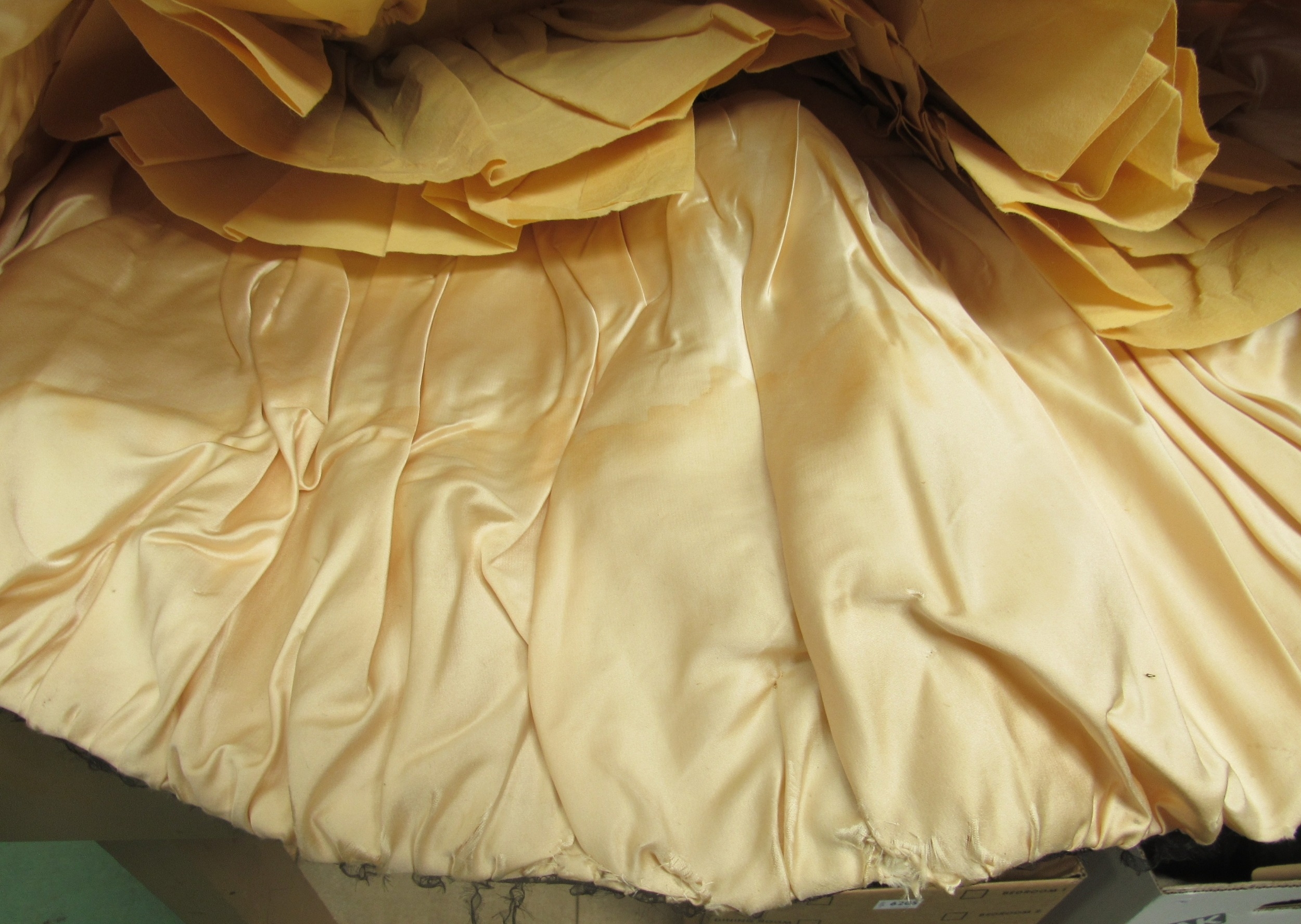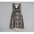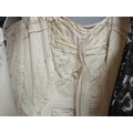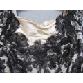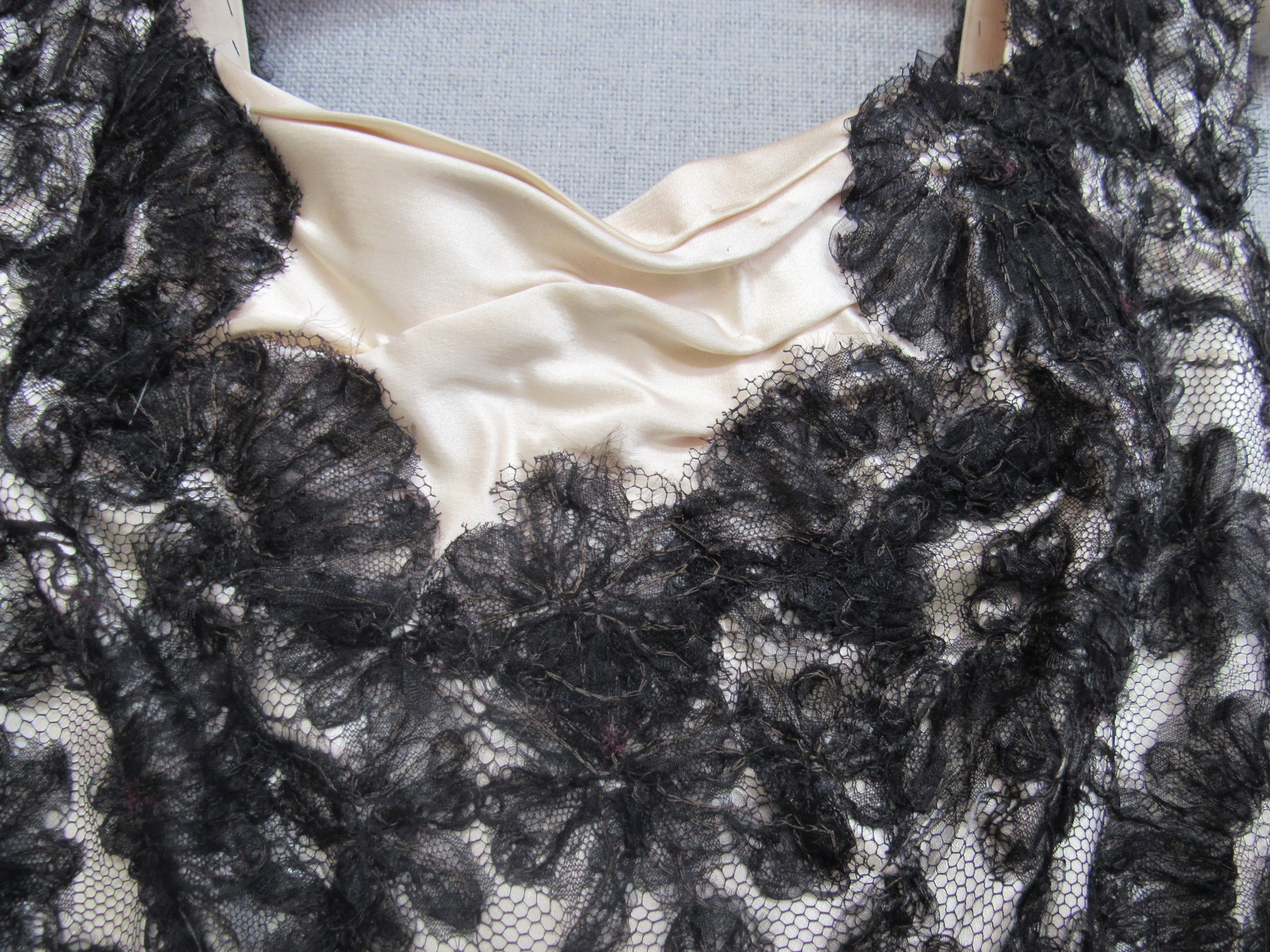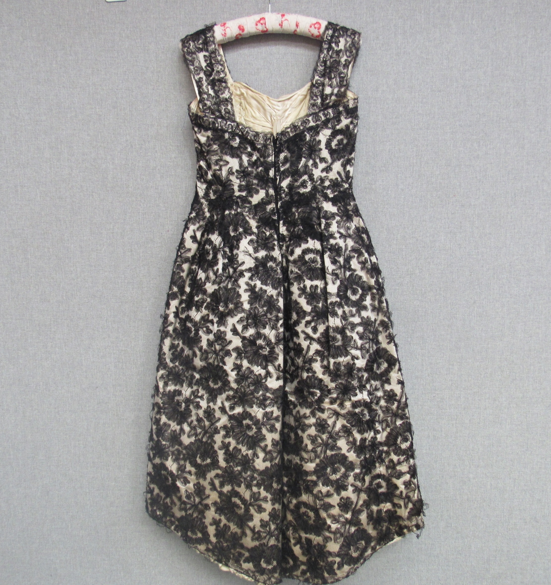 A stunning rare Mid Century cocktail dress by Yaga - The Madison Avenue, New York Couturier. The top layer is made of very fine interwoven lace to form flowers in the overall design, the underlayer is of cream silk. The front of the dress has a delicate scalloped shape neckline and is supported by wide shoulder straps. The back of the dress has a zip back fastening. The interior of the dress displays an intricate form of hand stitching to the boned bodice and the skirt is supported by a petticoat which has a wide pleated hemline. the stiffened fabric gives the skirt a soft structured full shape and the silk skirt to the dress has a hand stitched puffball shape effect to give an overall dramatic shape to the dress, the underskirt is also weighted