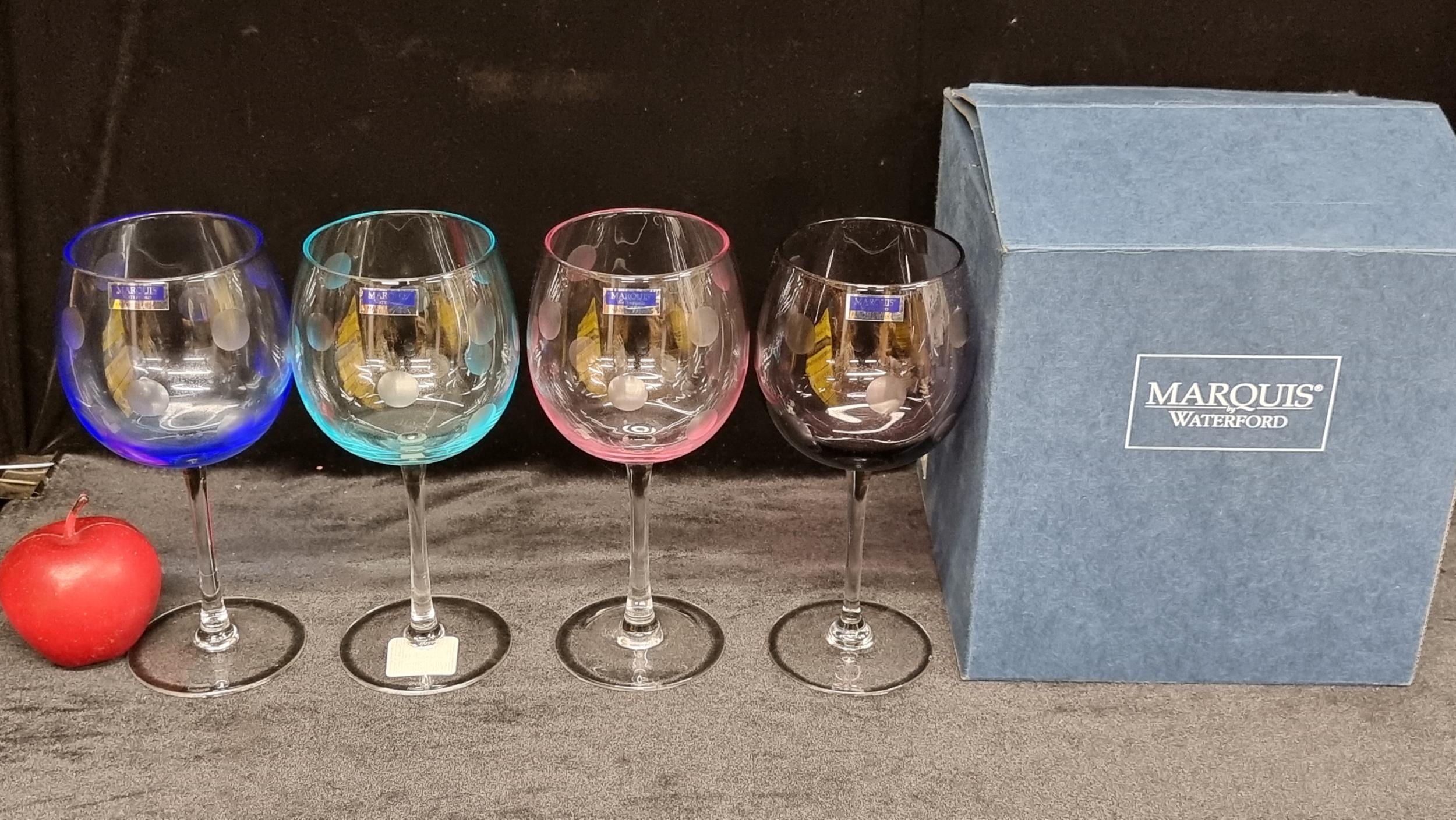 A pretty set of 4 coloured glass polka dot balloon glasses by Marquis for Waterford Crystal. (2002-04) A pretty set in shades of pink and blue, purple and green in their original box.