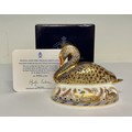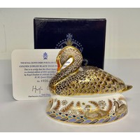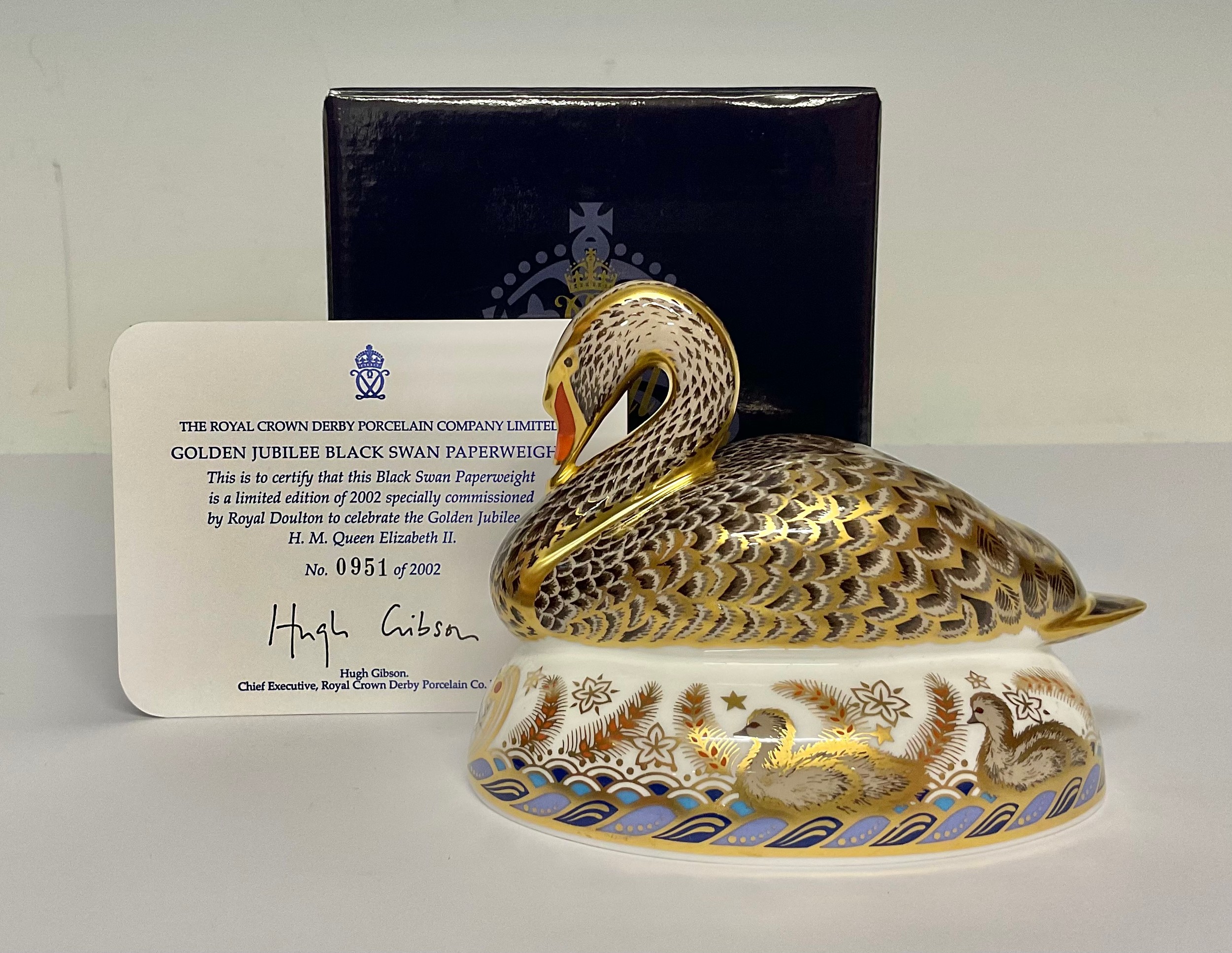 A Royal Crown Derby paperweight, Golden Jubilee Black Swan, specially commissioned by Royal Doulton in 2002 to celebrate the Golden Jubilee of HM Queen Elizabeth II, limited edition 951/2,002, gold stopper, 10cm high, printed mark in red, signed in gold by Sue Rowe, certificate, boxed