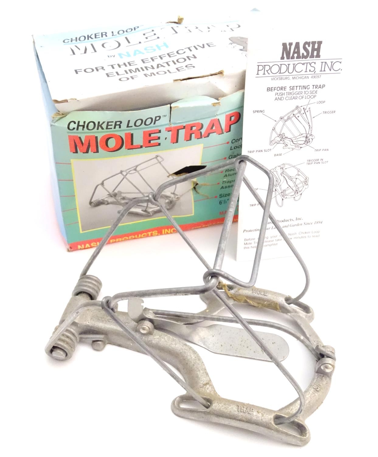 A Nash 'Choker loop' mole trap, of galvanised steel and aluminium construction, boxed with instructions. 8" long