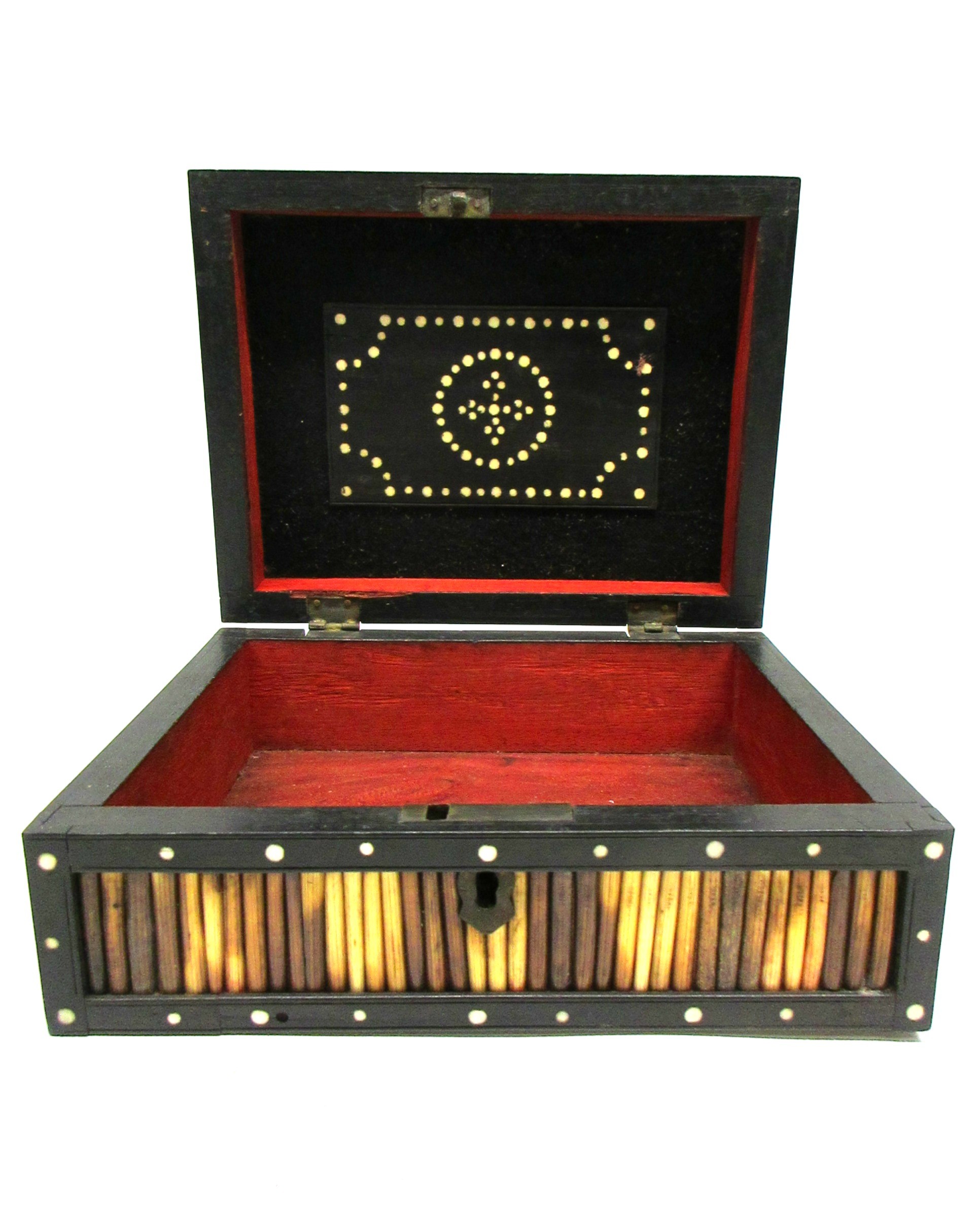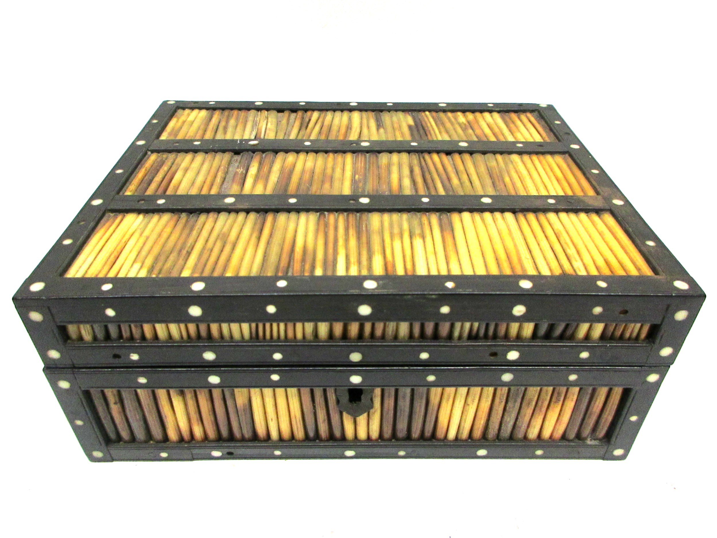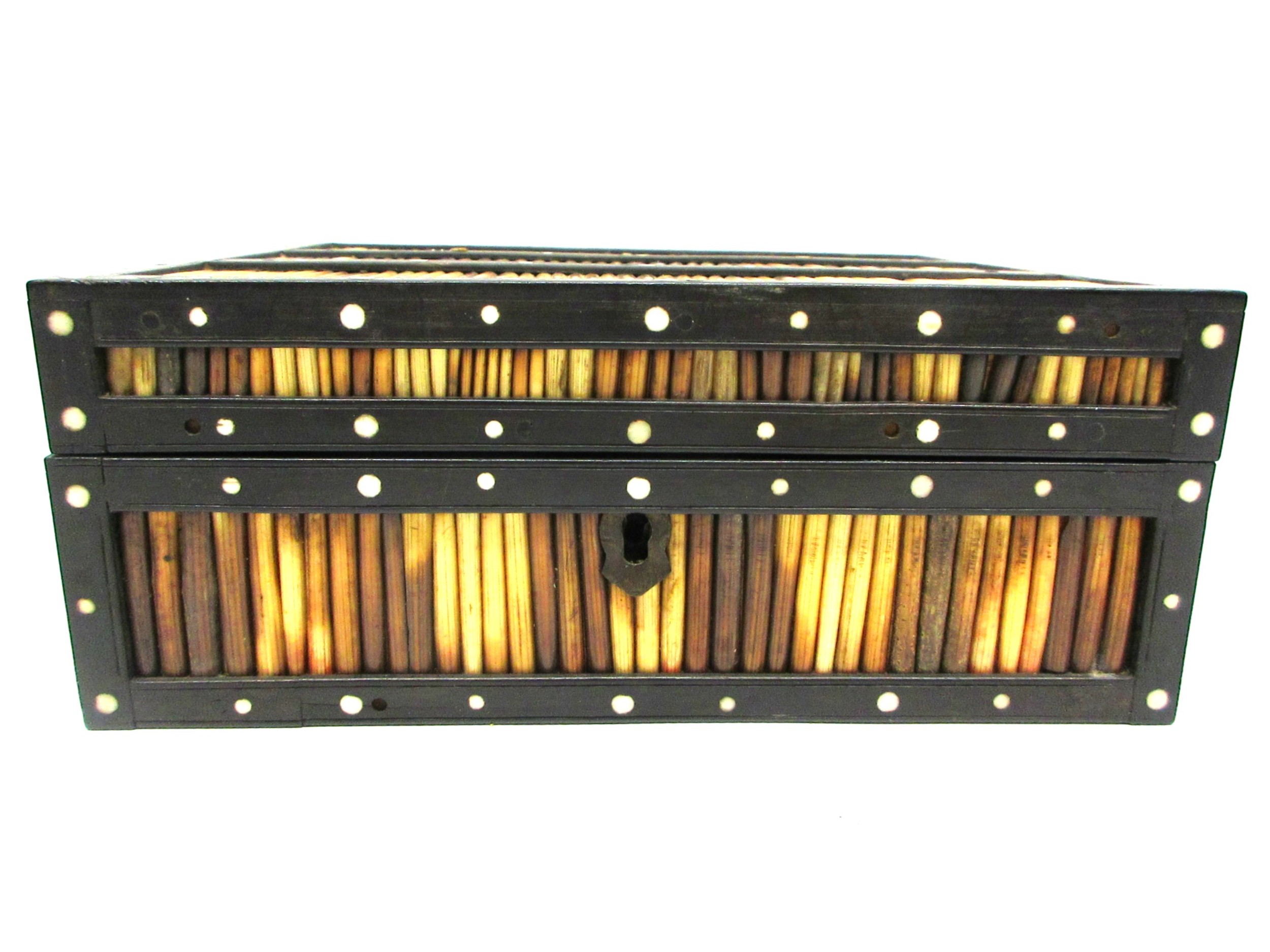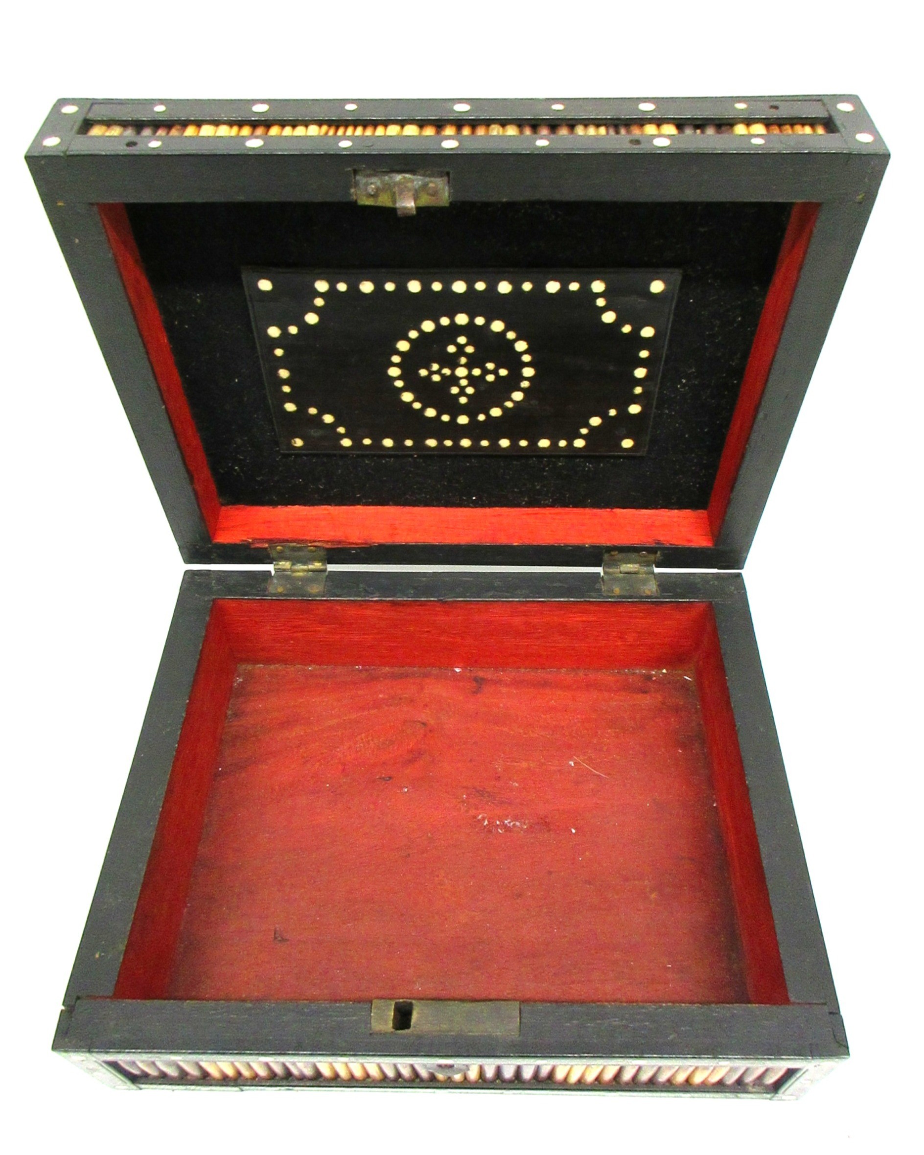 Early 20th Century Anglo-Indian highly-decorative porcupine quill cigar or spice box, of rectangular form, made in Ceylon/Sri Lanka, featuring stacked gradients of quills covering the exterior, bordered with ebonised wood banding & discs of bone inlay; plus further bone patterning décor to the inside lid, with painted red interior & open storage compartment; approx. W 20cm x D 15.5cm x H 8cm, Qty. 1