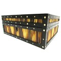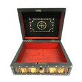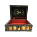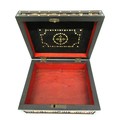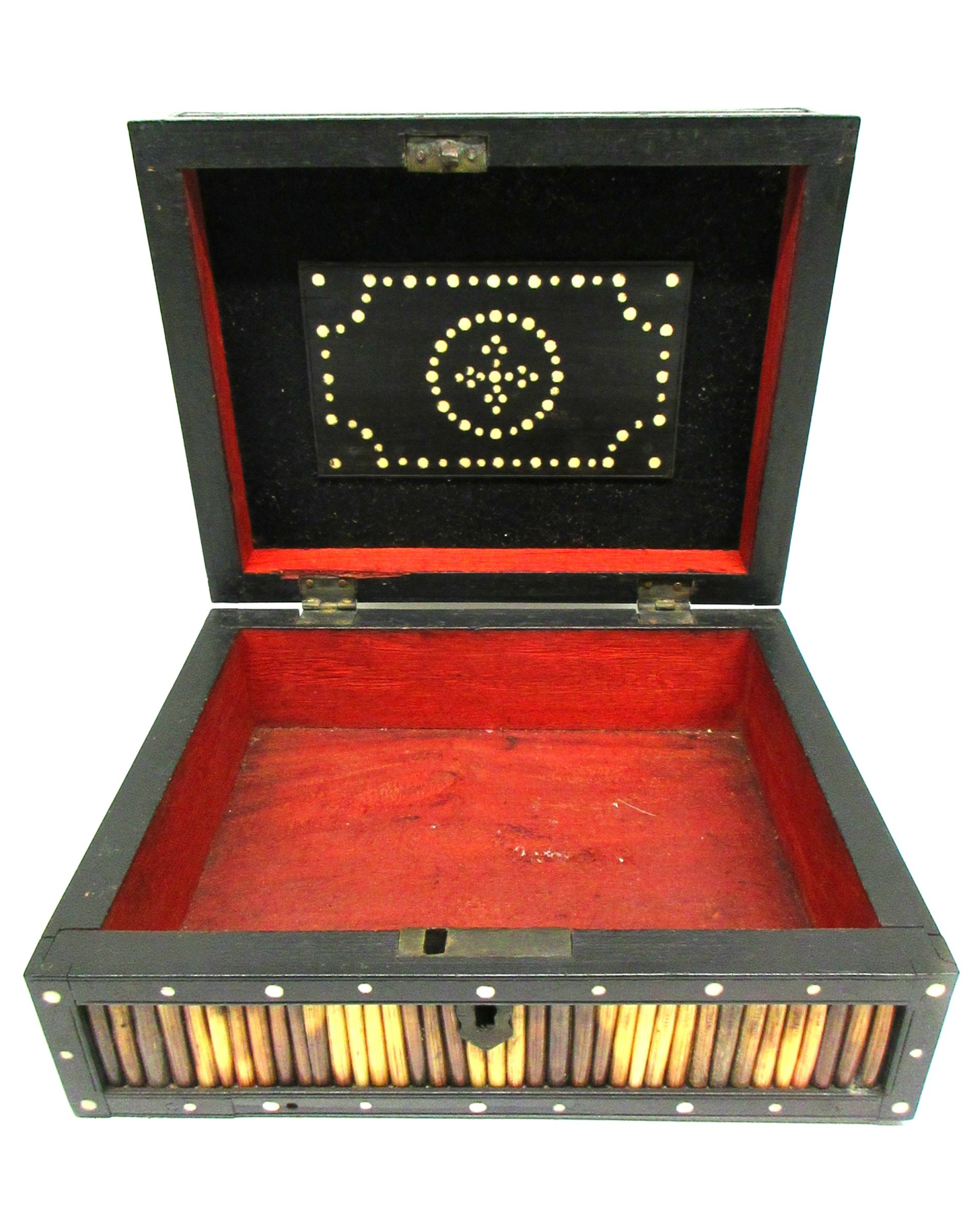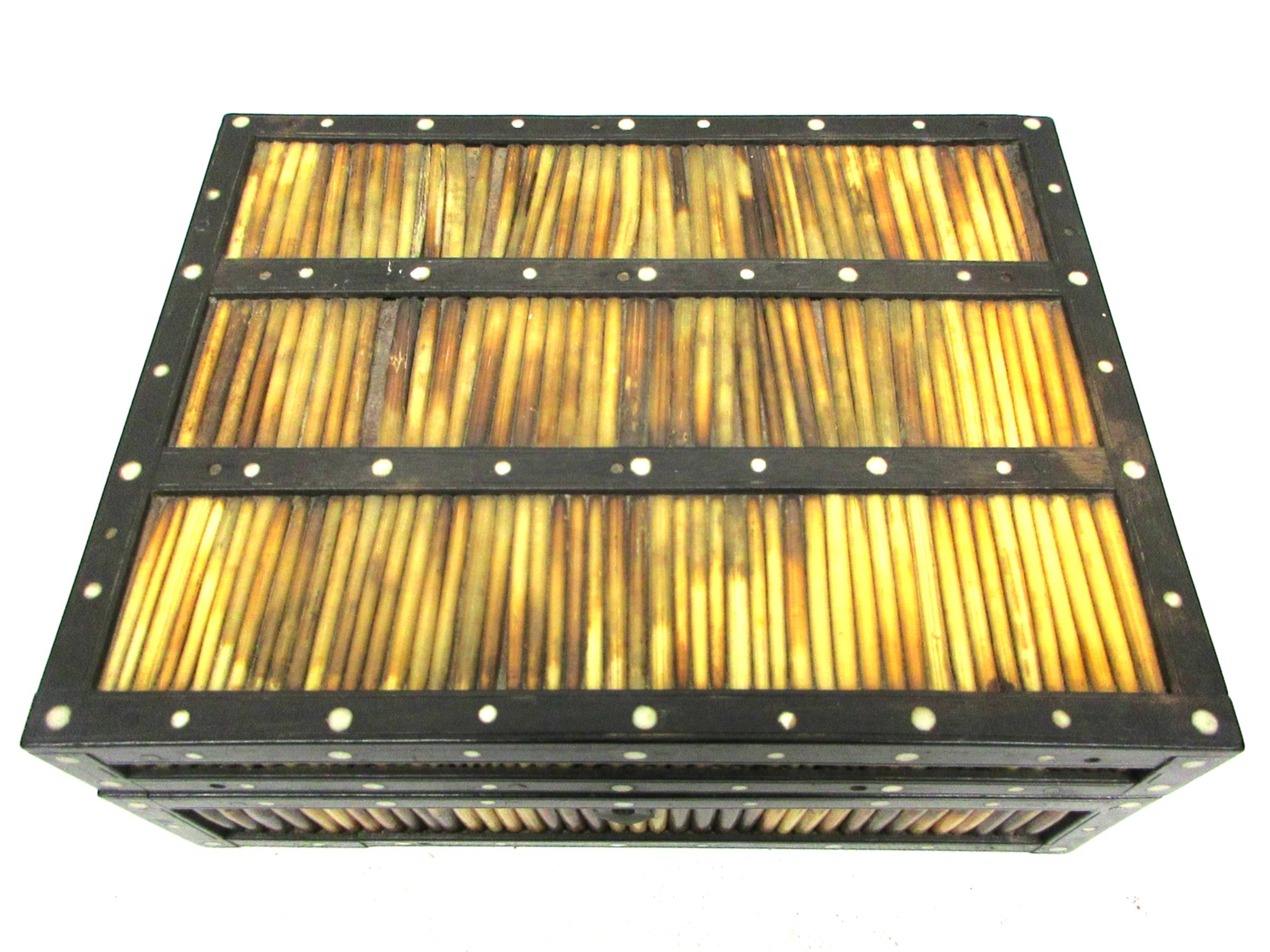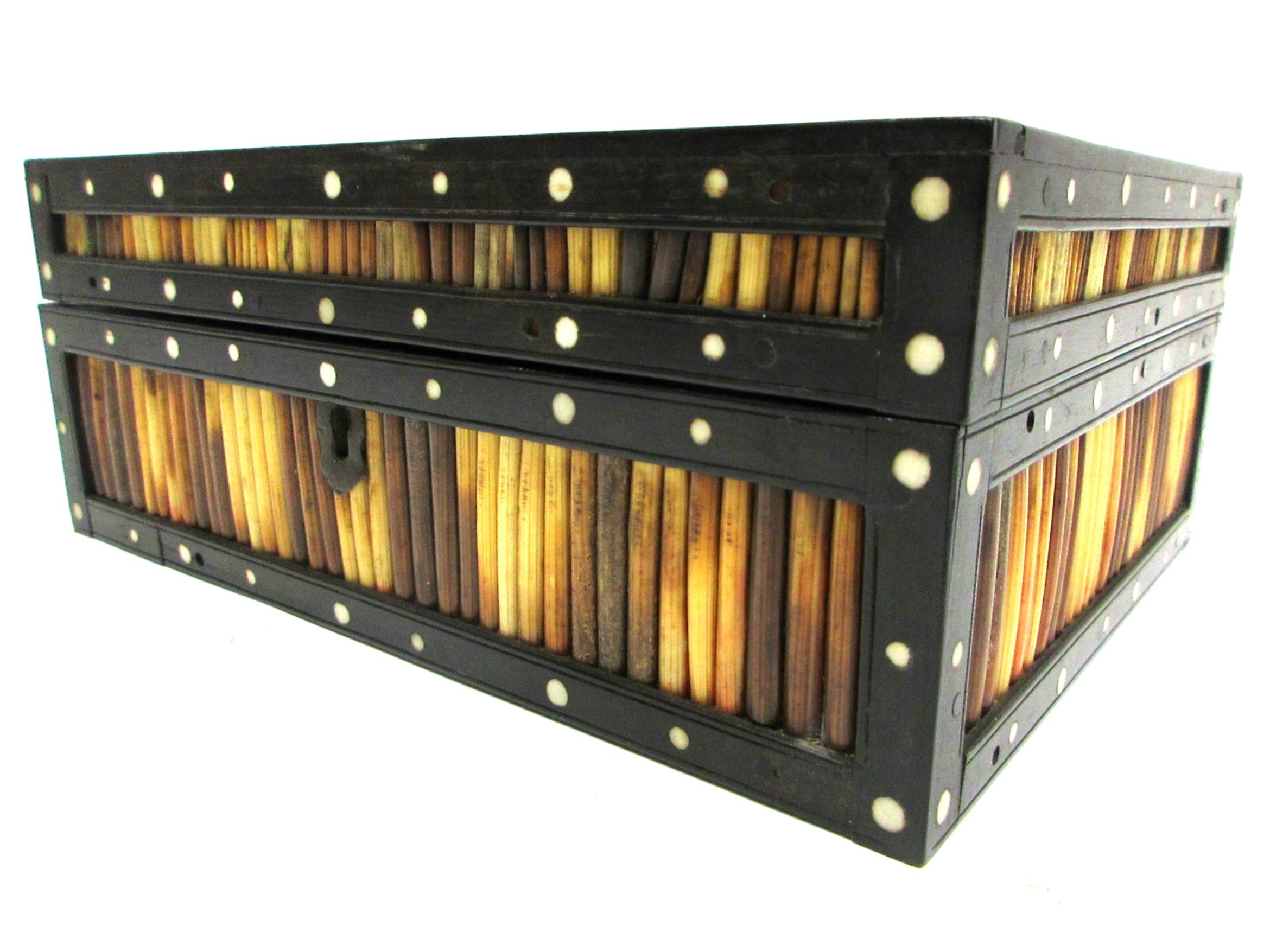 Early 20th Century Anglo-Indian highly-decorative porcupine quill cigar or spice box, of rectangular form, made in Ceylon/Sri Lanka, featuring stacked gradients of quills covering the exterior, bordered with ebonised wood banding & discs of bone inlay; plus further bone patterning décor to the inside lid, with painted red interior & open storage compartment; approx. W 20cm x D 15.5cm x H 8cm, Qty. 1