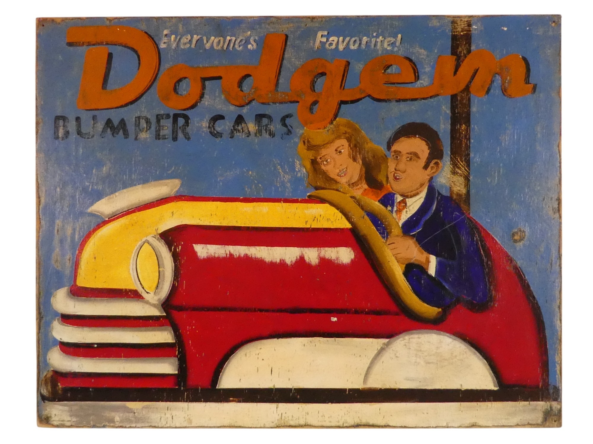 A painted showmans sign - 'Bumping Cars', distressed decoration with a couple in a car and inscribed in showman's font on a light blue ground, 96 x 122cm.