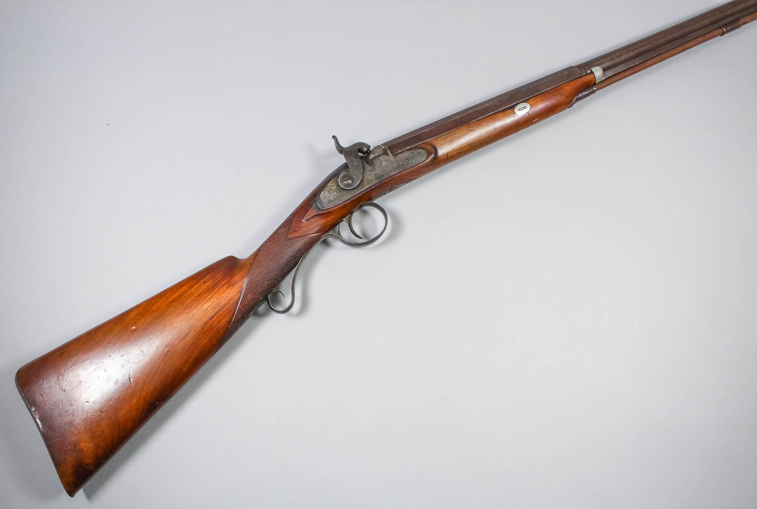 A 16 Bore Muzzle Loading Fowling Piece, by W Ketland of London, 32ins damascus steel barrel bearing the word "London" to top face, plain lock decorated with foliate work and maker's name, walnut stock and fore end with chequered grip, ram rod present, 48ins overall, in fitted wooden case with powder flask and other accessories