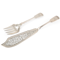 A set of six Victorian silver Queens pattern dessert spoons by Samuel Hayne & Dudley Cater, decorated with shell back bowls, together with two matching table forks and a teaspoon, London, 1860, all with engraved initial and an earlier silver King's pattern sauce ladle, by George Adams, London, 1851, 23.3oz.