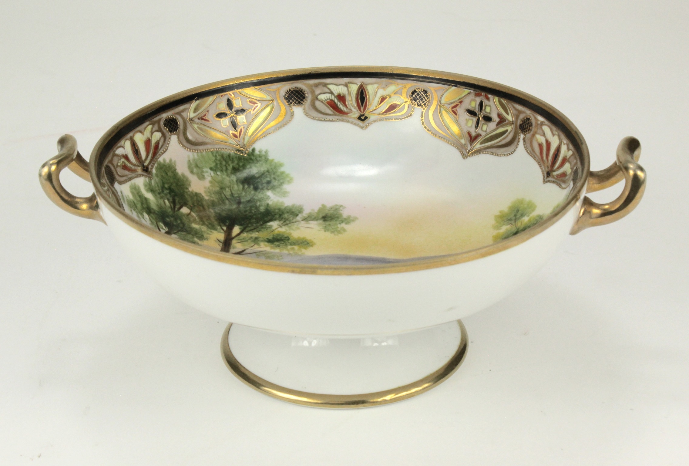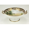 Noritake twin handled hand painted pedestal bowl, depicting a river scene with cottage and swans, makers mark to base, height 8cm, diameter 18.5cm approx. (excluding handles)
