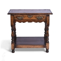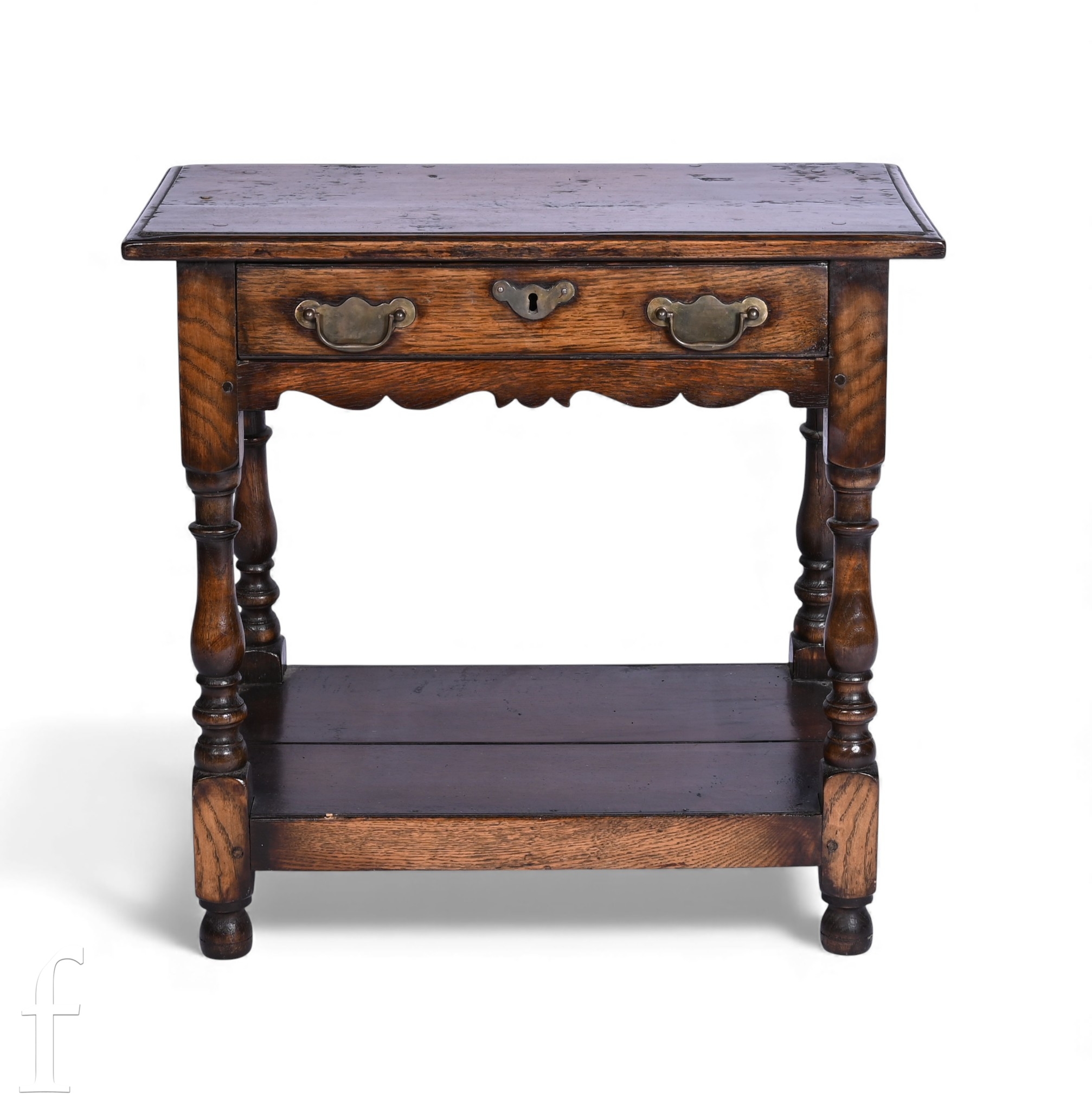 An 18th Century style oak side table fitted with a single drawer, brass drop handles, on turned legs united by an undertier, height 58cm x 30cm x width 62cm.