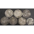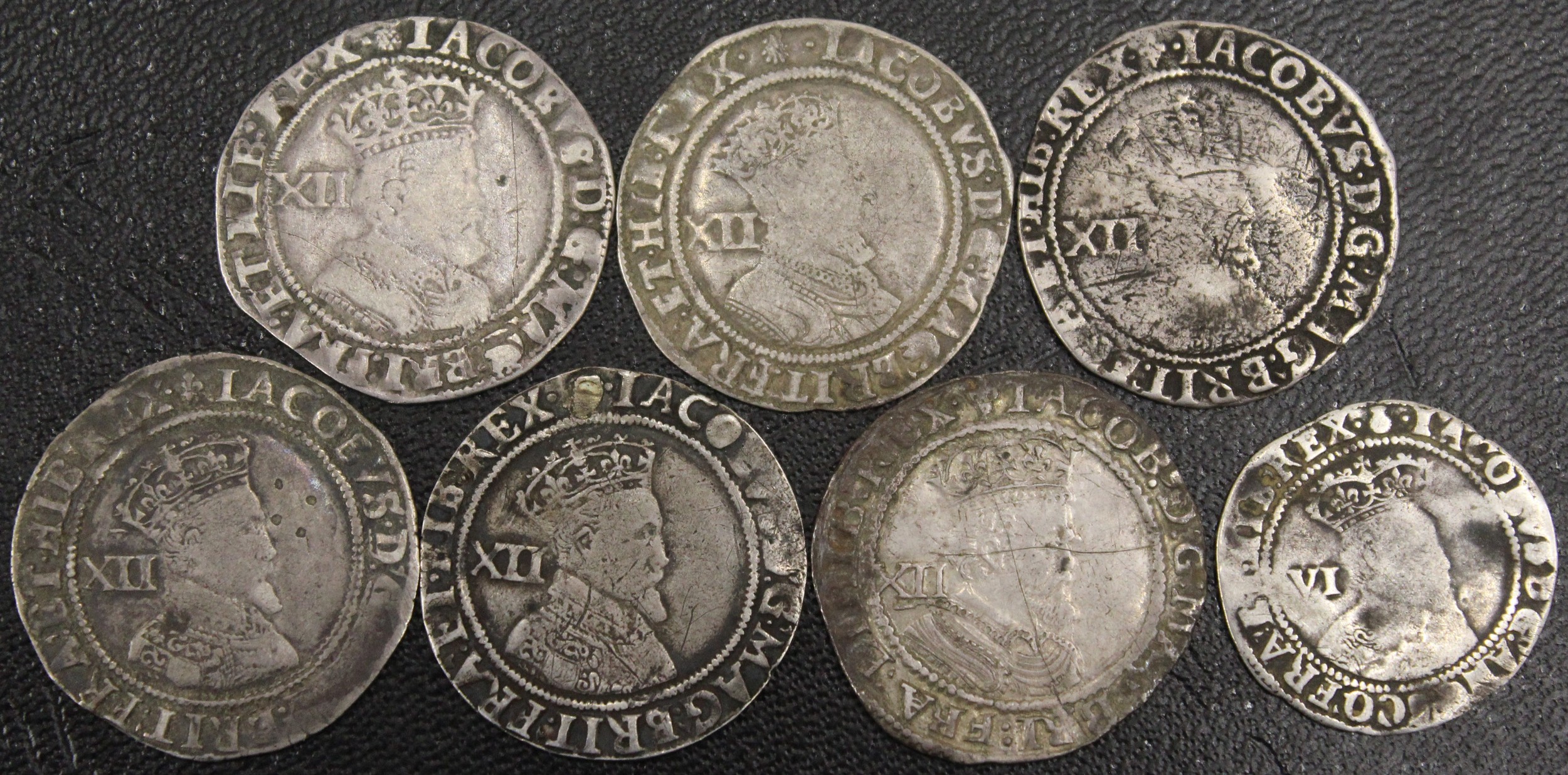 James I (1603-1625) shillings (6) and sixpence (1, 1604). Mixed grades.
