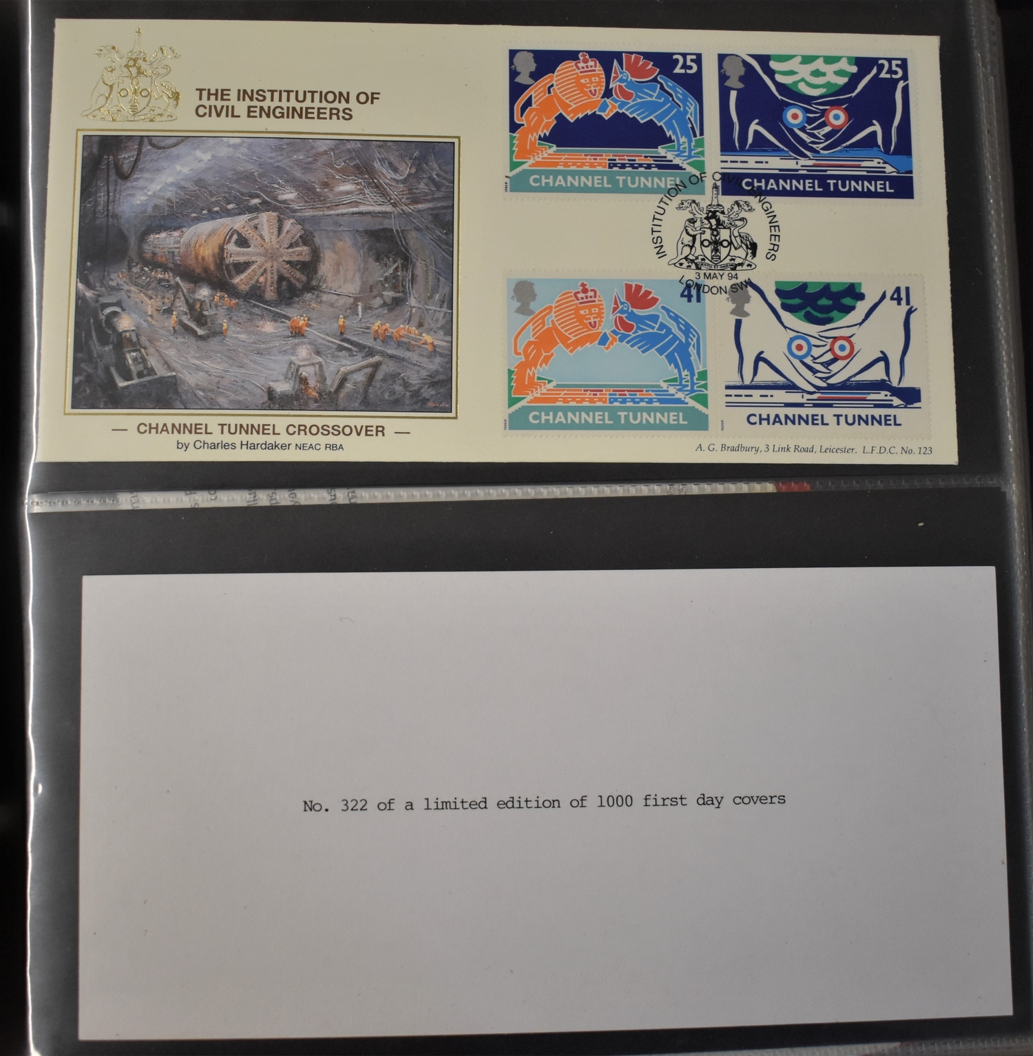 Great Britain (FDC's) 1994-1996, A collection in an album, mostly with P.O. Alternative handstamps, some limited editions, for example a Bradbury Channel Tunnel on Institute of Civil Engineers A/T (42), also some Aerogramme sets, these mint (16)