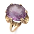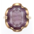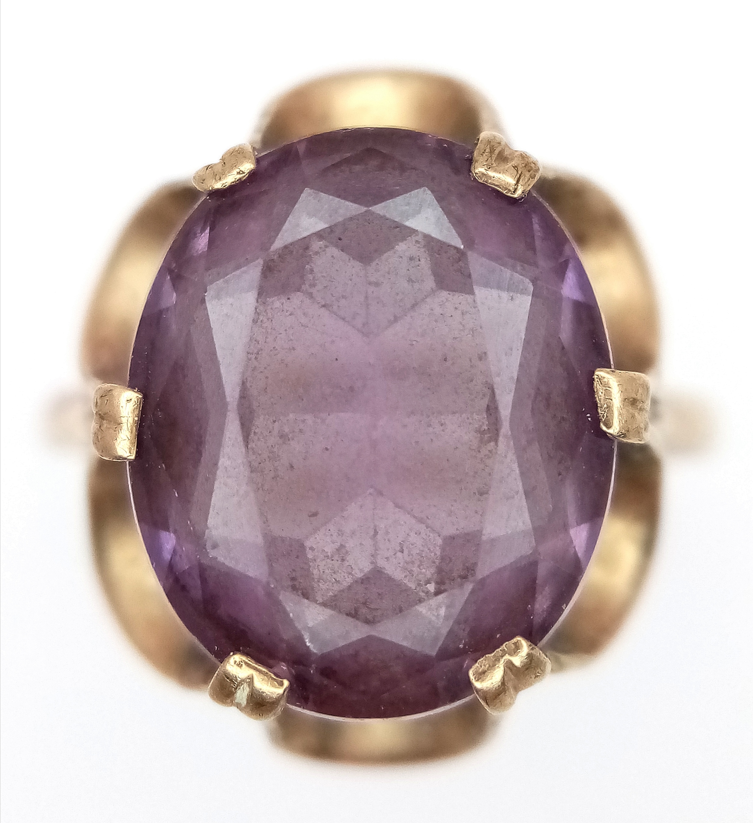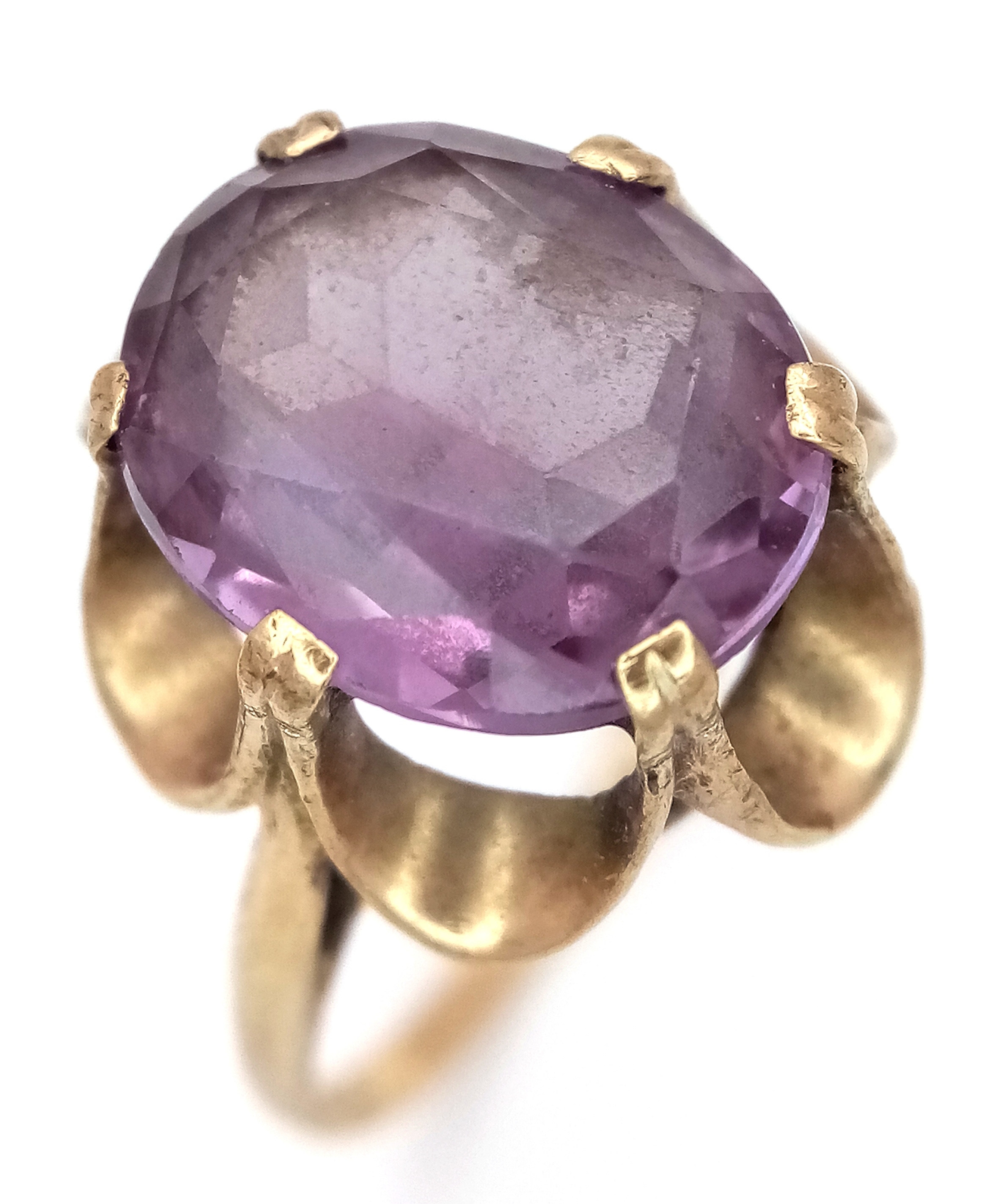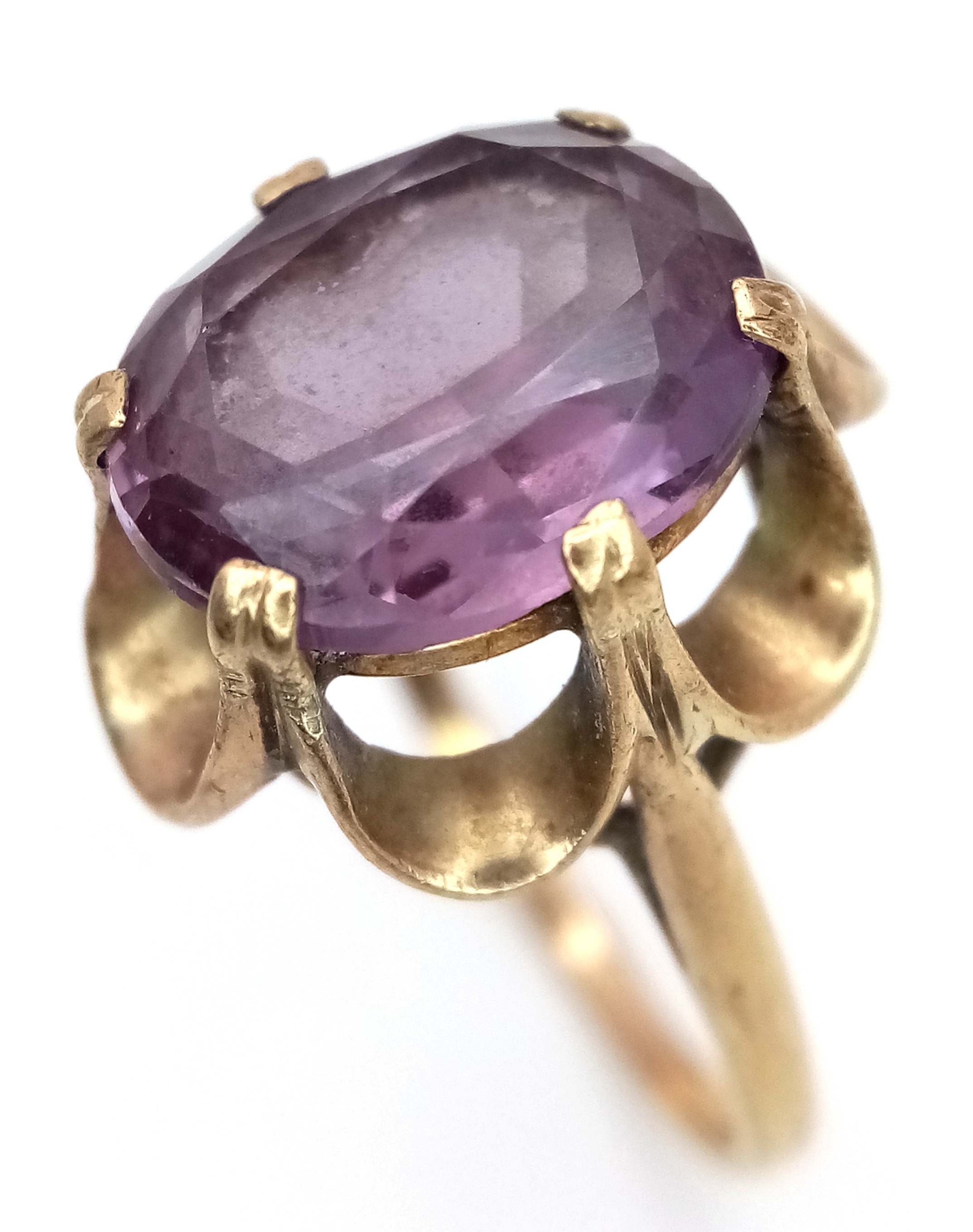 A LARGE AQUAMARINE COLOURED STONE SET IN AN ORNATE 9K GOLD VINTAGE RING . 3.7gms size N/O