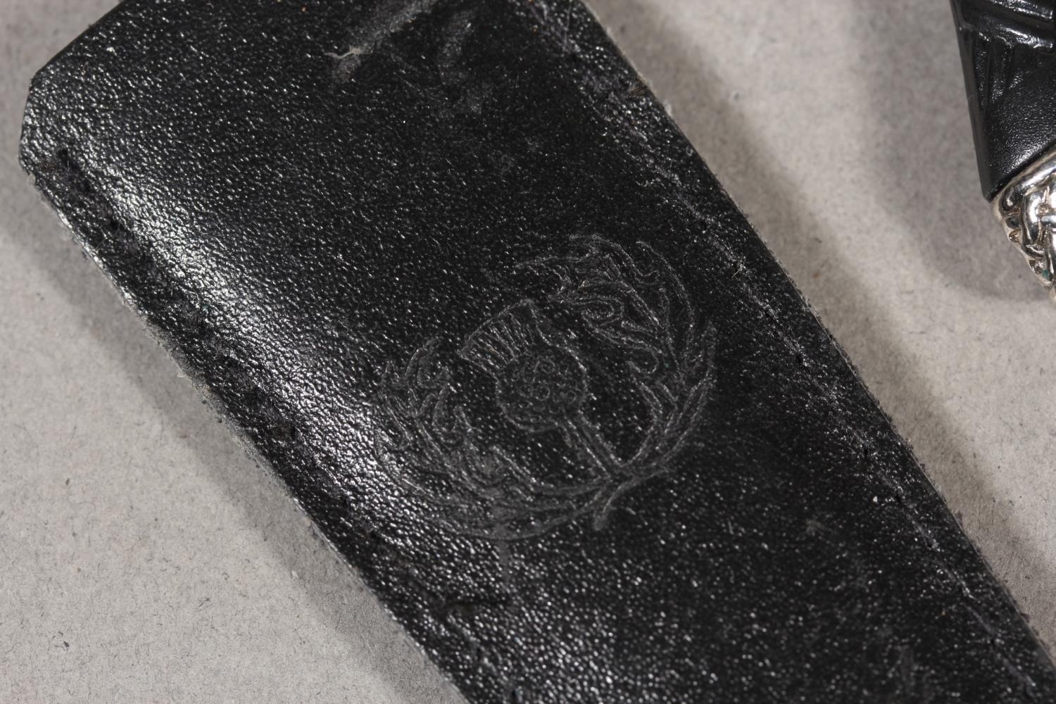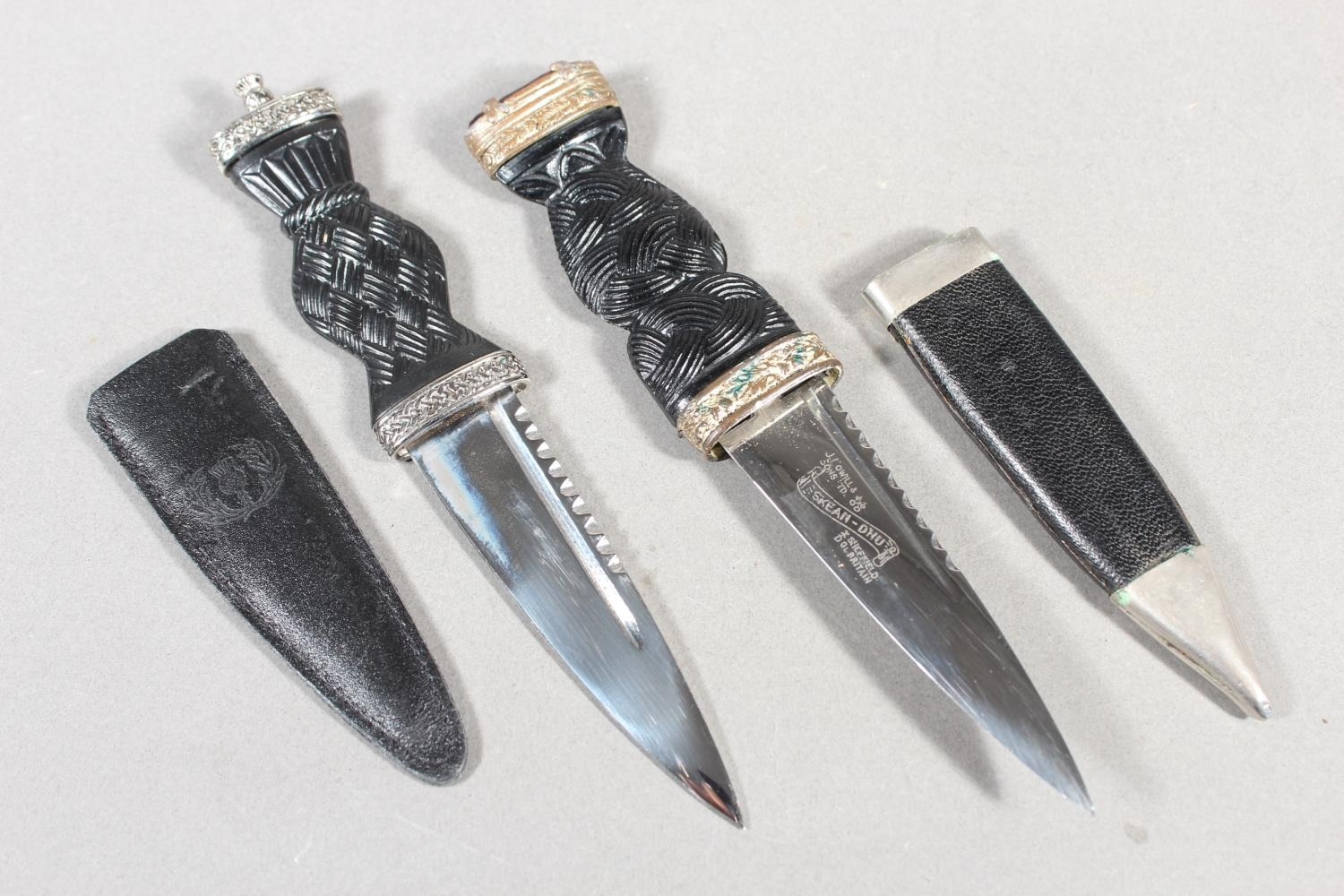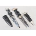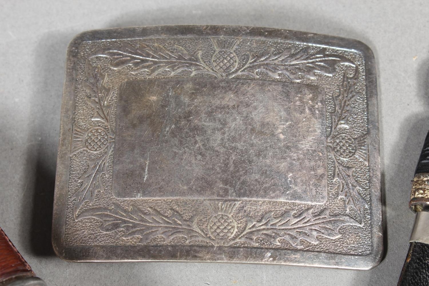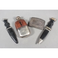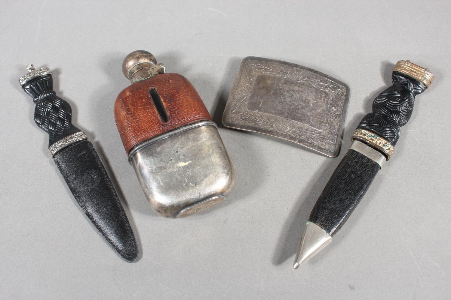 Two sgian dubhs, a silver-plated and leather hip flask and a Scottish silver-plated belt plate.