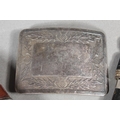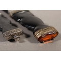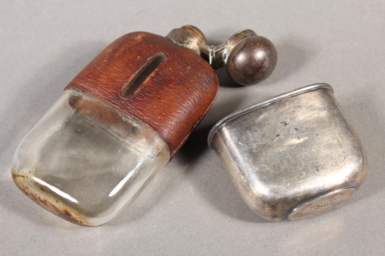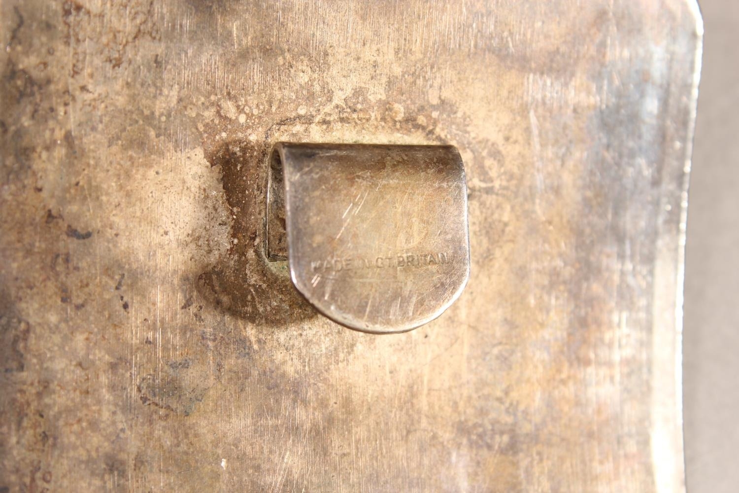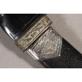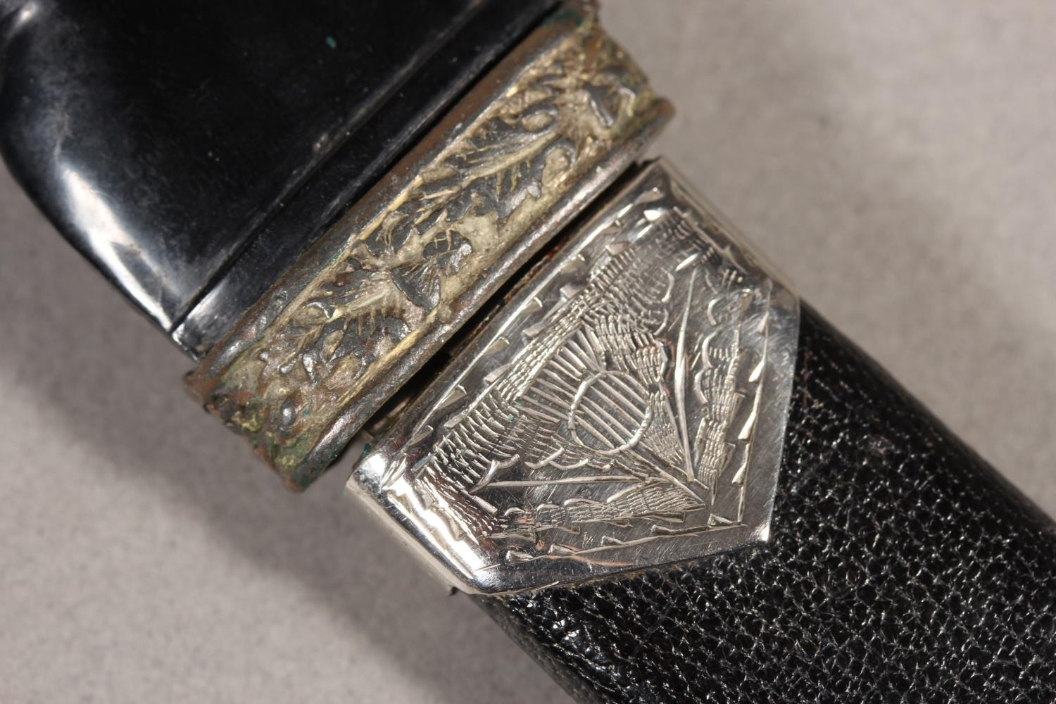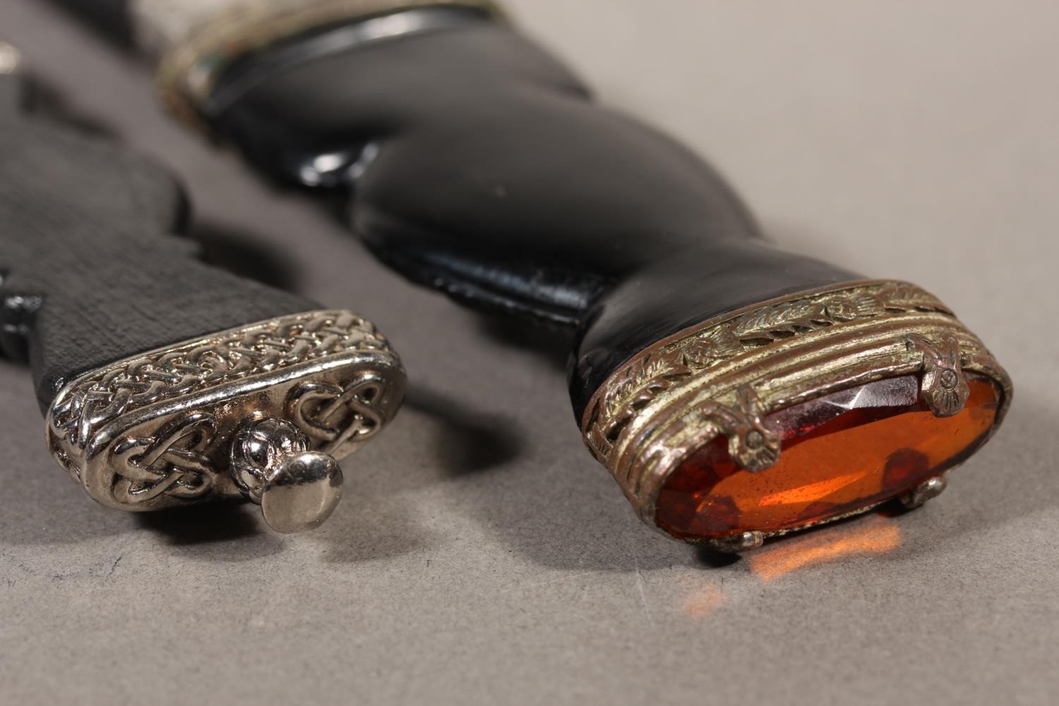 Two sgian dubhs, a silver-plated and leather hip flask and a Scottish silver-plated belt plate.