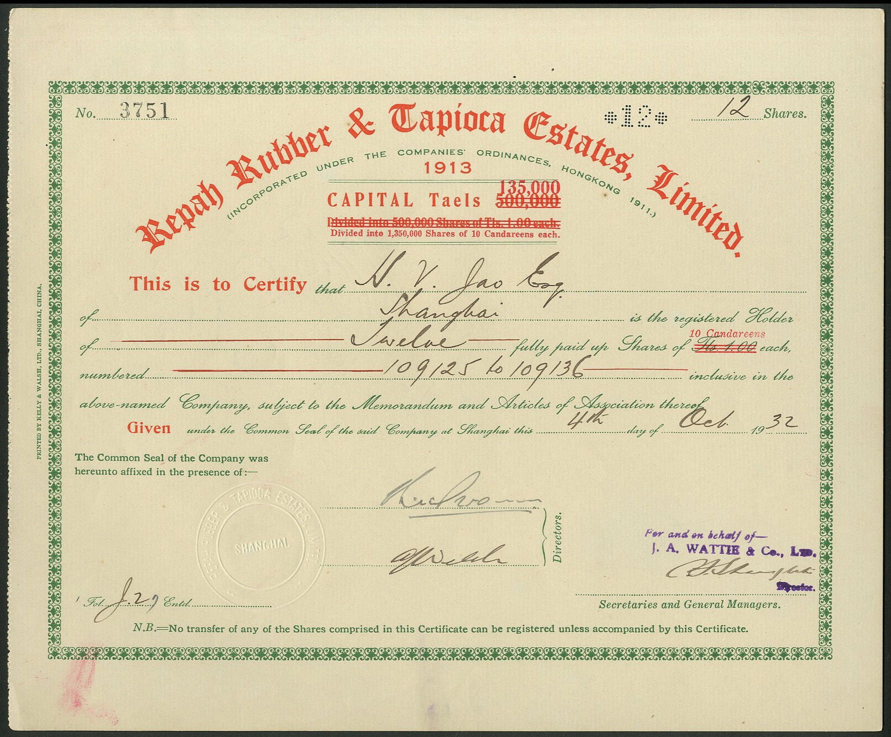 Malaya: Repah Rubber & Tapioca Estates Ltd., 10 candareen shares, 19[32], #3751, capital reduced from 500,000 to 135,000 taels, res and green. Estates in Malaysia. GVF.