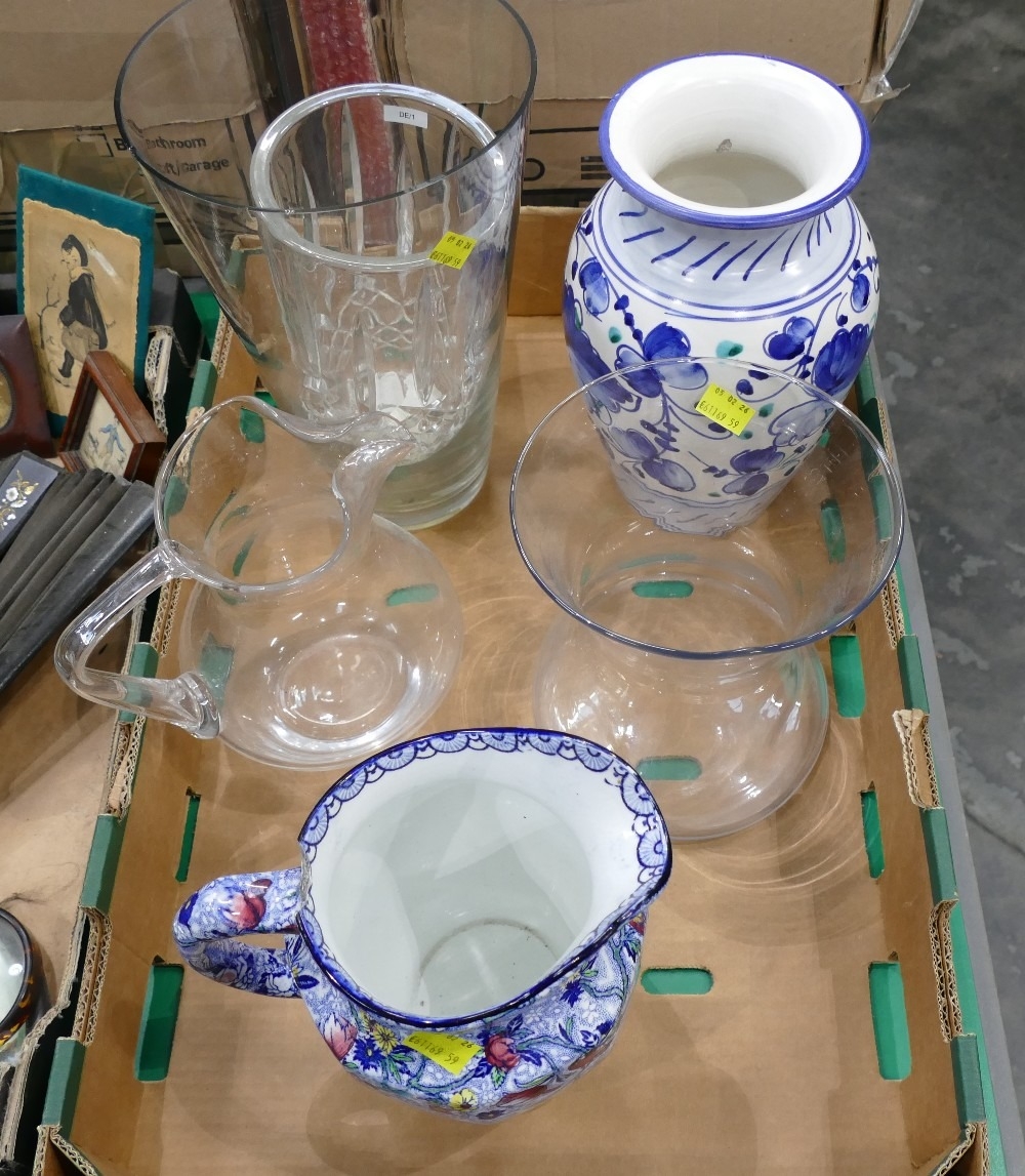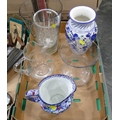 Glass vases, blue and white jugs etc