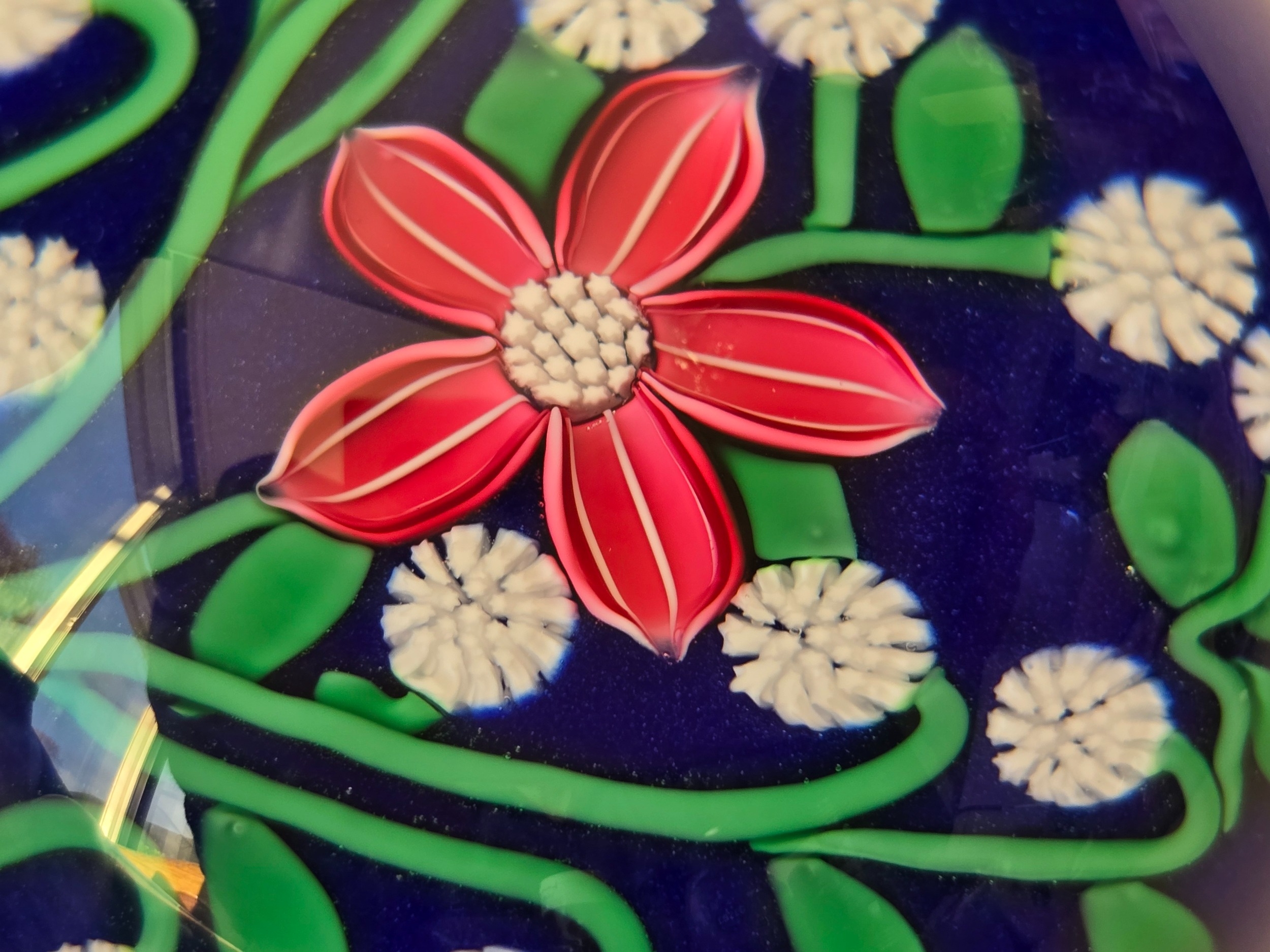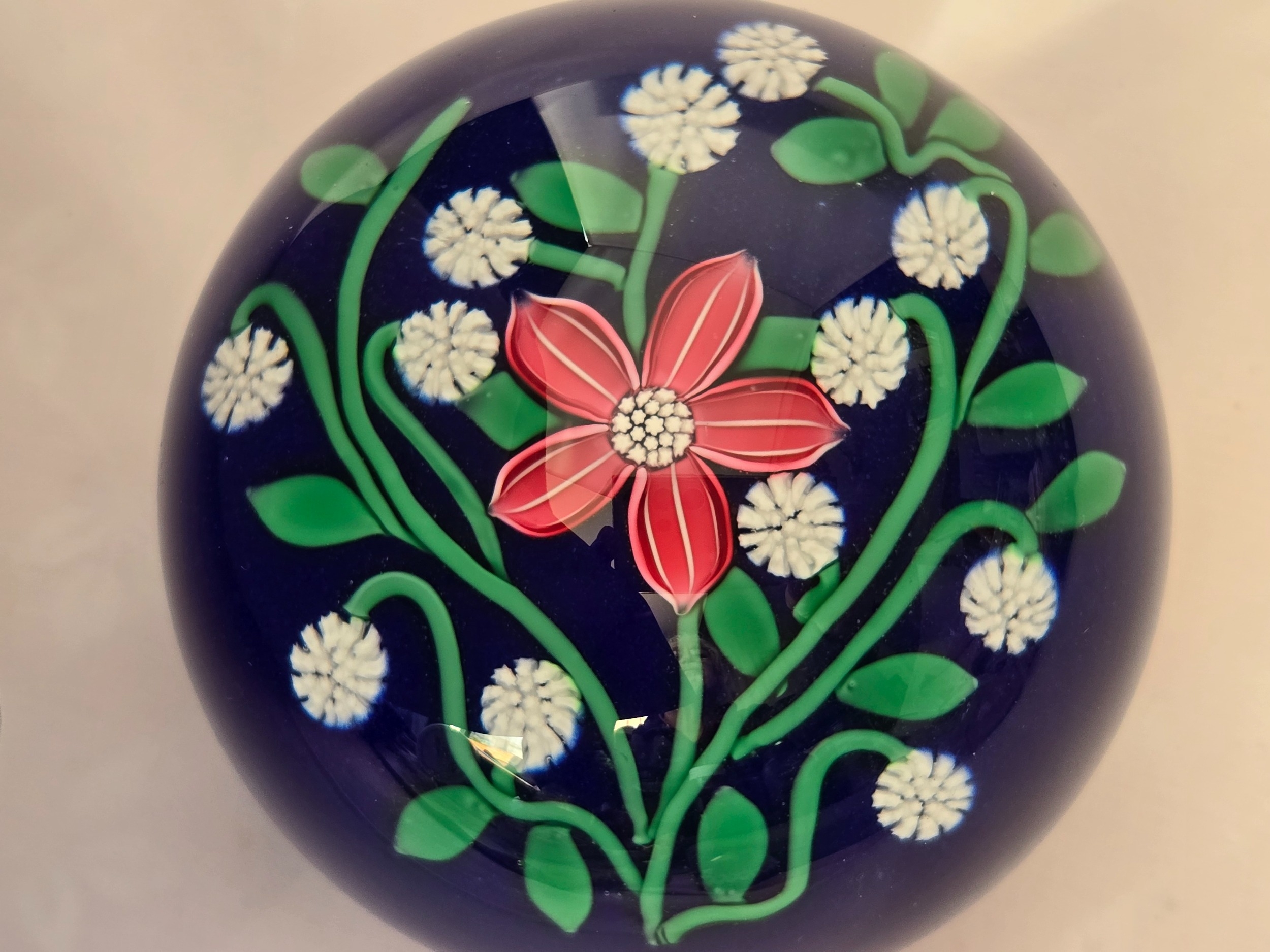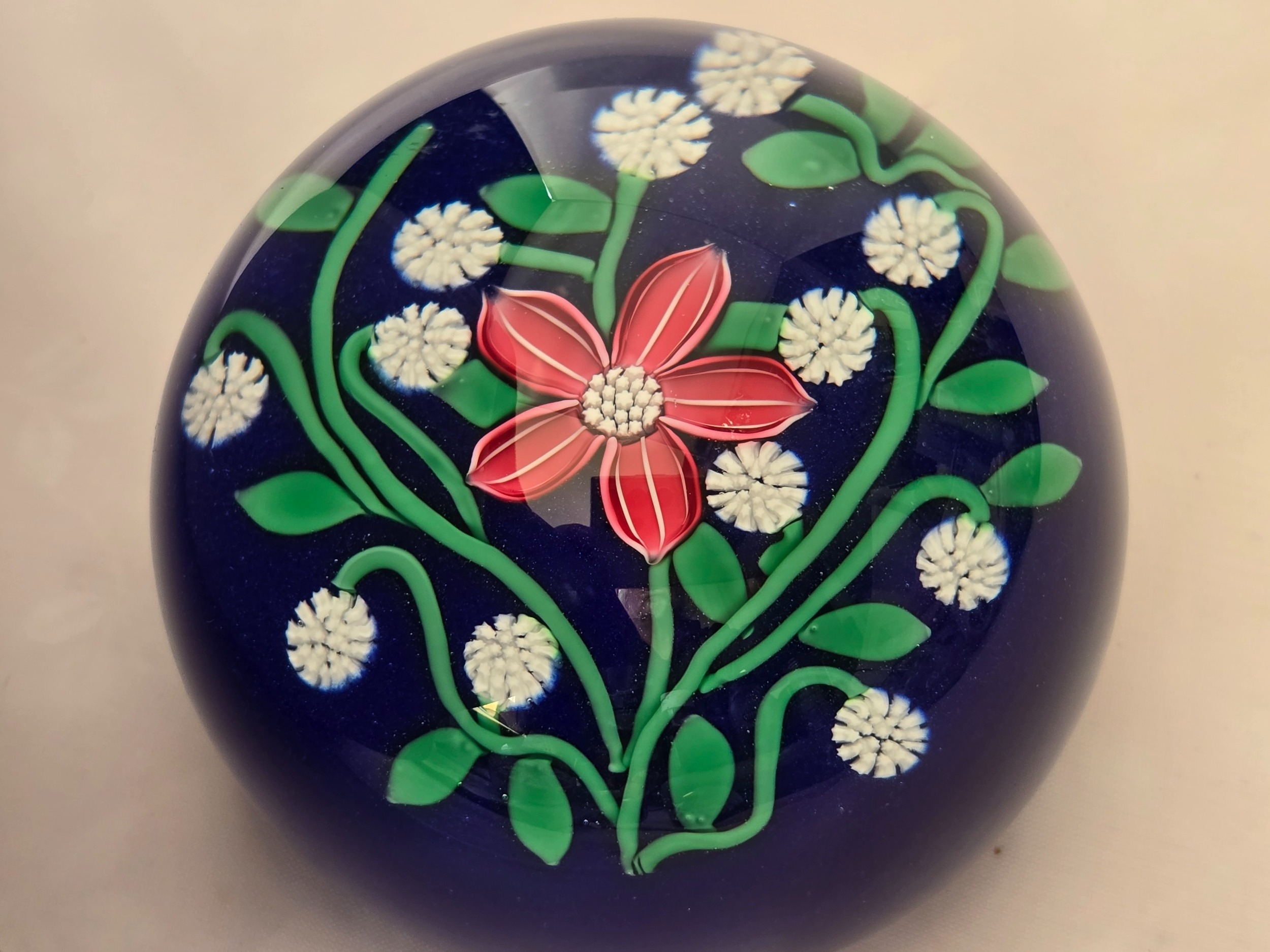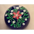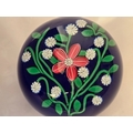 Perthshire paperweight: 2001. Pink flower 7 white florets on blue Excellent condition. 74mm diam. Boxed.