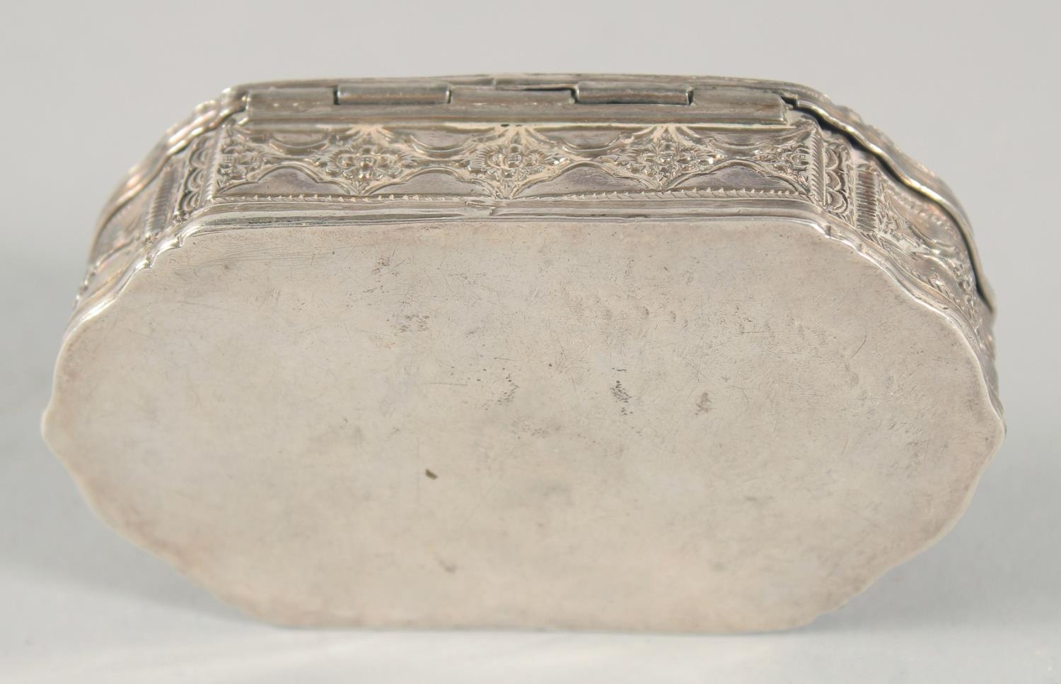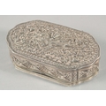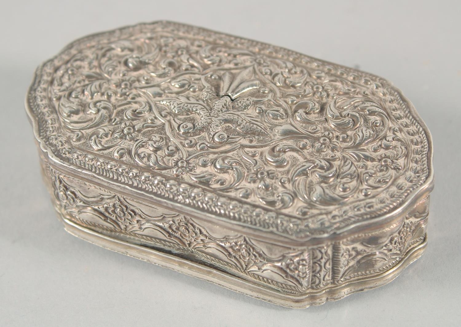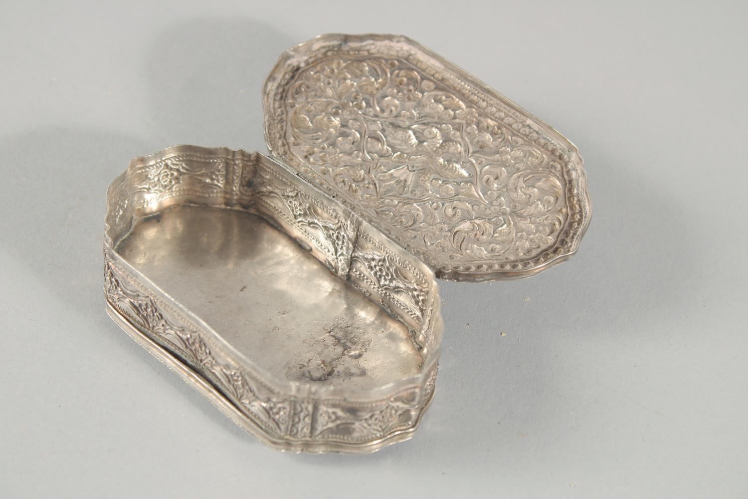 A FINE 19TH CENTURY SRI LANKAN SILVER BOX, with embossed foliate decoration, weight 55g, 9cm x 5cm.