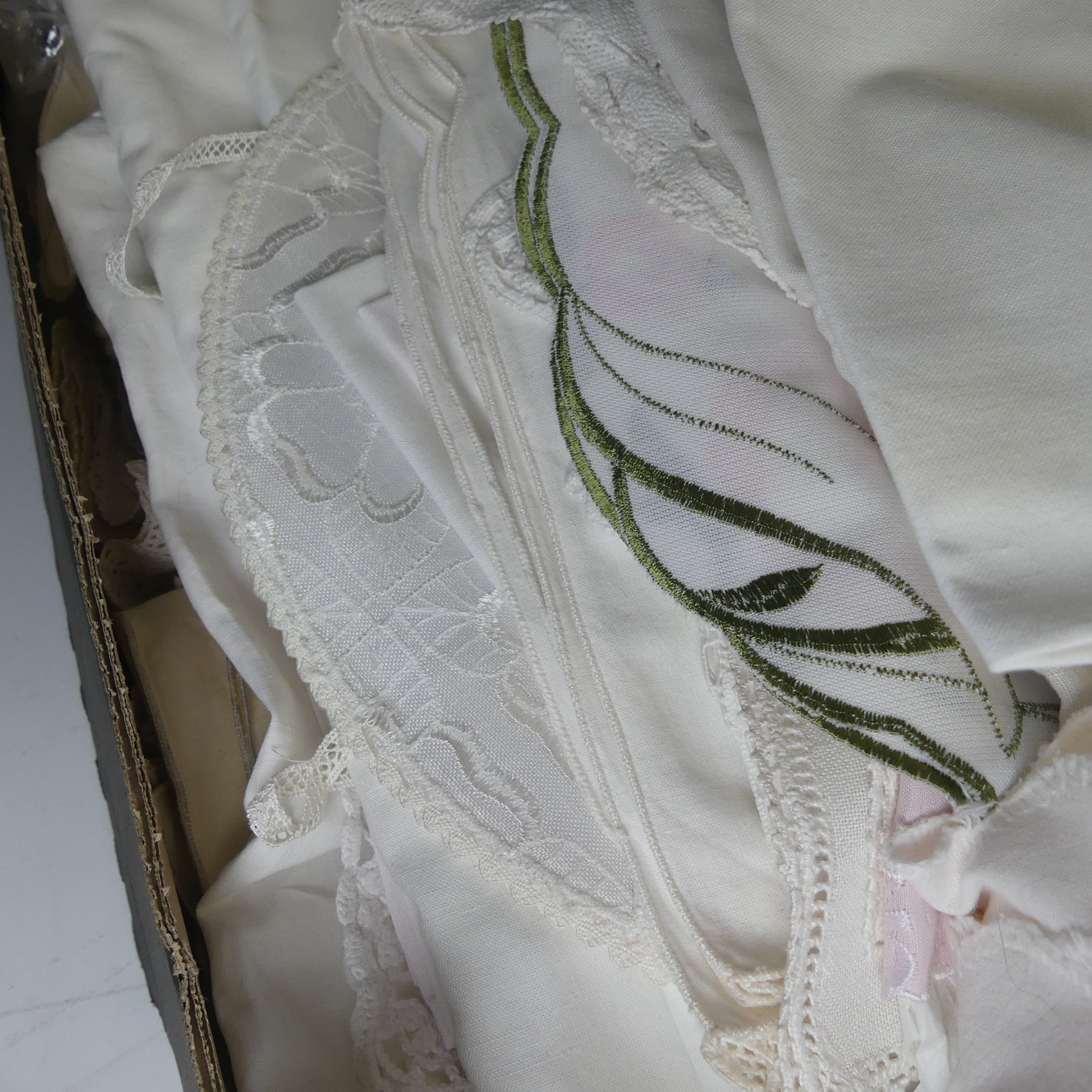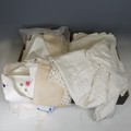 A large quantity of high quality antique and vintage Linens, including a late 19th century linen and crocheted bedcover formed of three long panels, hand-embroidered with dahlias, daffodils, tulips and honeysuckle, with central scrolling monogram 'RB', 248 cm x 235 cm, two other crocheted bed covers, and fine embroidered and crochet-edged table linens, placemats, napkins, etc., all in good condition (a lot)