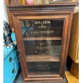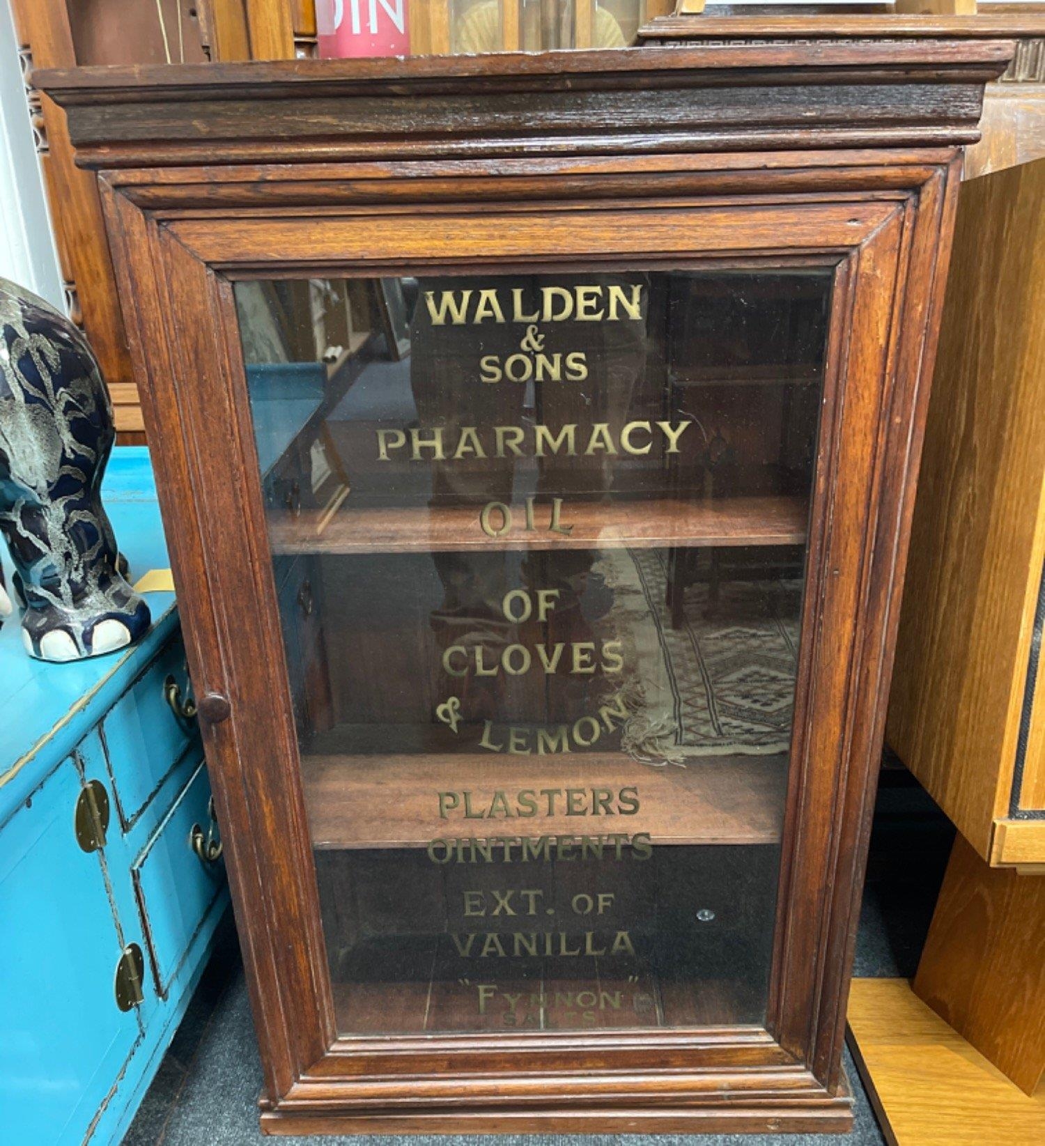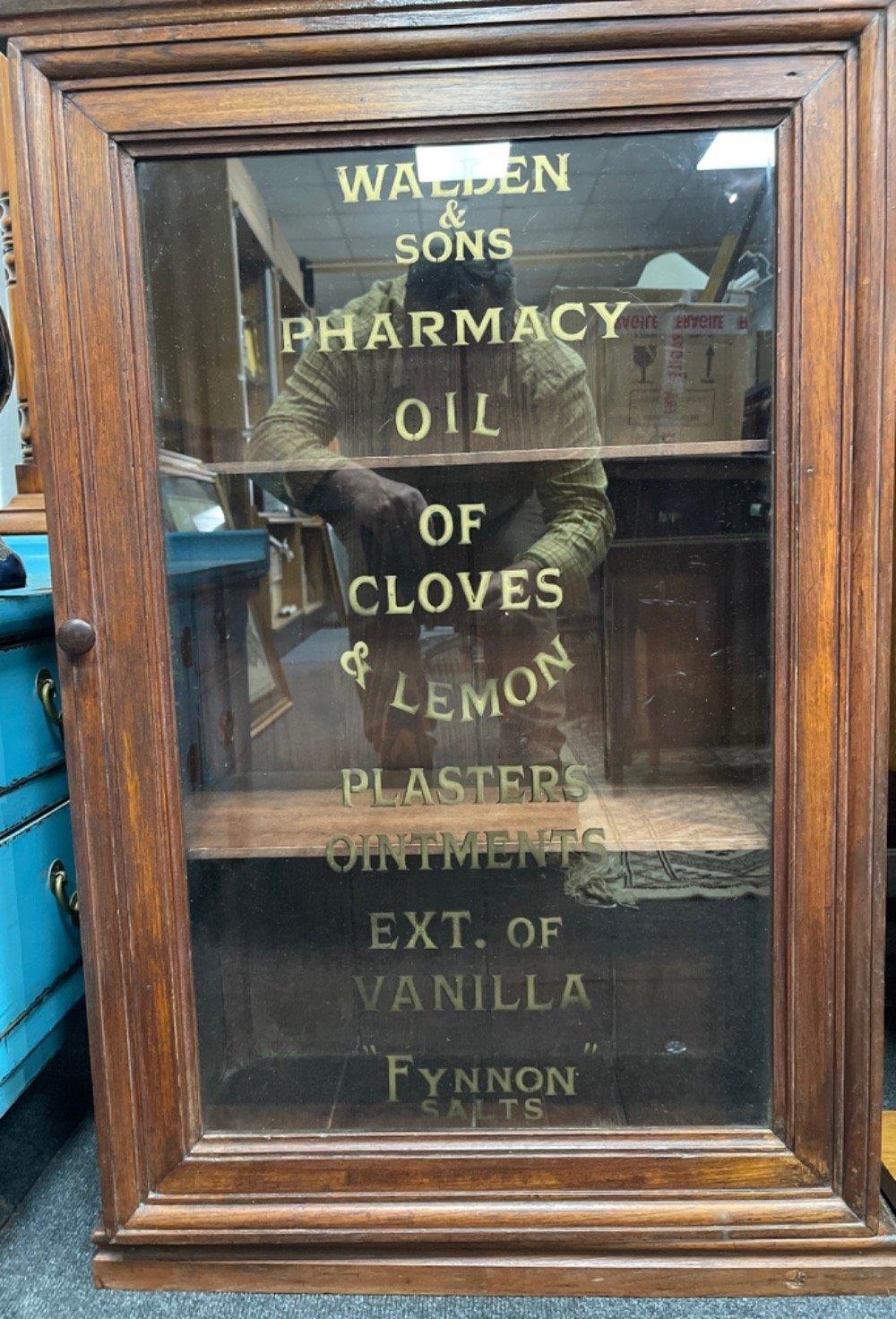 A stunning c1900s PHARMACISTS / Chemists display case/ cabinet. Beautiful gold leaf lettering on the inside of the glass which is in perfect order. WALDEN & SONS PHARMACY Measures 101cm High, 66cm Width, 33cm deep. In lovely condition, a step back in time and a rare find! Lettering mentions Oil of Cloves in Lemon, Plasters, Ointments, Extract of Vanilla, Fynnon Salts.