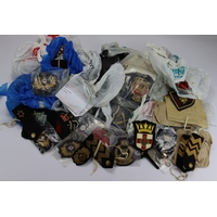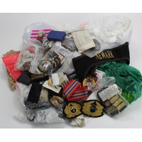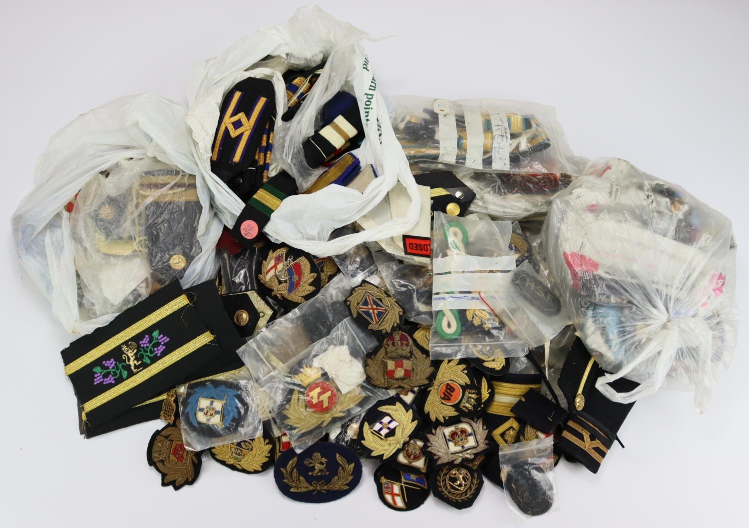 Merchant Navy / Shipping Lines interesting box of officers cloth bullion cap badges, rank insignia, blazer badges, etc. Needs careful viewing. Many items (Qty)