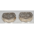 A pair of unusual Victorian silver commode shaped vesta boxes, hinged covers chased with scenes after Classical antiquity, match strikers to bases, 8cm wide, Crichton Brothers, London 1894
