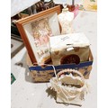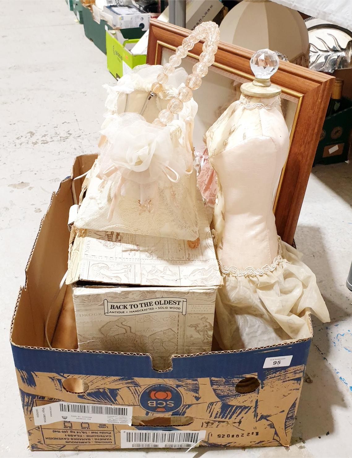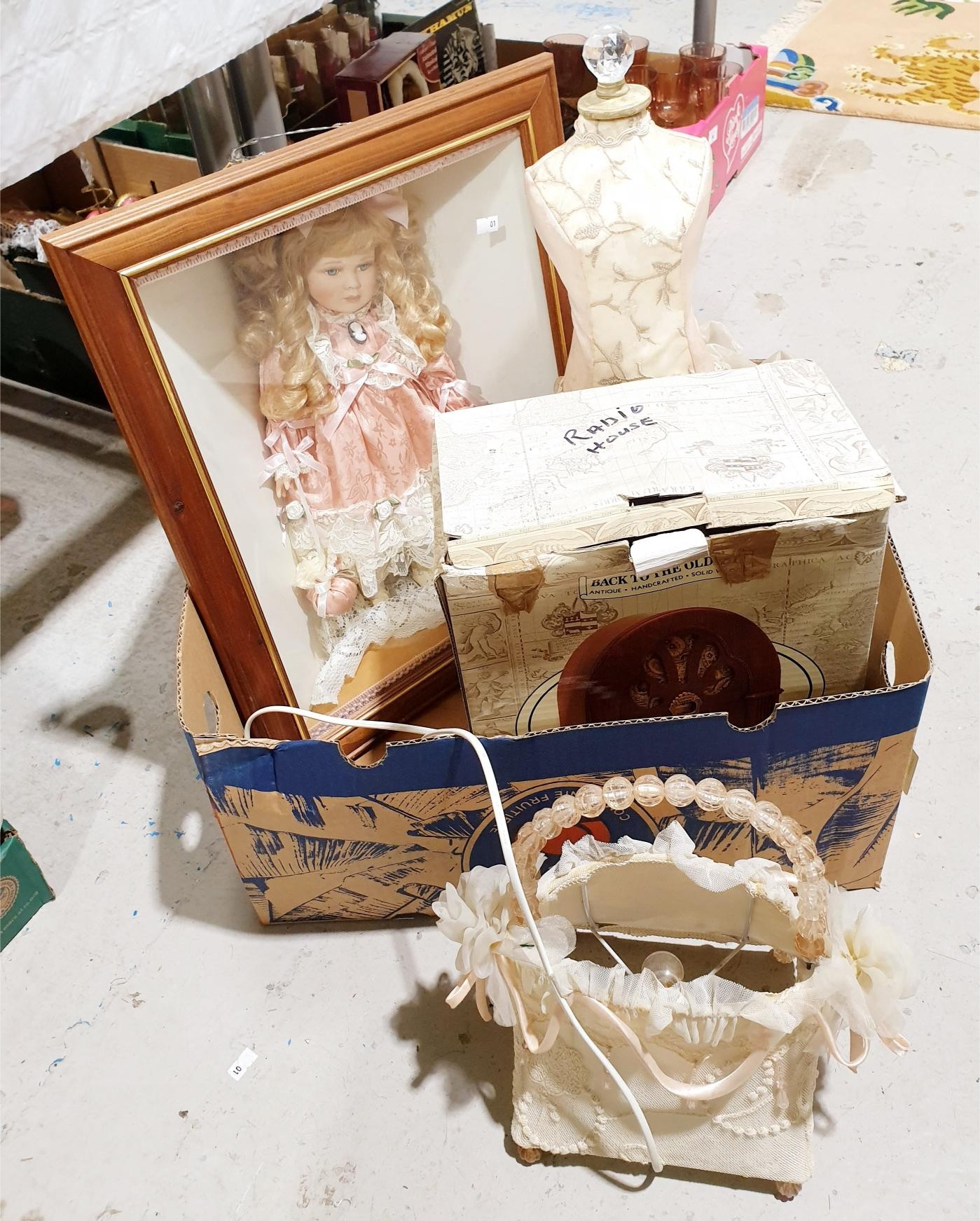 Decorative miniature tailor's dummy, a lamp in the form of a handbag and a cased porcelain doll. No shipping. Arrange collection or your own packer and shipper, please. Electricals are sold as scrap.