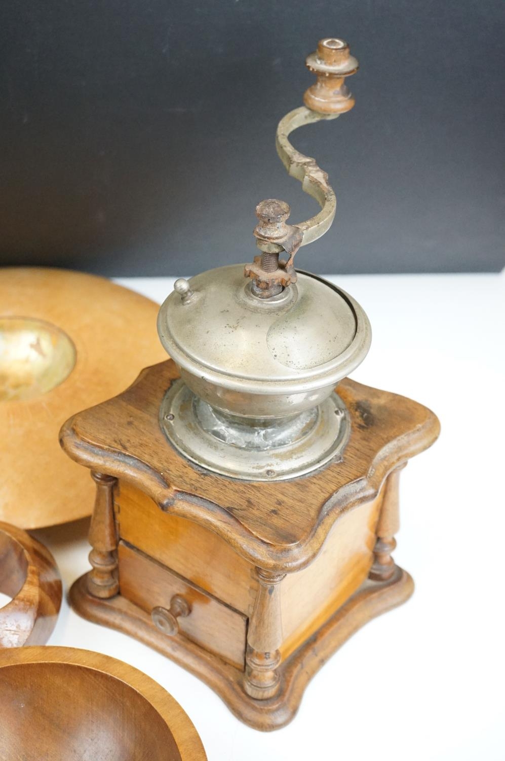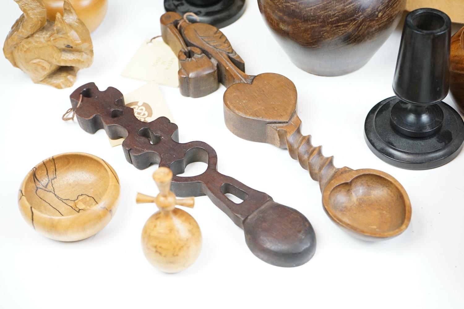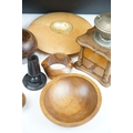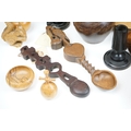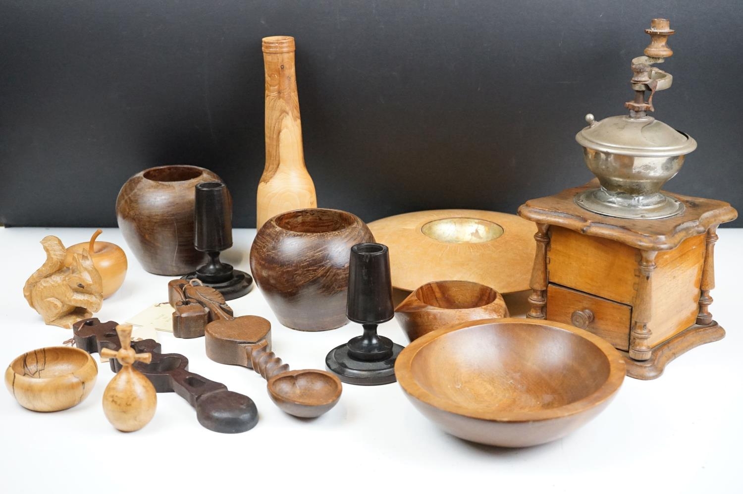 A small group of wooden collectables to include loving spoons, carved ornaments, bowls, coffee grinder...etc.