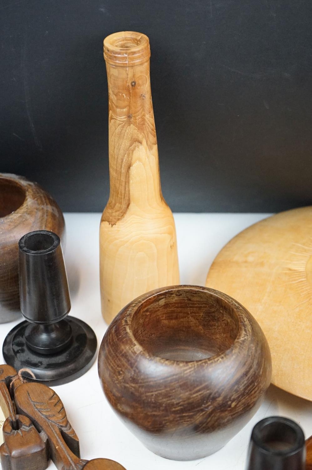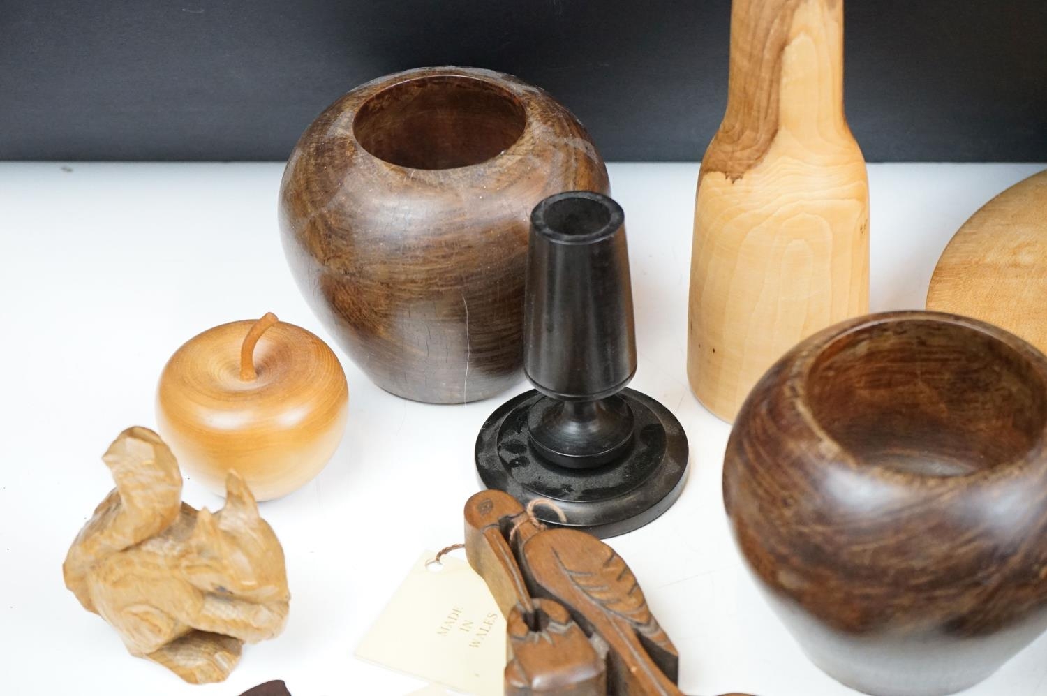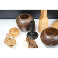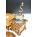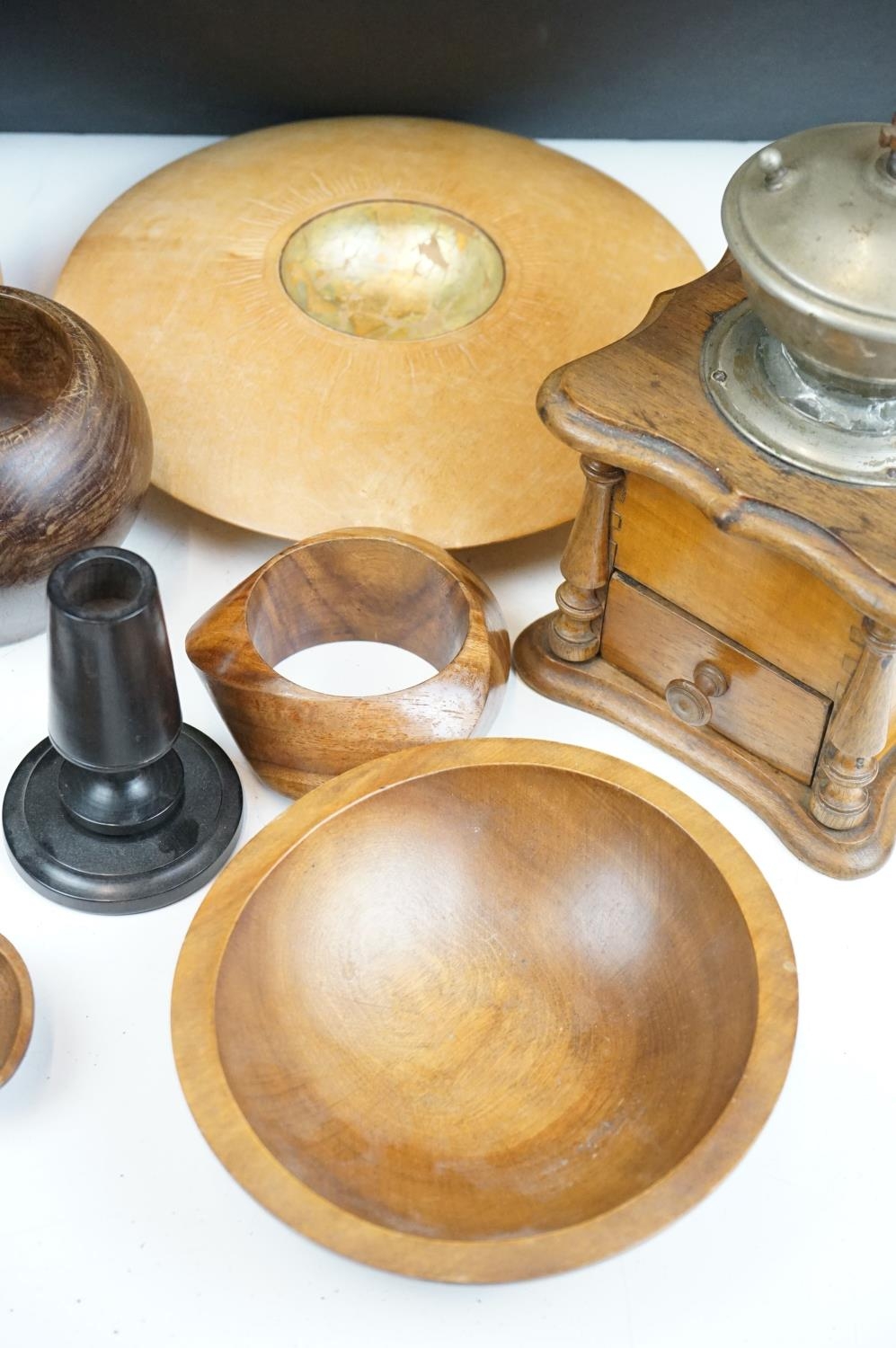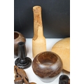 A small group of wooden collectables to include loving spoons, carved ornaments, bowls, coffee grinder...etc.