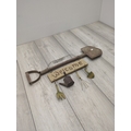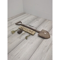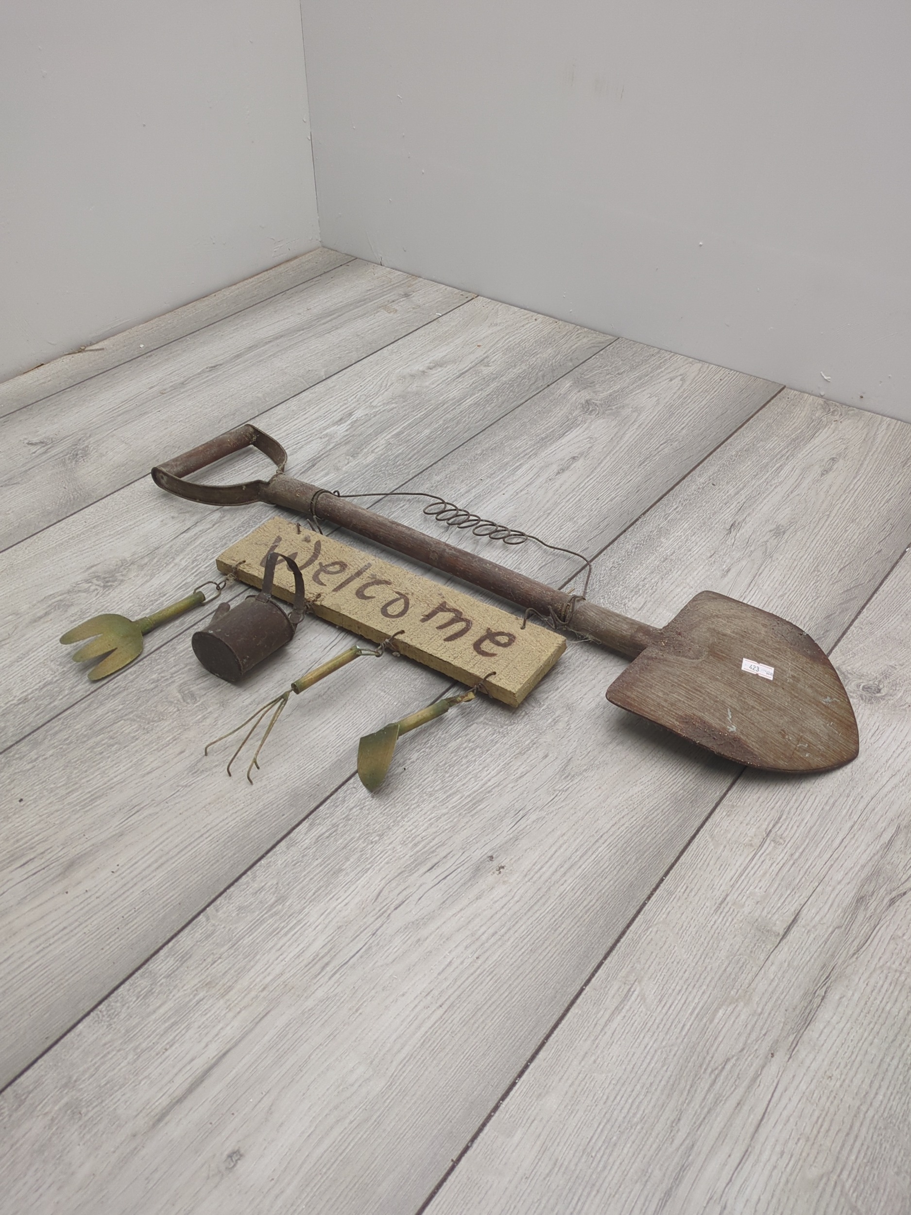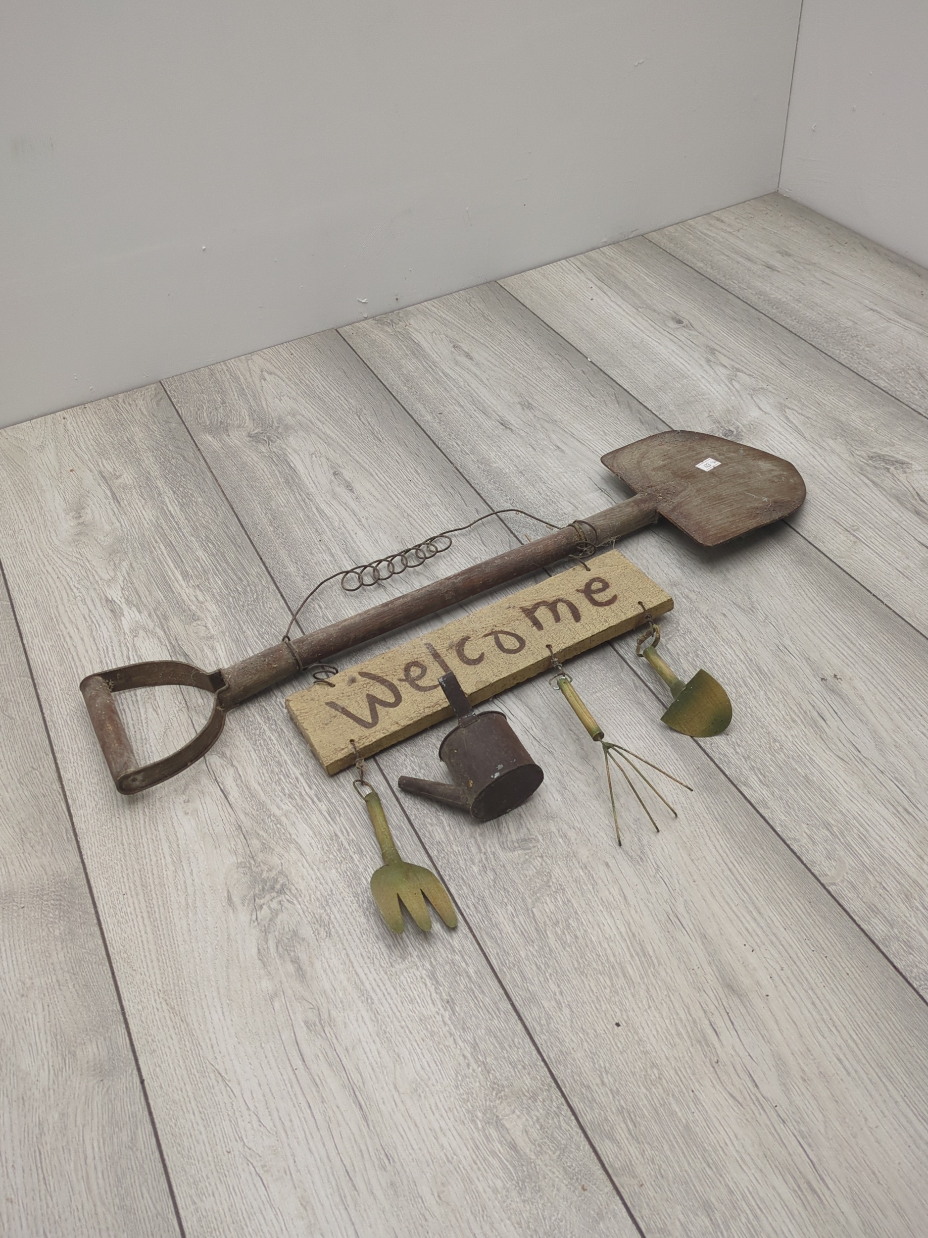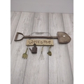 A rustic garden welcome sign featuring a large decorative shovel as the central piece, accompanied by small hanging tools, including a spade, rake, and watering can. The sign has a weathered appearance, enhancing its vintage charm. The word "Welcome" is crafted in a casual, hand-painted style.