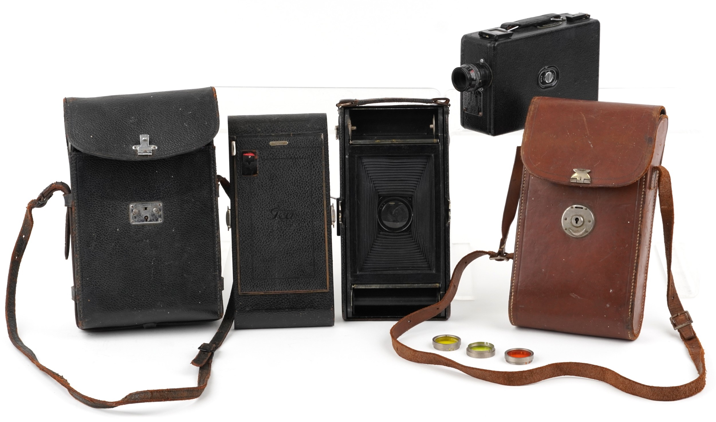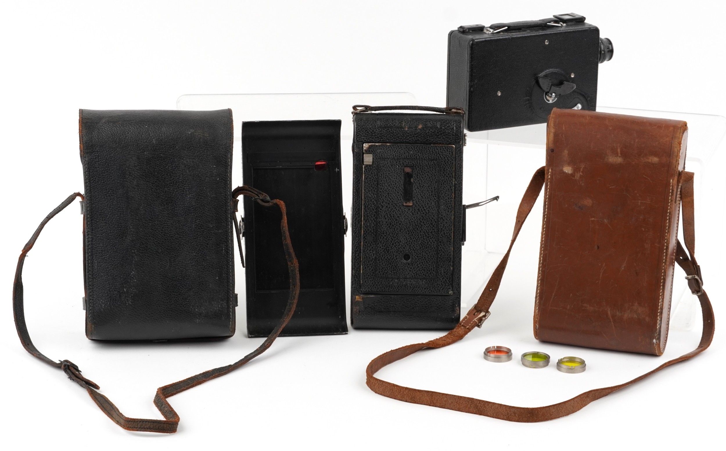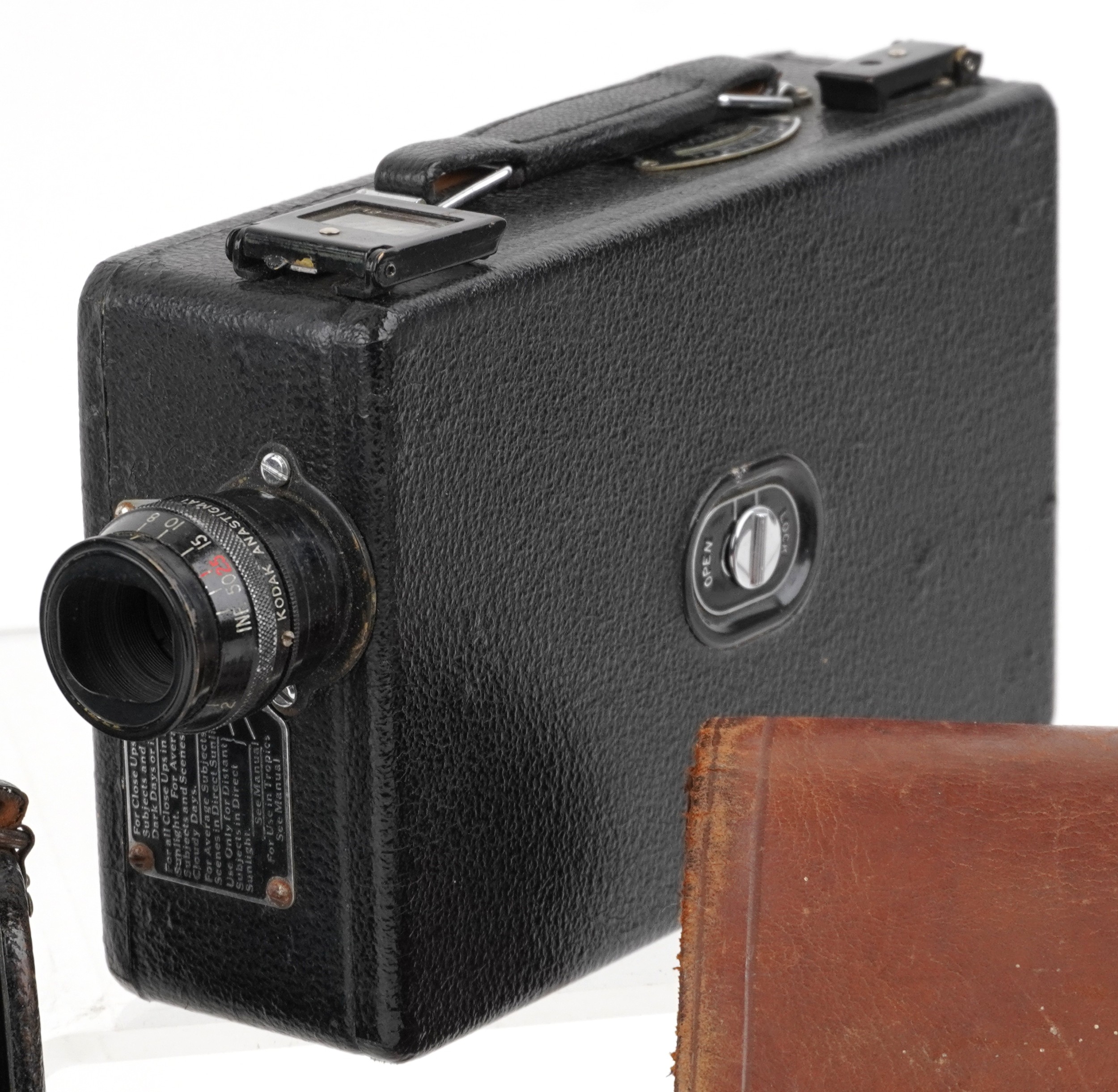 A Ciné-Kodak model BB Junior camera, cased, together with a folding camera within a brown leather case, the largest 16cm wide.