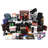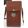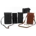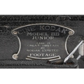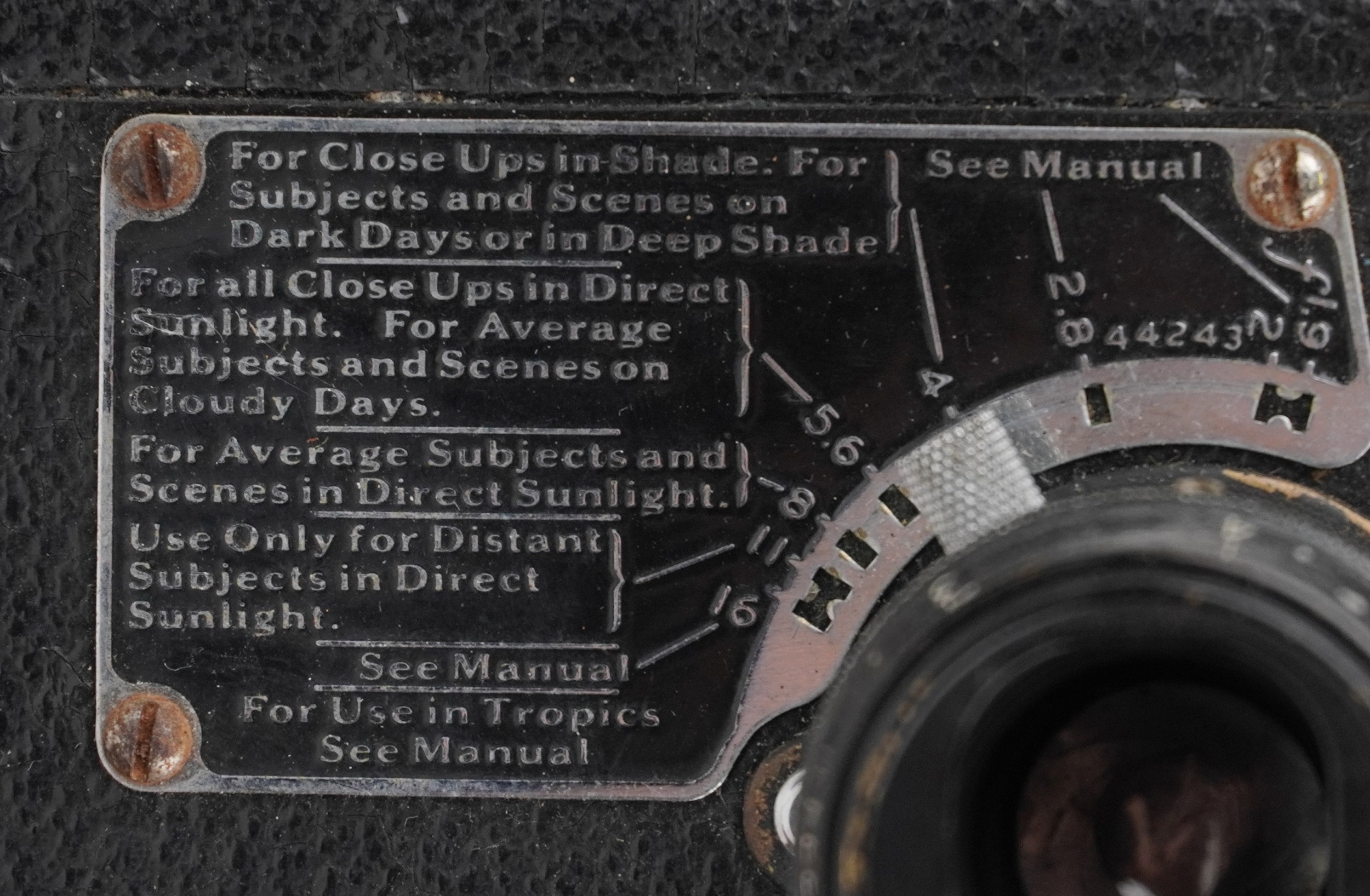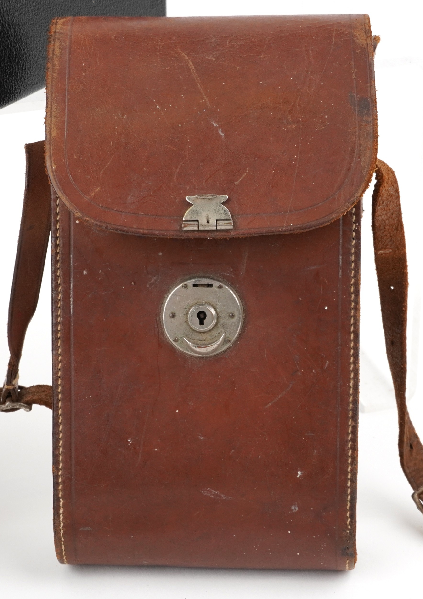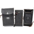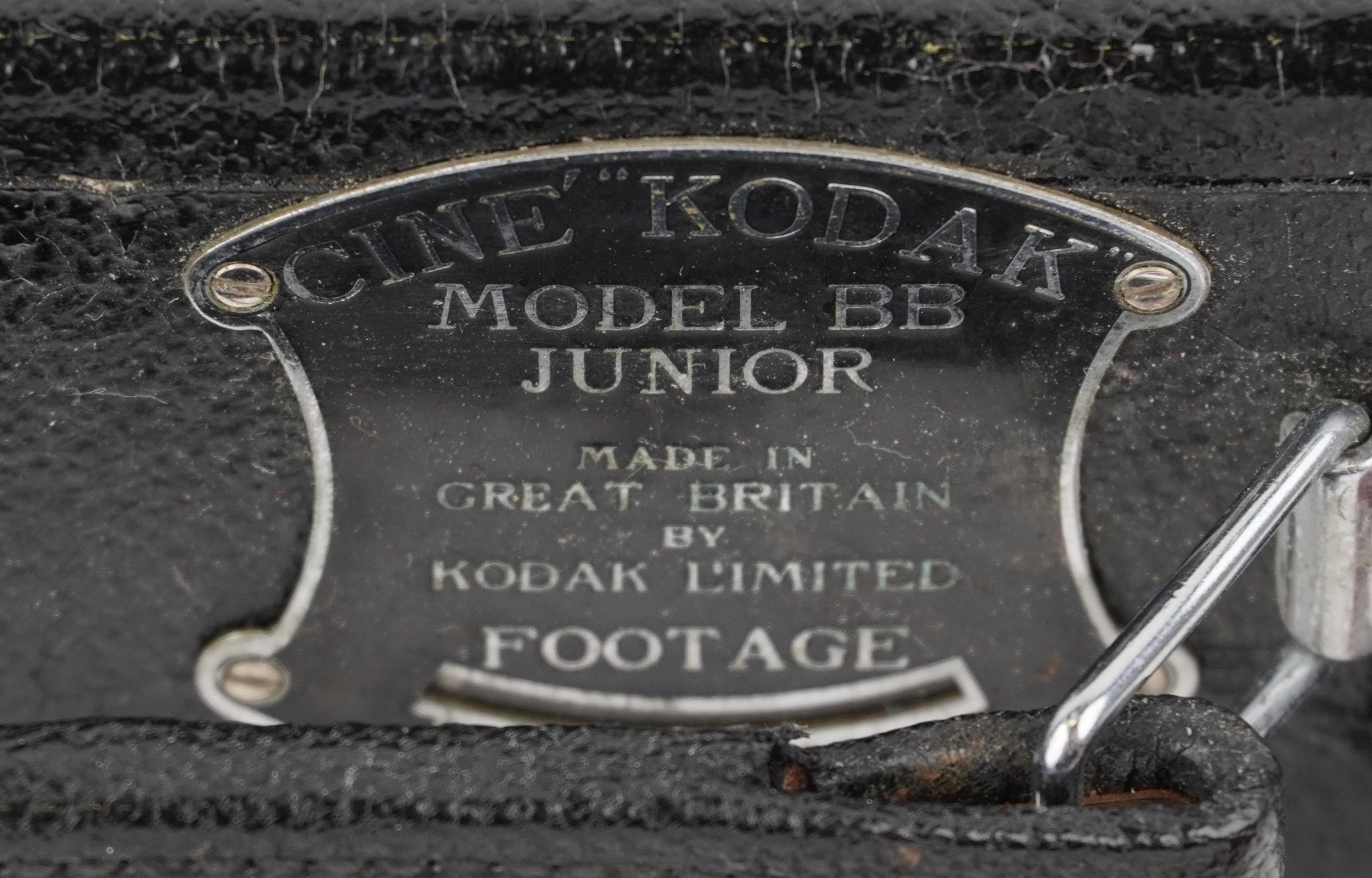A Ciné-Kodak model BB Junior camera, cased, together with a folding camera within a brown leather case, the largest 16cm wide.